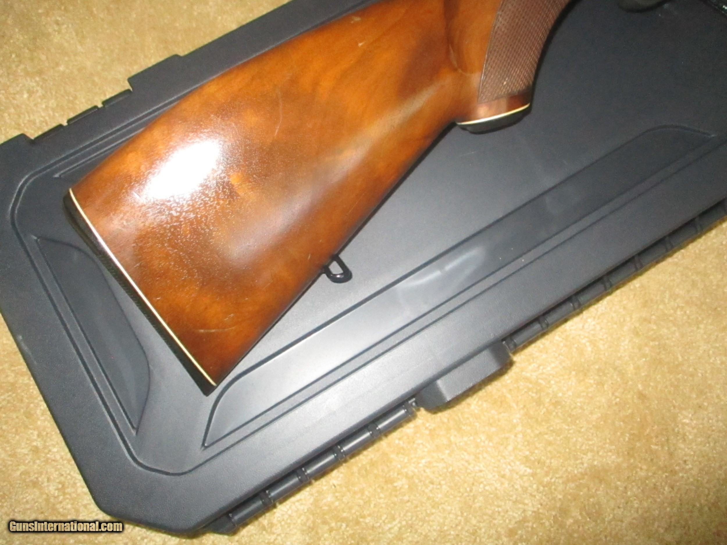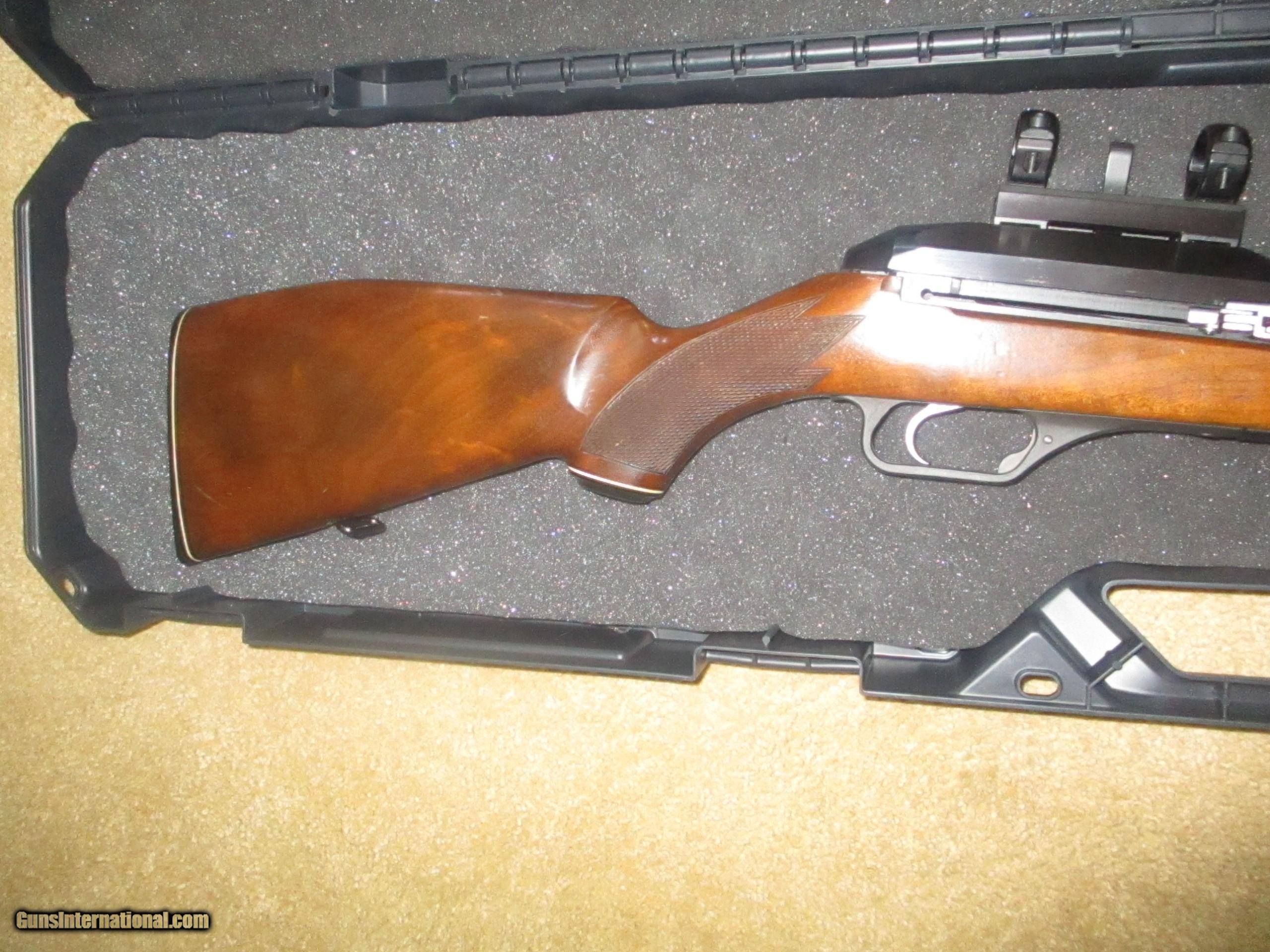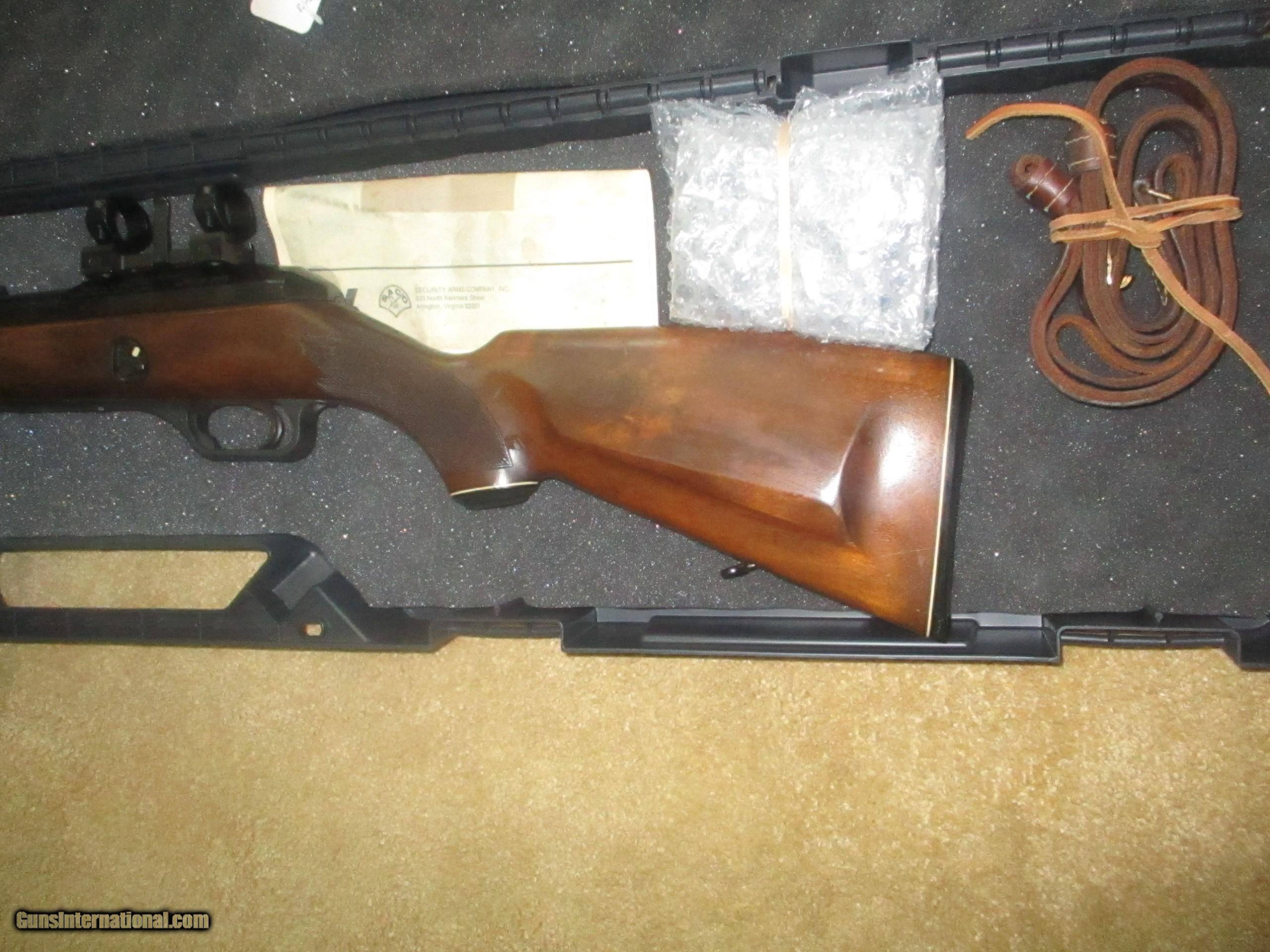 Description: 21.7" bbl. + flashider/muzzlebrake, solid ramp with tall bead, open rear, Q5 quick detatch factory 1" mts., 4rd. also included the elusive 10 factory mag, ( 2 mags), 770 extra desiginates select wallnut with satin gloss finish, Monte Carlo stock, schnoble forend, factory sling swivels, leather sling matching stock, European cheekpiece, checkered factory buttplate, 99% blue, minor handling, shot very little, approved by US Border Patrol, 2nd to no semi-auto rifle ever mfg., also great security piece with the 10 rd. mag., hard case, much pertinate provanance, HK Sporting Arms manual with schmetics: SOLD |