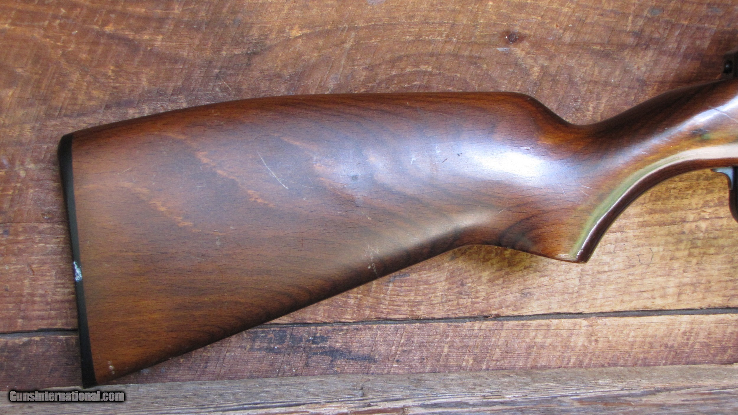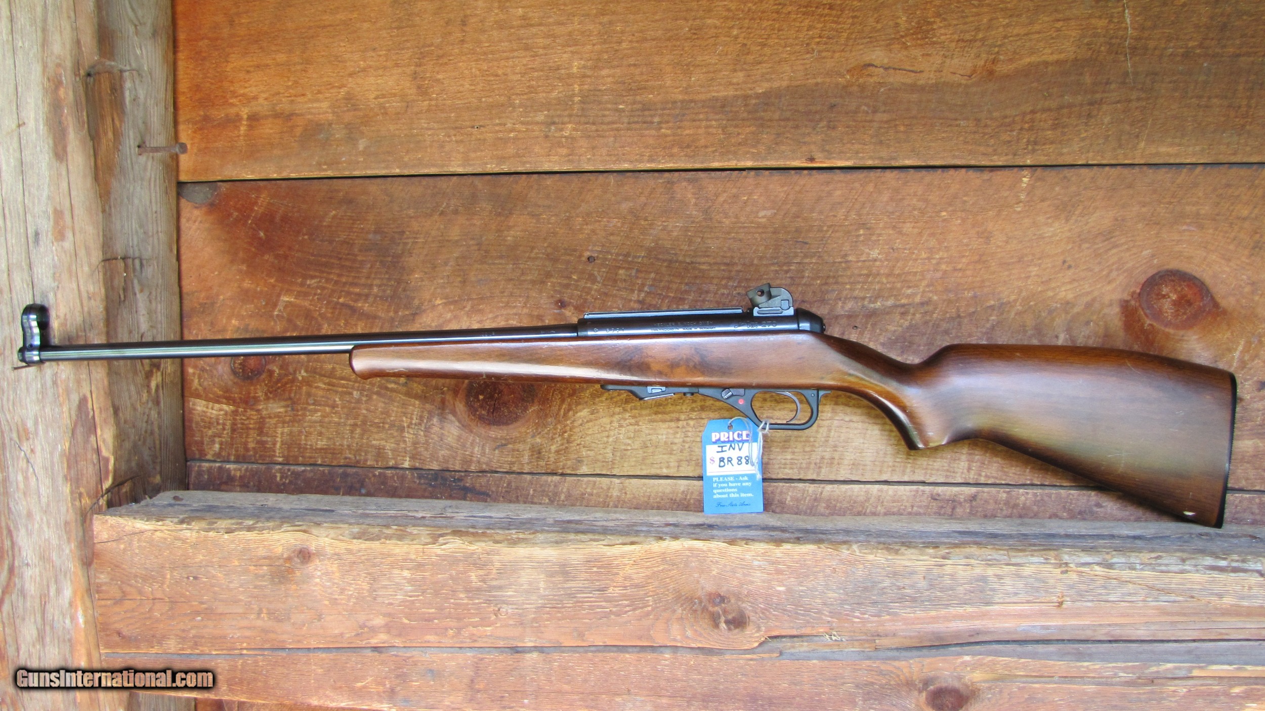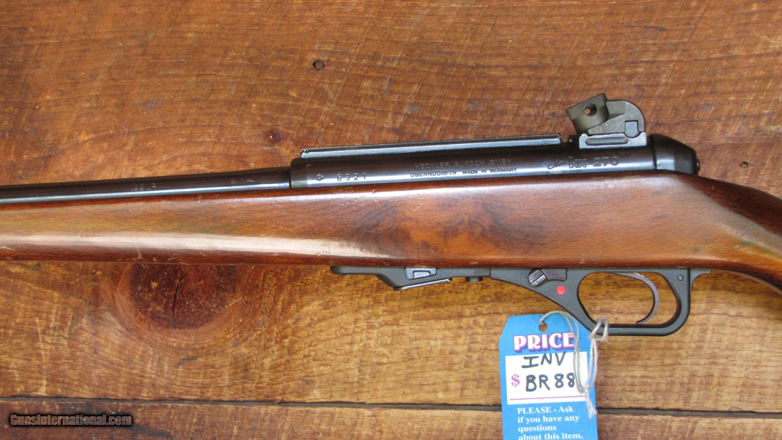 Description: Here is a nice little rifle. It is a Heckler & Koch HK 270 chambered for 22 LR. Great condition but there is a slight bulge in the barrel. Shoots fine, not a safety issue, but it is there, so we mention it. Makes a fun shooter. There are some scratches on the wood forend. We are required to charge 5.5% tax for Maine residents and 8.25% for Texas residents. There is a 3.5% fee if paying by credit card. SOLD Rifle Caliber: .22 Long Rifle Manufacturer: Heckler & Koch Model: HK 270 Serial Number: 6321 Condition: Very Good Metal Condition: Very Good Wood Condition: Good Bore Condition: Good |