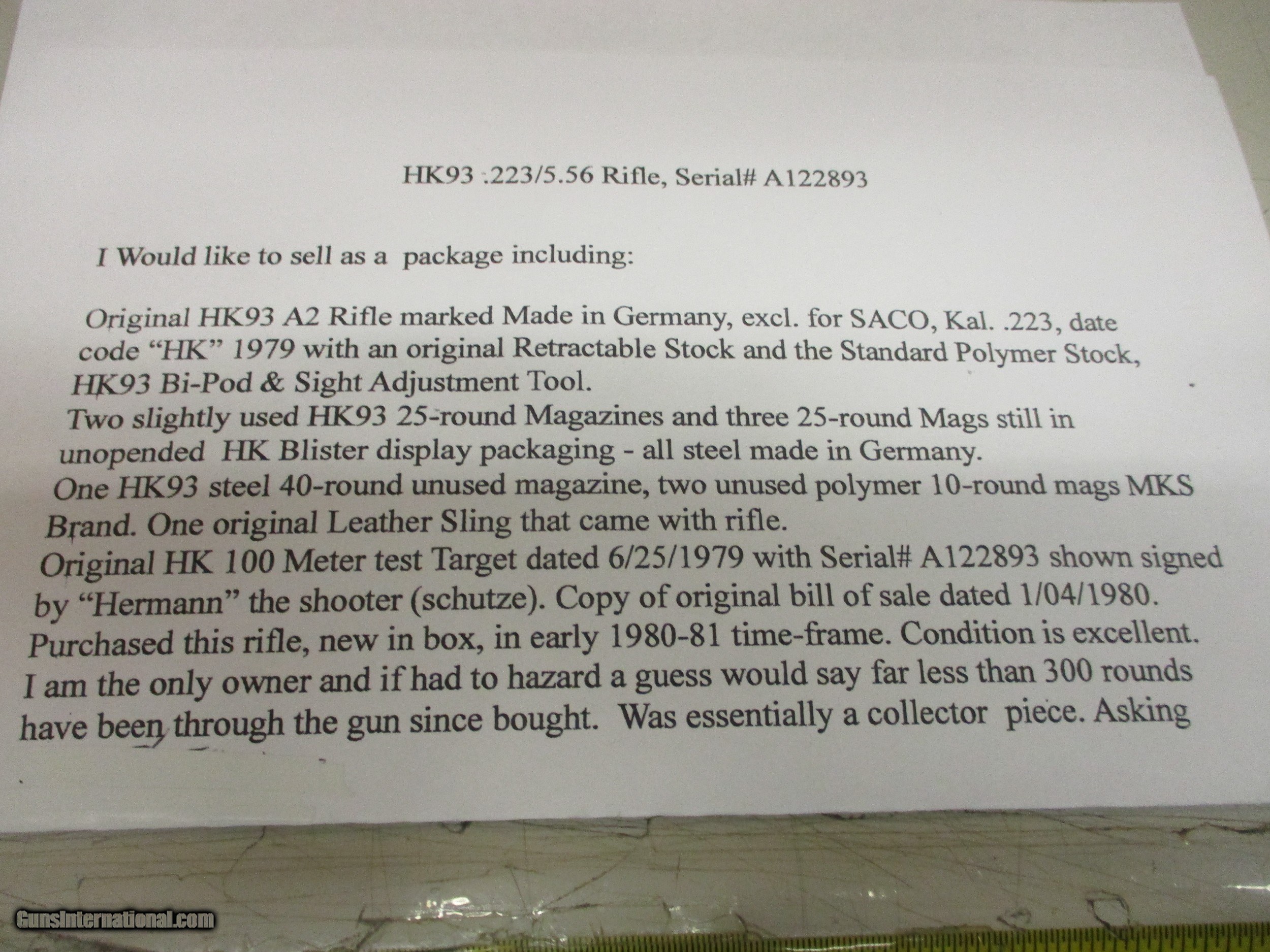 Description: CONSIGNMENT USED VERY GOOD CONDITION HECKLER & KOCH HK93 .223 -- 16.25" BARREL -- BLK PLASTIC BUTTSTOCK & FOREND V & APERTURE REAR SIGHT, POST FRONT SIGHT SEE ACCESSORIES LISTED BELOW IN PICTURE #10 BELOW ****PLEASE CALL IN THE WITH THE SELLER’S INVENTORY NUMBER IF INQUIRING ABOUT A FIREARM****** WE DO NOT SHIP FIREARMS AND/OR FIREARMS’ PARTS OUT OF THE 50 UNITED STATES, SO DON’T ASK—YOU NEED TO KNOW IF FIREARM IS LEGAL FOR YOUR STATE PRICE REFLECTS PAYMENT BY MONEY ORDER / CASHIERS CHECK. A 3% PREMIUM IS ADDED FOR CREDIT CARDS. WE DO ACCEPT PERSONAL OR BUSINESS CHECKS, BUT THERE IS A GRACE PERIOD OF 10 BUSINESSS DAYS ON THEM. Shipping is $40 for handgun and $30 for long gun. Shipping to Alaska and Hawaii will be more based on weight of firearm. USPS SHIPPING IS HIGHER. WE DO OFFER LAYAWAY PLANS FOR 30,60, OR 90 DAYS. THERE IS A $5.00 CHARGE FOR EVERY 30 DAYS ITEM IS ON LAYAWAY. WE ALSO REQUIRE A 20% DOWN PAYMENT ON TOTAL OF LAYAWAY SALE. LAYAWAYS ARE NON- REFUNDABLE. HERE IS HOW THIS PROCESS WORKS. YOU WOULD CALL US AT 540-337-9218 WITH LISTER # TO PURCHASE THE GUN. THEN ONCE I HAVE RECEIVED PAYMENT AND AN FFL (FEDERAL FIREARMS LICENSE) FROM A LICENSED DEALER IN YOUR AREA OF YOUR CHOICE. WE WILL THEN SHIP THE GUN TO THEM. YOU WOULD THEN PICK UP THE GUN AT YOUR LOCAL DEALER AND DO PAPER WORK THERE. Please have your FFL Dealers contact information when you call. DOMINION OUTDOORS 15 ANGELA COURT FISHERSVILLE, VA 22939 540-337-9218 540-337-2422 fax M – F 9 a.m. to 6 p.m. ETZ Sat 9 a.m. to 4 p.m. ETZ ****PLEASE CALL IN THE WITH THE SELLER’S INVENTORY NUMBER**** ***PLANO SINGLE RIFLE HARD CASES AVAIABLE FOR PURCHASE $25.00 WITH THE PURCHASE OF A FIREARM** *** Online prices compared to in store prices will vary. *** SOLD |
