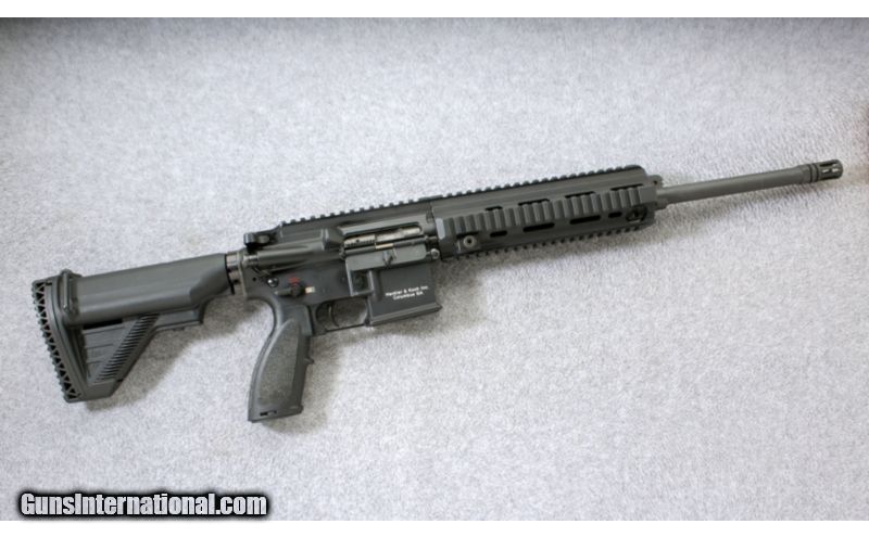 Description: A direct descendent of the HK416, the Heckler & Koch MR556A1 is a semi-automatic rifle developed as a premium level commercial/civilian firearm with match rifle capability. Like the HK416, the MR556A1 is a major product improvement over conventional AR-type carbines and rifles.The MR556A1 uses the HK proprietary gas piston operating system, employing a piston and a solid operating “pusher” rod in place of the gas tube normally found in AR15/M16/M4-style firearms. This method of operation virtually eliminates malfunctions that are common to direct impingement gas systems since hot carbon fouling and waste gases do not enter the receiver area. This is the same key feature critical to the success of the HK416 rifles used by leading military and law enforcement customers. SOLD Caliber Info: 5.56x45mm NATO Metal Condition: As new Bore Condition: As new Barrels: 16 1/2 inch German made hammer forged barrel with 1:7 inch twist Triggers: Two stage trigger Stock: Telescoping stock Stock Dimensions: Adjustable for LOP Fore End: Free floated with quad rail system Weight: 8 lbs. 1 oz. without magazine Sights: Picatinny rail for mounting optics Extras: Factory box Item Location: Lehi, UT |