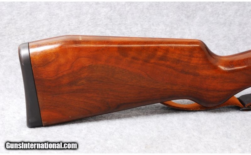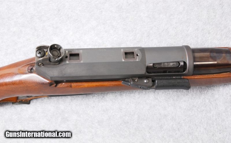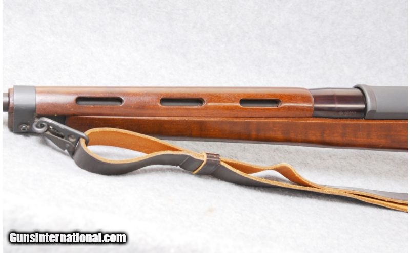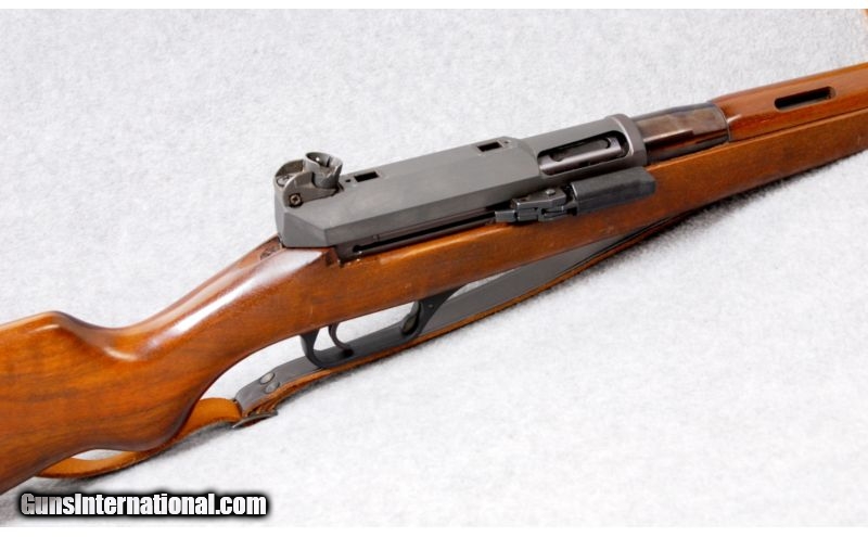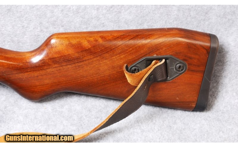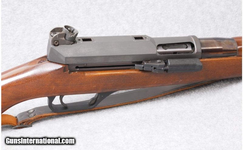 Description: SOLD Caliber Info: .223 Remington. Metal Condition: Blued barrel and gray receiver, right-side, folding bolt handle and intregral scope bases. Wood Condition: Very good. Bore Condition: Excellent. Barrels: 19" barrel. Triggers: Serrated. Stock: Dark walnut, two piece, stock, European style Monte Carlo, plain pistol grip, and left-side sling attachments. Stock Dimensions: LOP: 14". Fore End: Plain fore end no checkering. Butt Pad: Steel butt plate. Sights: Circle and post front sight and round dial style rear sight. Extras: Has a drop-out magazine. Item Location: Woodbury, MN |