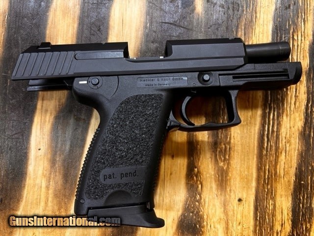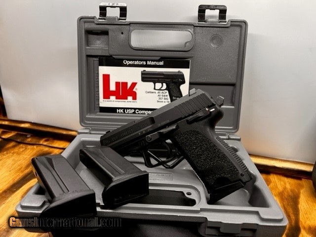 Description: Guns Listing ID: 845055 Preowned EUC. Comes with everything pictured The HK USP (Universal Self-loading Pistol) is an accurate and ultra-reliable handgun. It utilizes a fiber-reinforced polymer frame stiffened by stainless steel inserts at areas subject to stress and friction. The control lever, a combination safety and decocking lever, is frame mounted and quickly accessible, unlike the slide-mounted safeties. The modular design of the USP‚‚s internal components allows the control lever function to be switched from the left to the right side of the pistol for left-handed shooters. The USP Compacts are smaller and lighter than large frame USPs. The reduction in trigger reach and grip circumference increases concealability and enhances shooting ergonomics. It utilizes a narrow, full-hand grip frame with a choice of interchangeable extended or flush-fitting magazine floorplates. The USP Compact features a polygonal bore barrle, one-piece steel slide with contoured, extended release, bobbed hammer, universal mounting grooves, and ambidextrous magazine release lever. This V1 model has a black frame with blued slide, captive recoil spring assembly with polymer absorber bushing, night sights, and comes with three 8-round magazines. Type: Pistol Action: SA/DA Caliber: 45 ACP Barrel Length: 3.78\" Capacity: 8+1 Safety: Manual, Decocker Grips: Black Polymer Sight Configuration: Night Weight: 28.16 oz Frame Finish: Black Frame Material: Polymer Barrel Type: Polygonal Rifled Slide Description: Serrated Black Steel Sight Style: Night Barrel Length Range: 3.00\" to 3.99\" Weight Range: 16.00 oz to 31.99 oz SOLD Manufacturer: HECKLER & KOCH Model: USP45C Caliber Info: .45 ACP Condition: Used - Non-Certified Barrels: 3.8 BARREL |