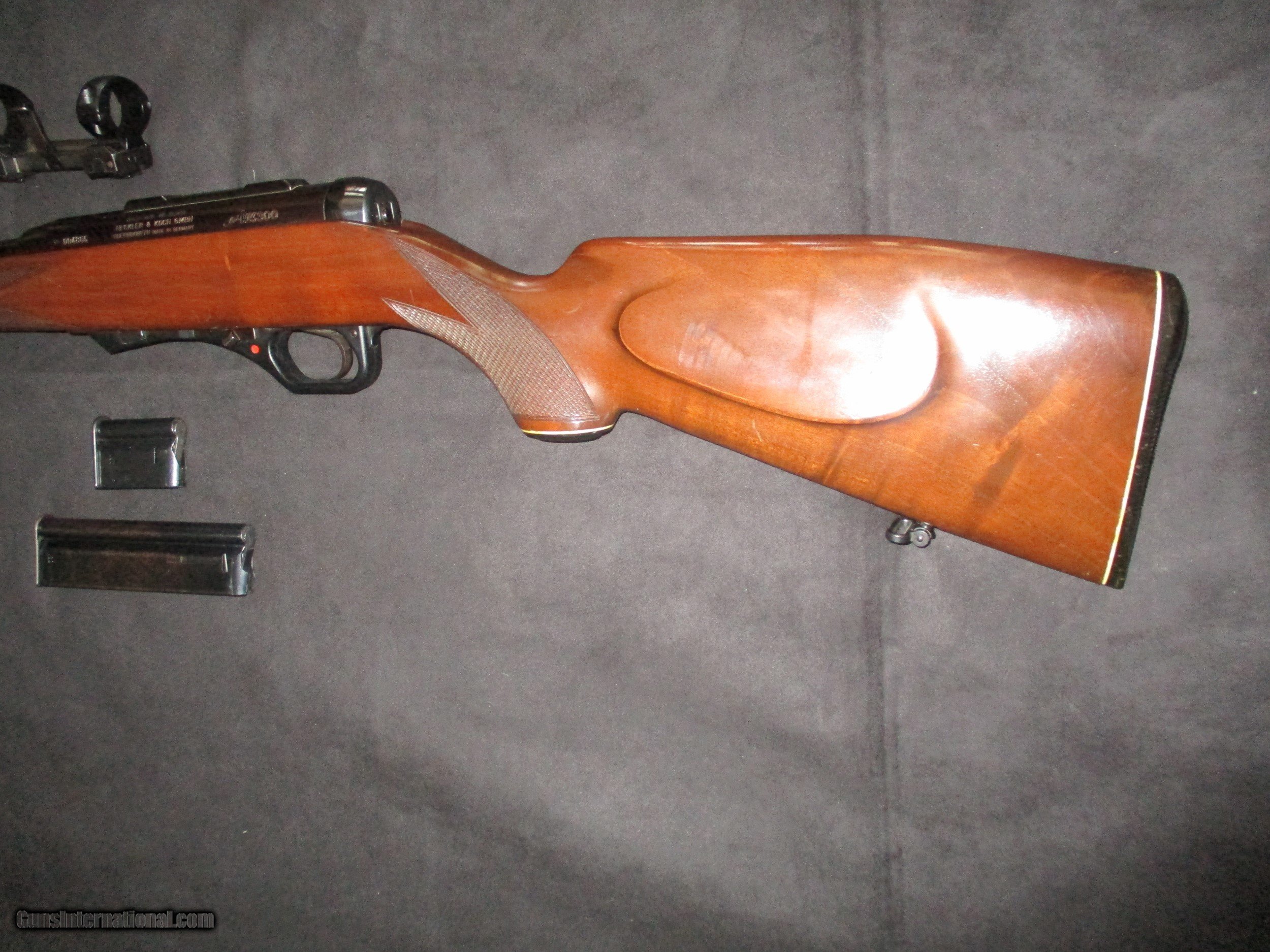 Description: 19.7" bbl., Polygonal rifling, checkered Euro style deluxe walnut stock, detetchable trigger housing, quick detatchable H&K '05 mounts, 5rd. mag. also 15 rd. mag., 98% blue, lightest of handling, SOLD |