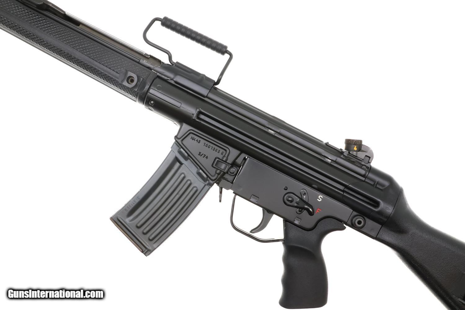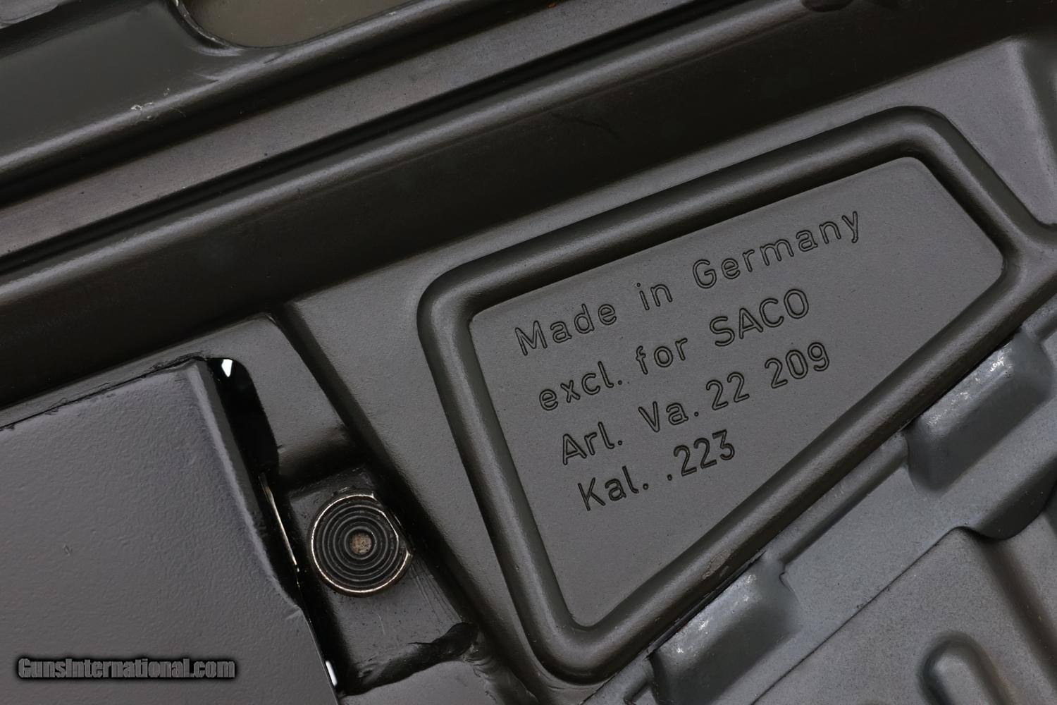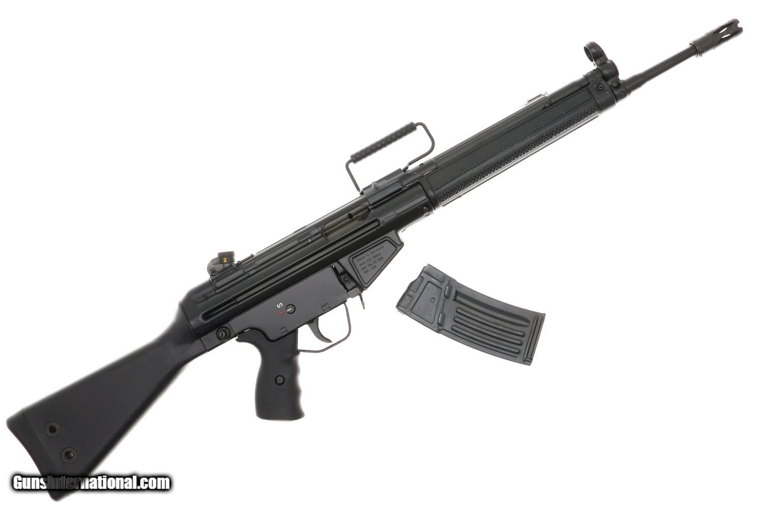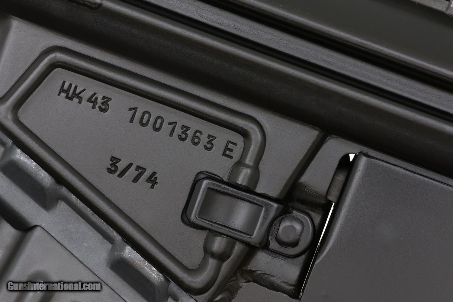 Standard configuration HK 43 semi-automatic rifle, cal. .223, SN: 1001363E, predecessor to the H&K 93, created 1974 with approximately 200 imported to U.S. Features include a 16 inch barrel with attached flash hider, post front sight and drum/height adjustable rear sight, black synthetic furniture including pistol grip and fixed buttstock with dual sling attachment points on left side, complemented by a carrying handle. Receiver markings include "HK 43 1001363 E 3/74" on the left side and "Made in Germany excl. for SACO Art. Va. 22 209 Kal. .223" on the right side. Standard, unmarked, 30 round steel magazine. The HK43 is the predecessor to the Heckler & Koch 93 semi-automatic rifle, specifically designed for sale to conscripts to familiarize them with their service rifle before entering military service, a common practice in Germany and Switzerland. RESTRICTED AS ASSAULT WEAPON WITH HIGH CAPACITY MAGAZINE. WILL NOT SHIP TO RESTRICTED STATES.