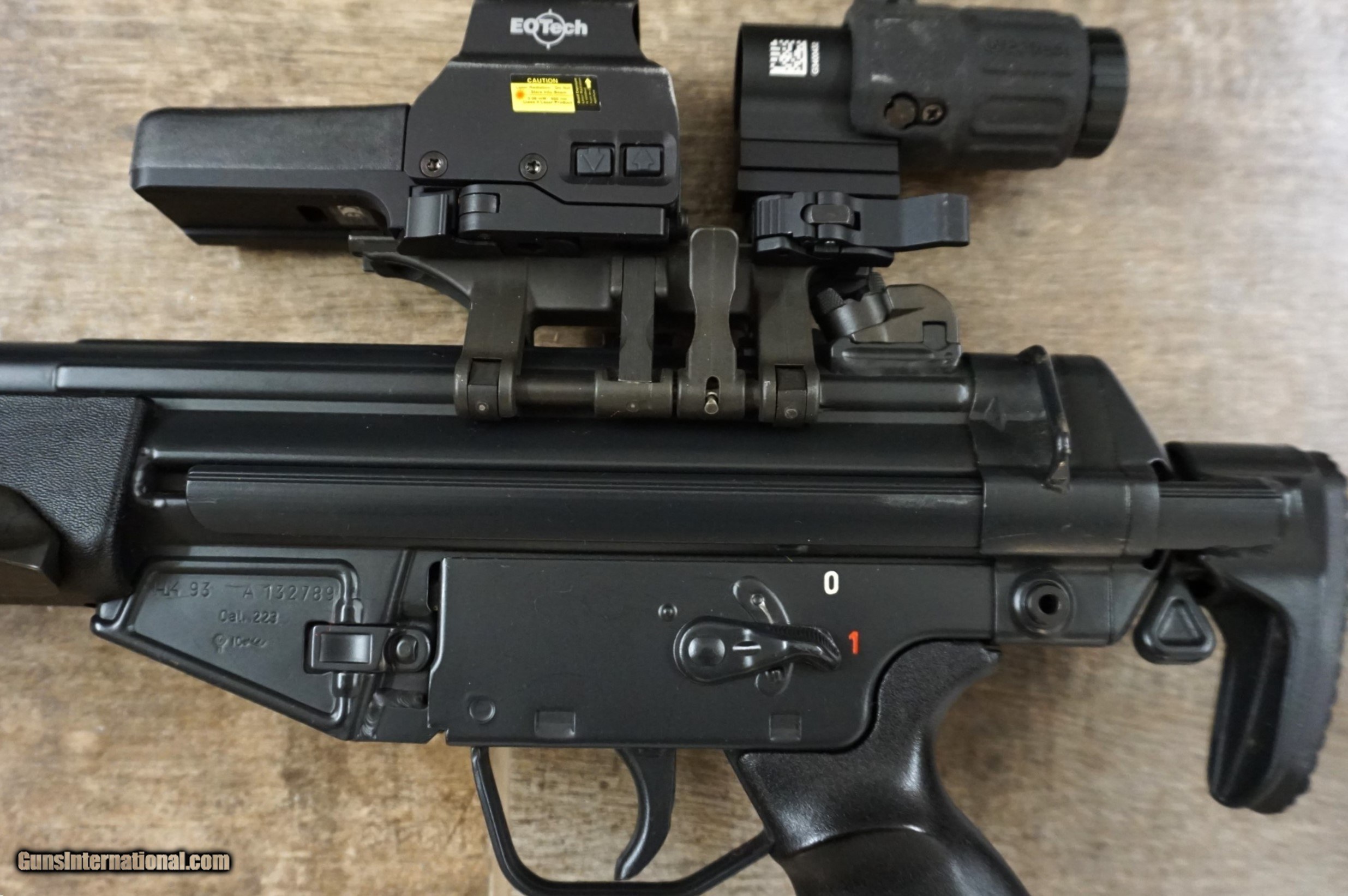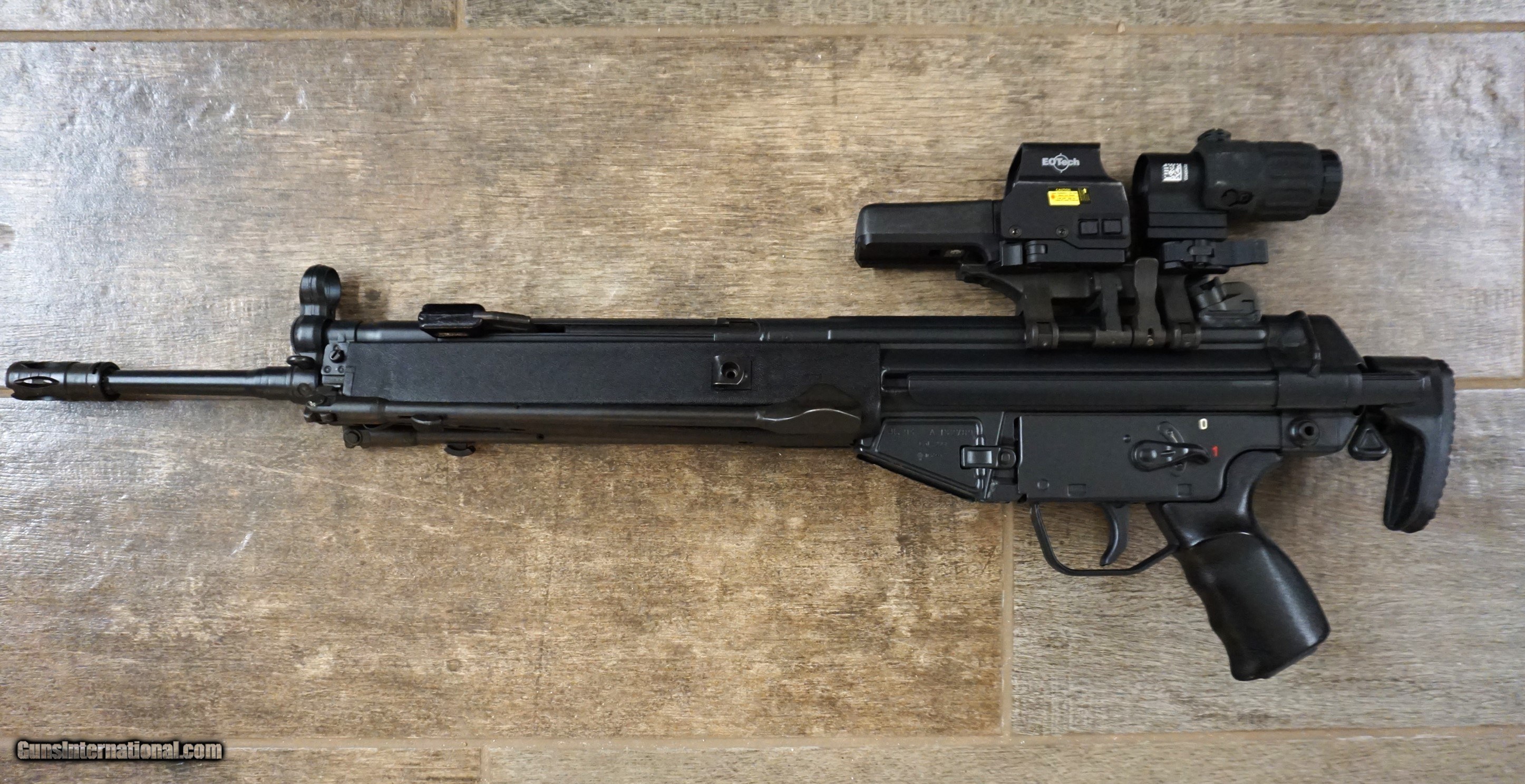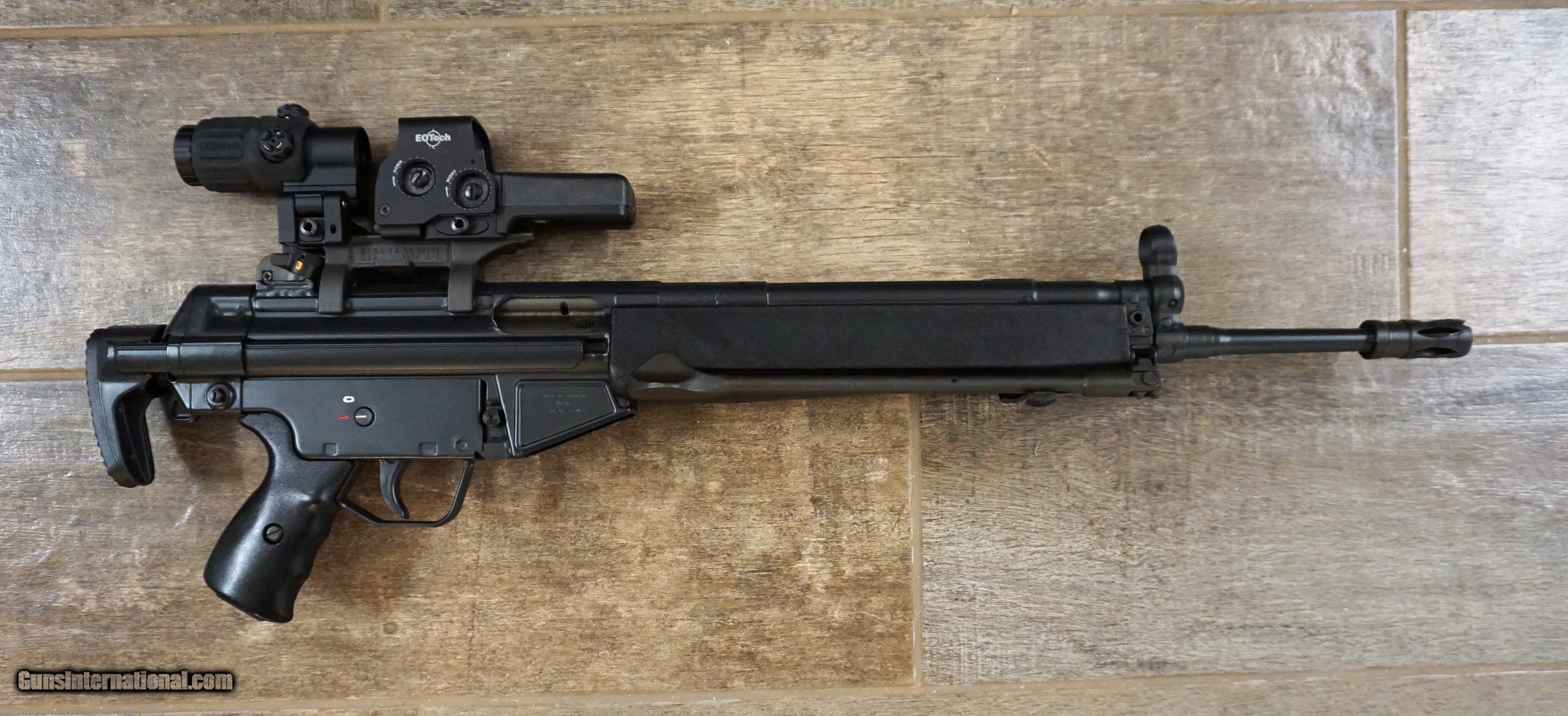 Description: HK 93 A3, 95% Plus condition, no box, .223 caliber, SN A132789, 16" barrel, 3-40 round and 3-25 round mags, Collapsible HK stock, Eotech HHSIII Hybrid Sight and 3X magnifyer both on correct HK ARMS style mount, open to reasonable offers SOLD Rifle Caliber: .223 Remington Manufacturer: Heckler & Koch Model: HK 93 Serial Number: A132789 Barrel Length: 16 Bore: excellent Condition: Excellent |