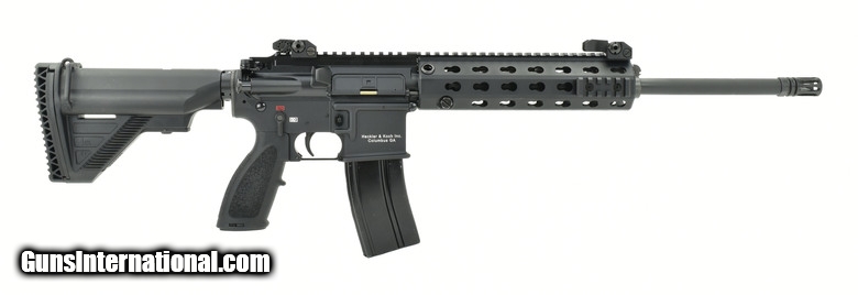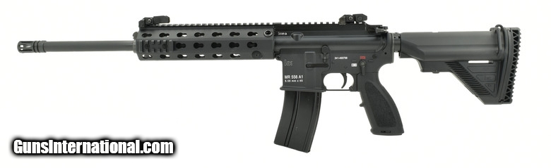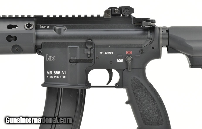 Description: HK MR556 A1 5.56mm caliber rifle. With 16” barrel, 9” KeyMod handguard, ambidextrous safety, adjustable stock, and flip-up sights. Comes with one magazine and soft case. New.