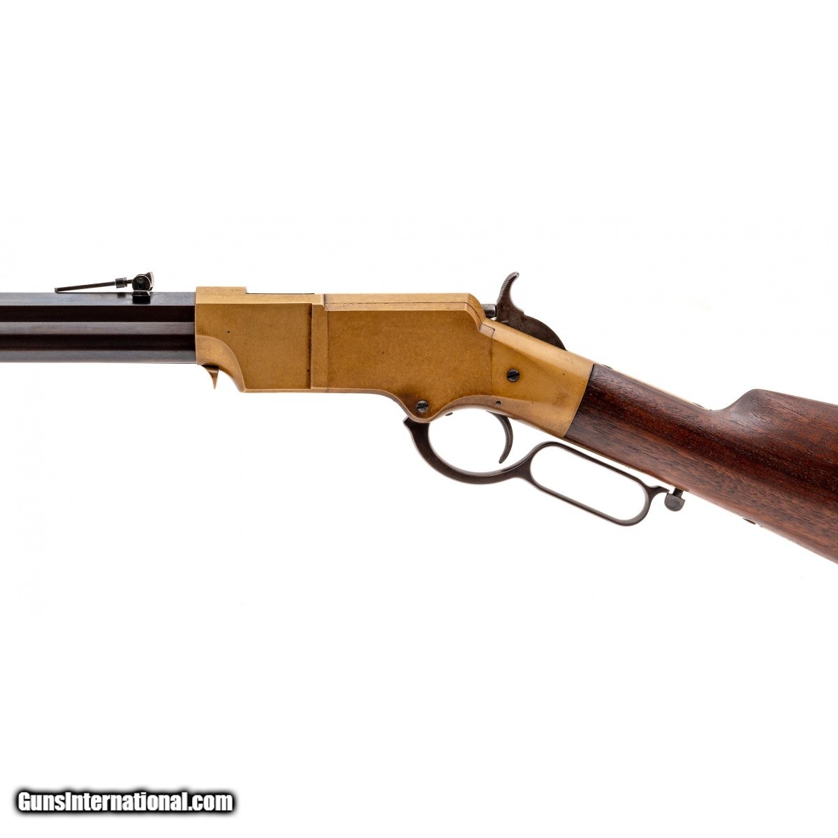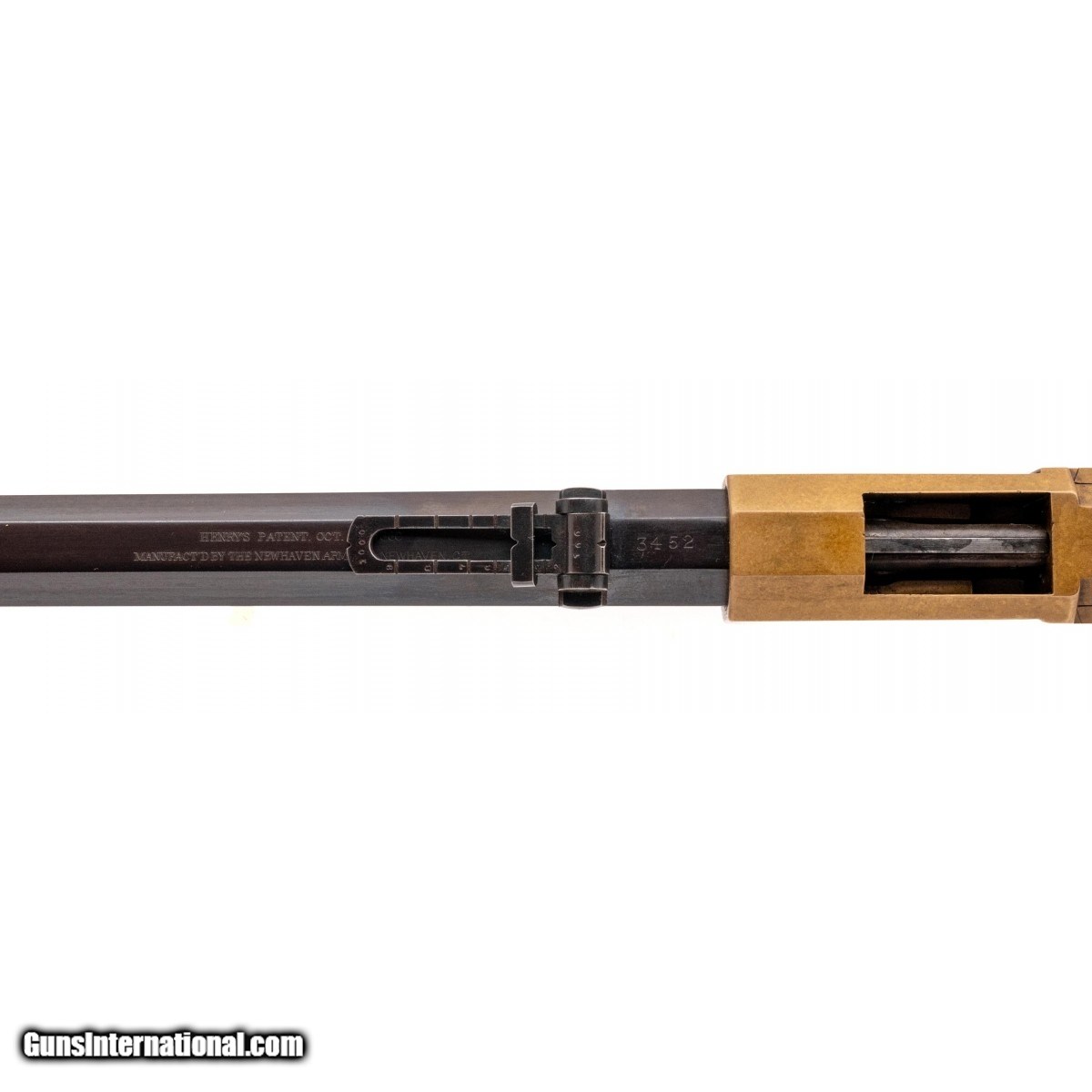 Description: "Serial number 3452. Made in 1863. 44 RF caliber with a 24" barrel. This is a gun that has been “enhanced". The barrel has been refinished and the the stock is a well made replacement even featuring the Henry Bump. The martial markings were either remarked, or newly applied. This gun is certainly in the range to be a martial gun, but we can not guarantee this was an original martial gun. SOLD Antique: Yes |