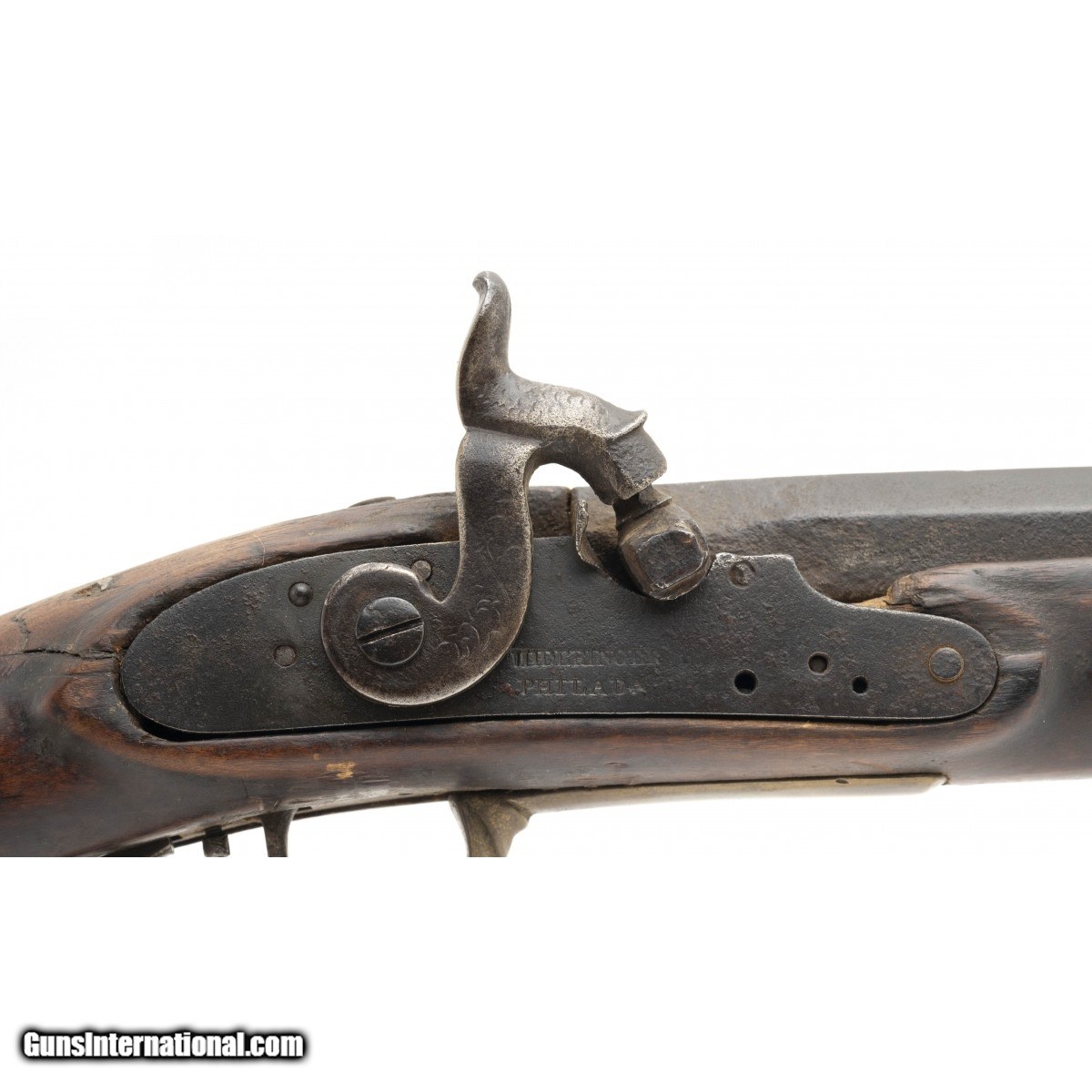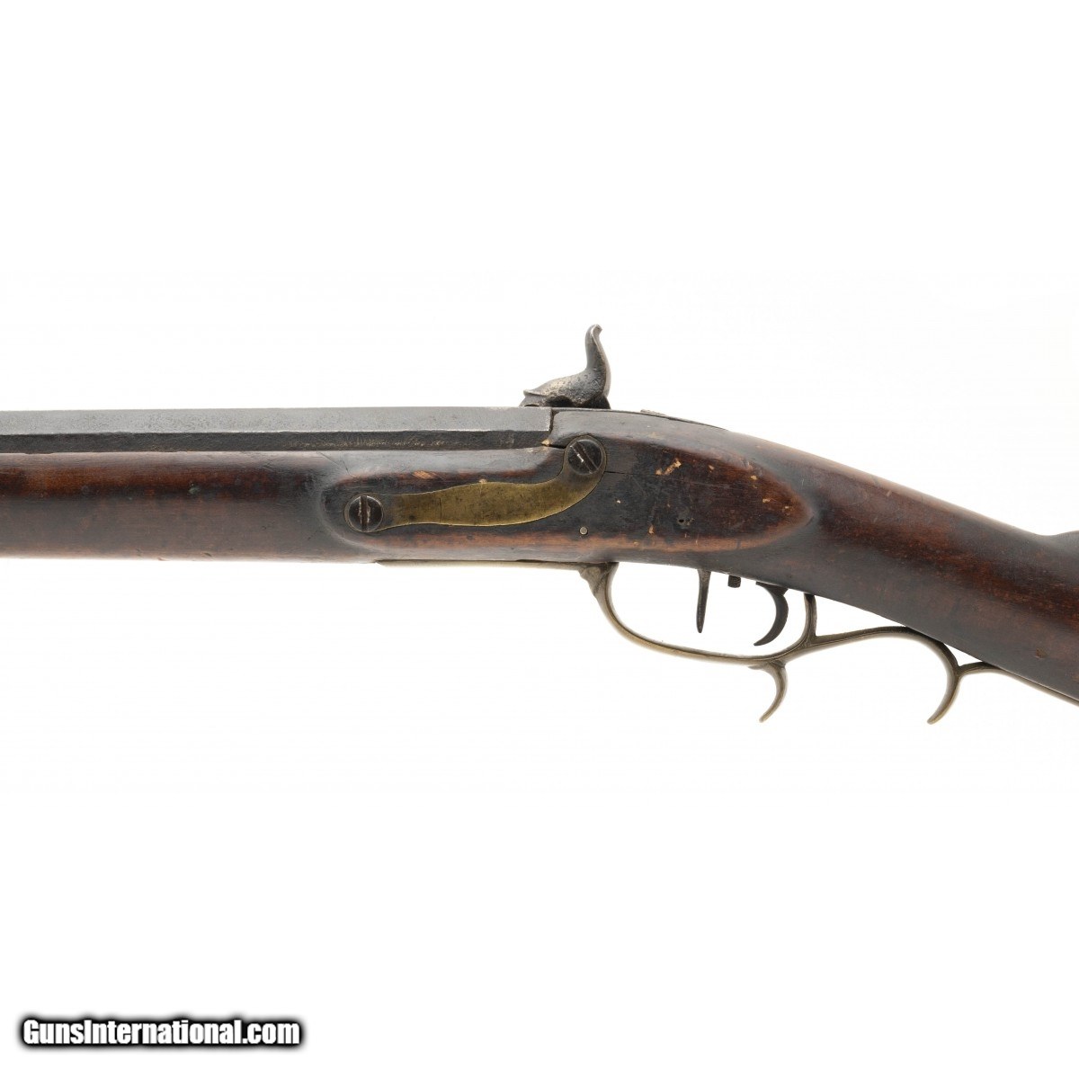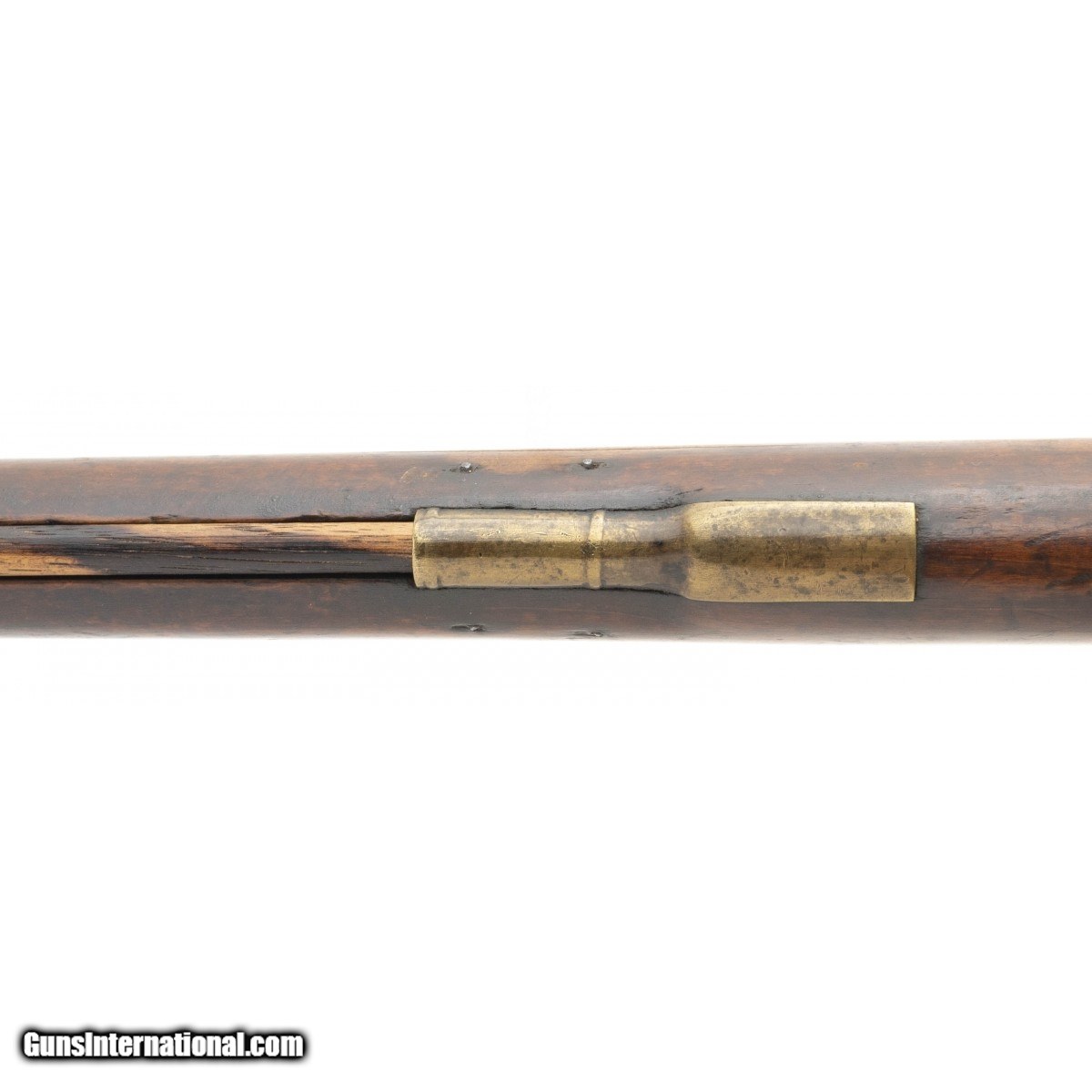 Description: "Made 1820s- 1830s. 50 caliber with a 40 ½" barrel. Very interesting gun in as found condition. Metal has a dark brown patina with some pitting. Wood is very good as it is intact. This gun has been converted to percussion. The areas around the tang and just forward of the drum conversion have quite a lot of percussion burnout. Action works well. SOLD Antique: Yes |