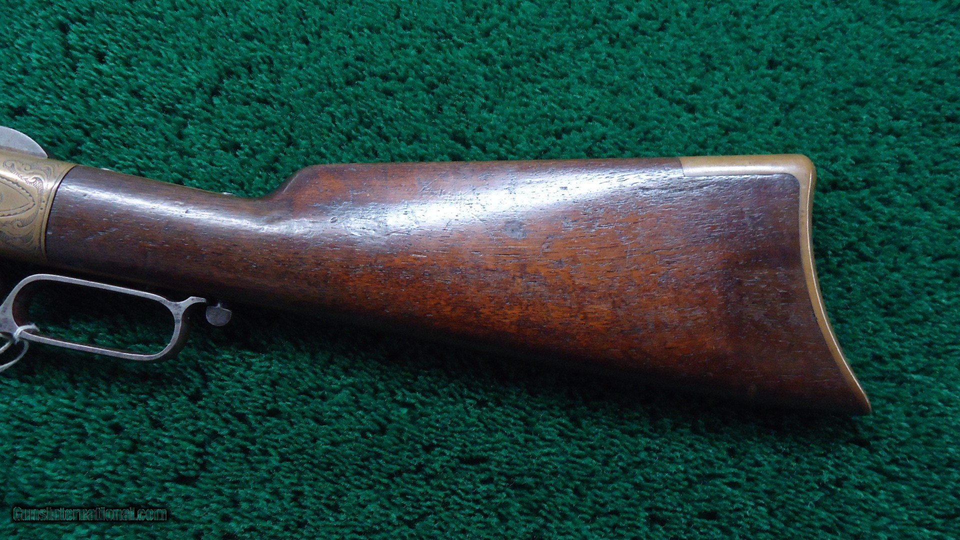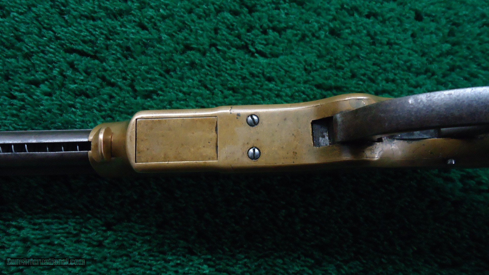 Description: 24 inch octagon barrel chambered in 44 RF caliber with a good bore that has some shine and visible rifling. Sights include a bit of what looks like ivory for a blade front and folding ladder rear. Barrel and magazine tube are mostly a light brown patina with good markings. Brass receiver has a beautiful patina and is factory engraved by Samuel J. Hoggson. Features a Doe jumping a fence on the left side with floral scrollwork on the both sides and the top. Engraving is mostly crisp. This was one of Hoggson's favorite patterns to engrave. Hammer and lever are a gray patina. The walnut stock is in very good condition with some minor handling mars. Brass buttplate has a nice dark mustard patina. There are no sling provisions on this rifle. Nice functioning action. Made in March of 1863. A nice looking engraved Henry rifle. Leroy Merz Antique Firearms specializes in antique and vintage Winchesters and other fine American firearms. Since 1965 Mr. Merz has taken part in the world of firearms and has been a contributor to many well known reference books. We have hundreds of additional guns in every price range at our home online. Search for Merz Antiques in google. SOLD Antique: Yes Rifle Caliber: .44 Rimfire |