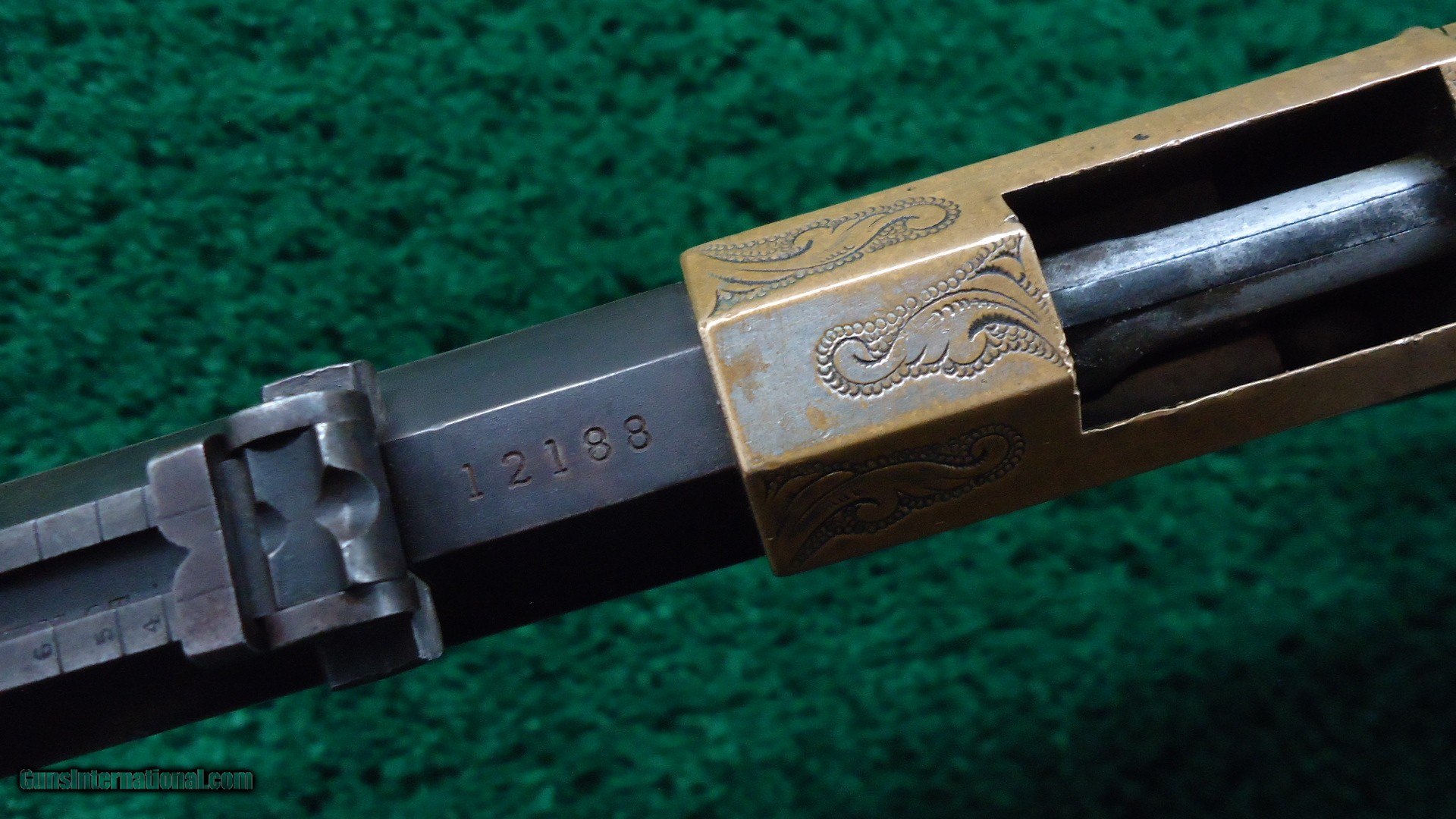 Description: Gun has original sights and excellent barrel markings. Sharp corners. Barrel has about 25-30% blue turning a plum color with stronger traces of original blue in the protected area. Deluxe grade wood is excellent with a good amount of varnish remaining. All matching numbers where appropriate. Original brass buttplate is also engraved. Receiver has excellent engraving and is a deep butterscotch color. Traces of original nickel plating remains in the protected areas. Hammer and lever have traces of case color that are turning dark. There appears to be a small minor hole poked into the right side of the receiver. Barely noticeable. Mechanics are excellent. Leroy Merz Antique Firearms specializes in antique and vintage Winchesters and other fine American firearms. Since 1965 Mr. Merz has taken part in the world of firearms and has been a contributor to many well known reference books. We have hundreds of additional guns in every price range at our home online. Search for Merz Antiques in google. SOLD Antique: Yes Rifle Caliber: .44 Rimfire |