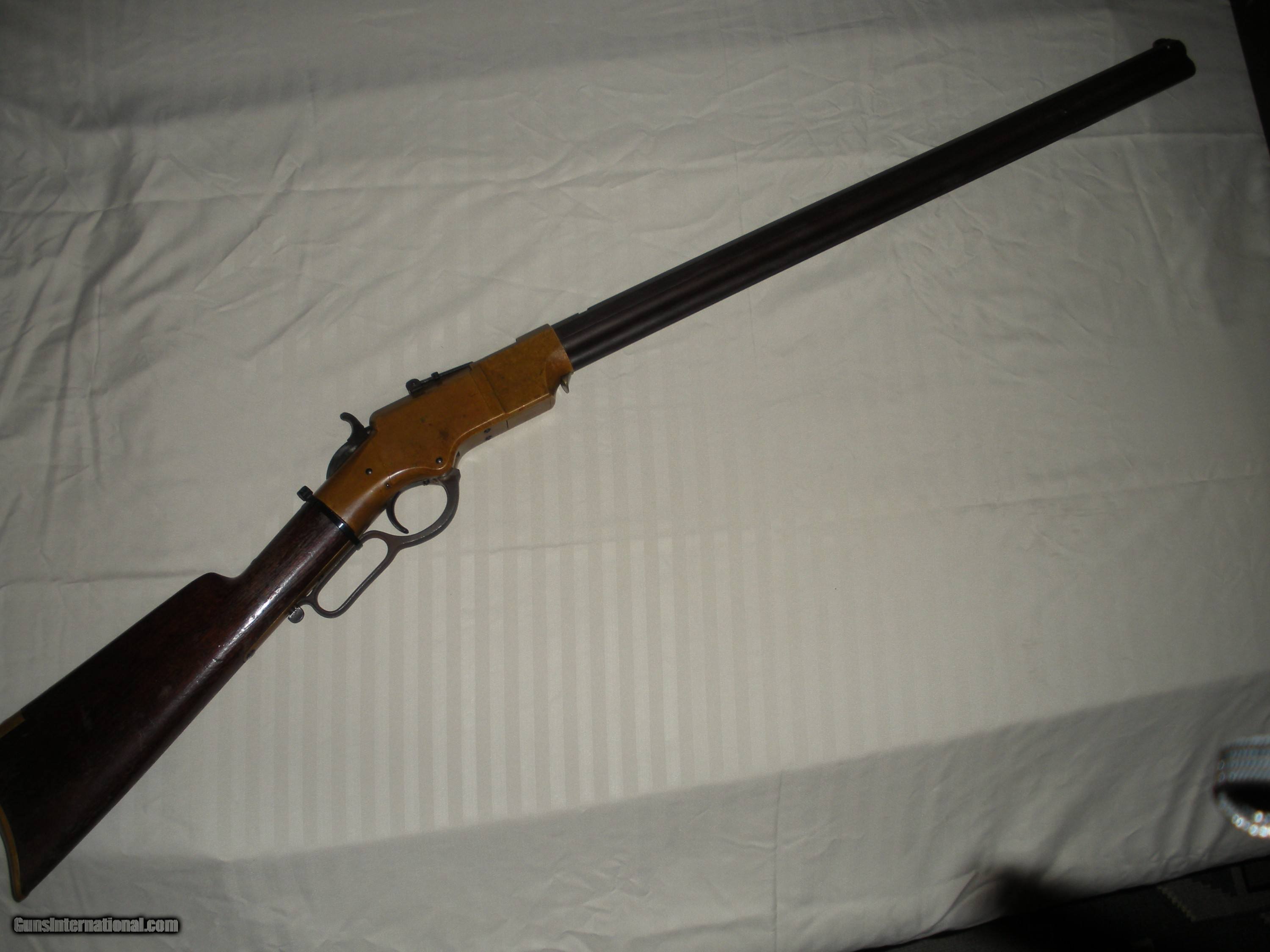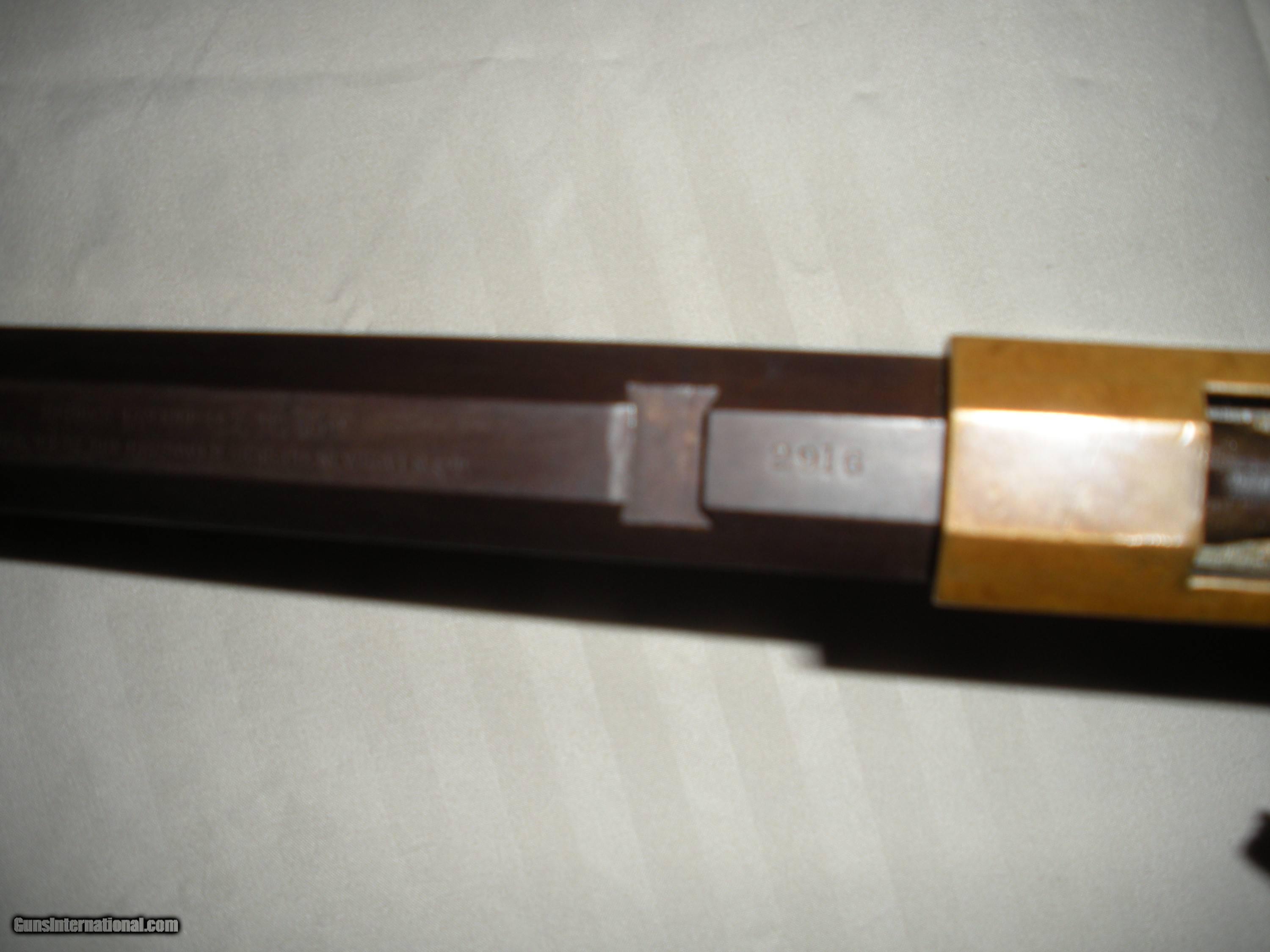 Description: Henry Rifle Serial #2916, Sling Swivels, distinctive Henry Bump on stock, original sight. Absolutely untouched finish and brass. Fine plum patina barrel with excellent markings. All matching with excellent untouched wood. Mechanically fine - A real beauty. $27,500 SOLD Antique: Yes |