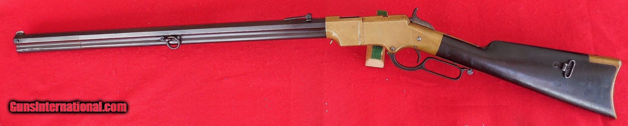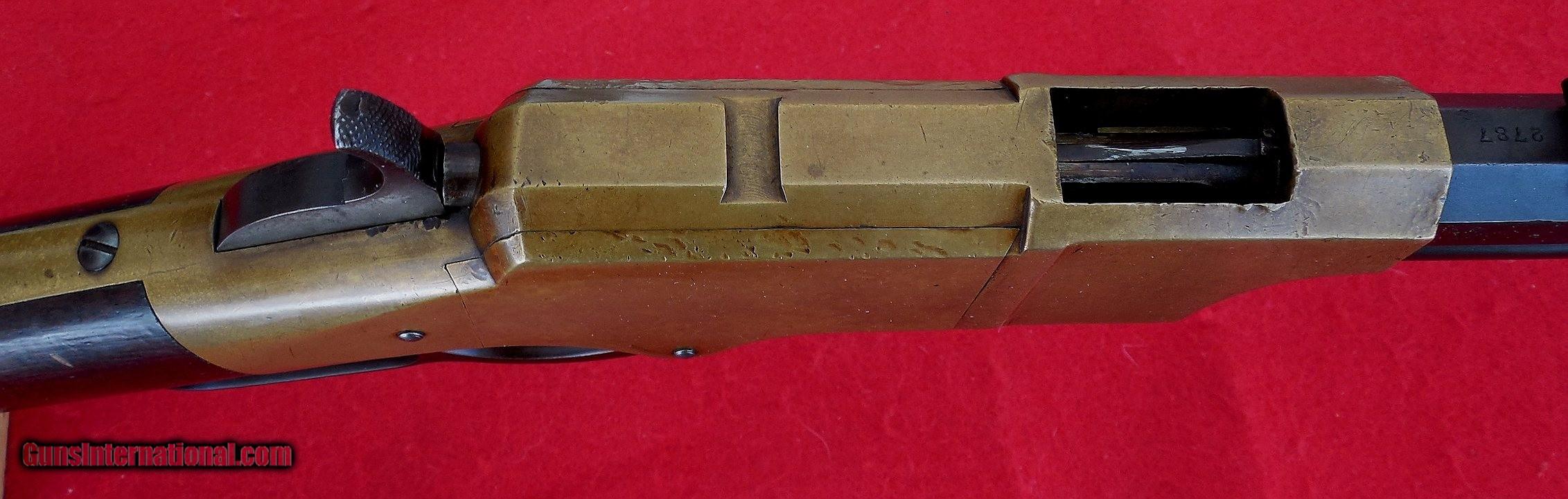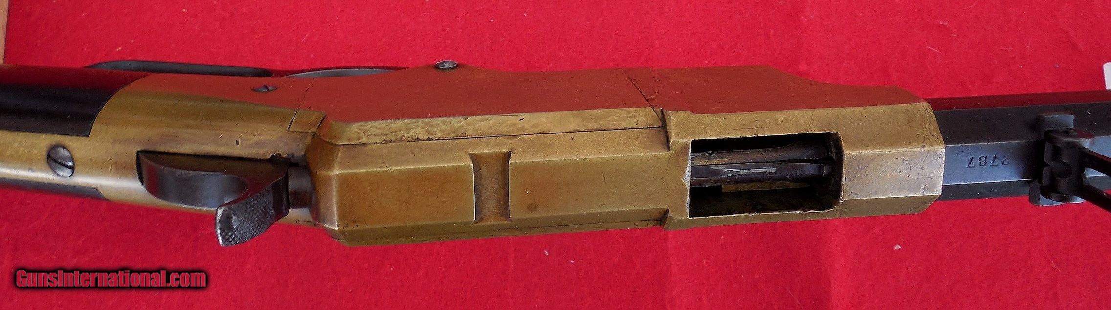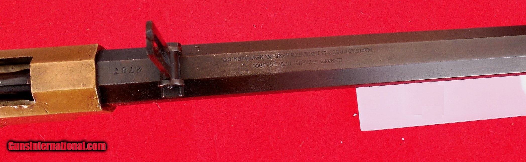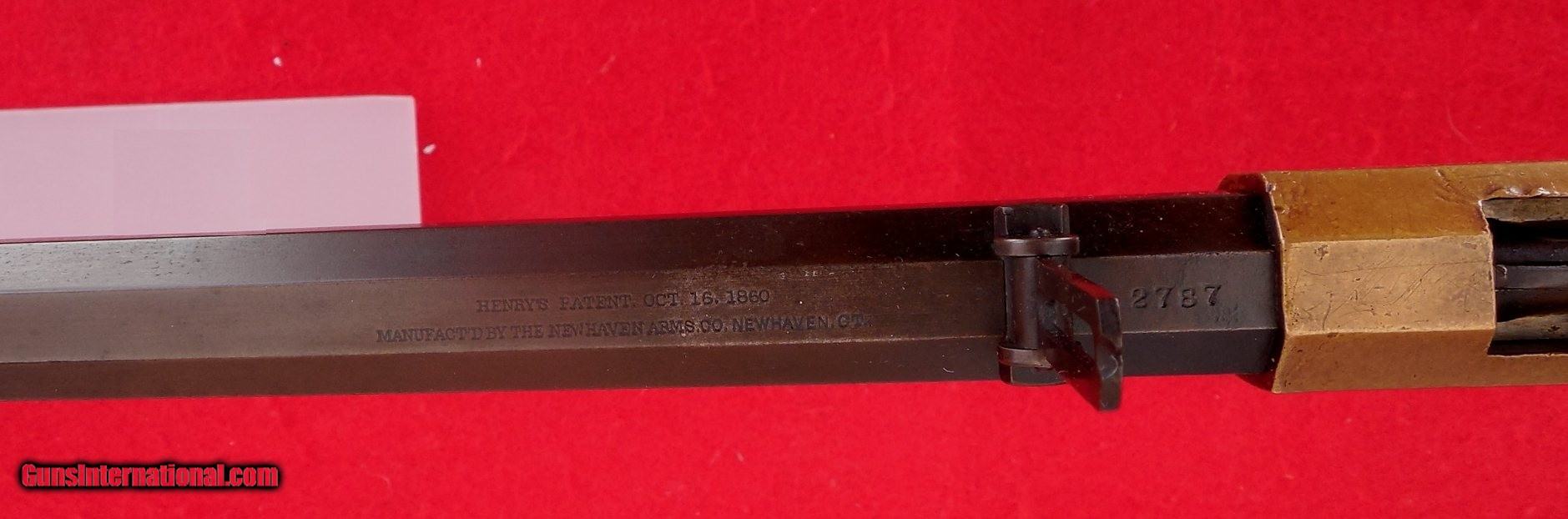 Description: New Haven Arms Company (Winchester) Henry Rifle. serial # 2787, cal. 44 RF, with a 24" barrel and a lightly pitted bore its length with good rifling throughout. The rifle was manufactured in 1863 and probably seen use in the Civil War its 8 numbers off from one used by John Cowens serial # 2779 of Company D, 23rd Illinois Infantry. This is an attractive honest Henry with matching numbers found on the barrel, lower tang, buttstock inlet, interior toe of the buttplate. The standard two-line barrel patent date and address remains intact and remarkably clear. The brass receiver has toned to mild ocher mustard colored patina along with the rounded heel buttplate showing some scattered very light dings and handling marks. The attractive dark walnut buttstock showing no shrinkage remains in very good condition with light dings and scratches attributed to normal use. The buttstock has a sling swivel mounted to the left side and the barrel the sling keeper ring; the rifle also has the extra factory dovetail atop the frame for relocating the sight. The original German silver blade front sight and 900 yard ladder rear sight are intact; the rear sight slider is missing. The action function well mechanically. The rifle appears to be untouched, except for normal use. The rifle as described and photographed is in very good condition. Inv. : # 22-183 SOLD Antique: Yes Rifle Caliber: .44 Henry |