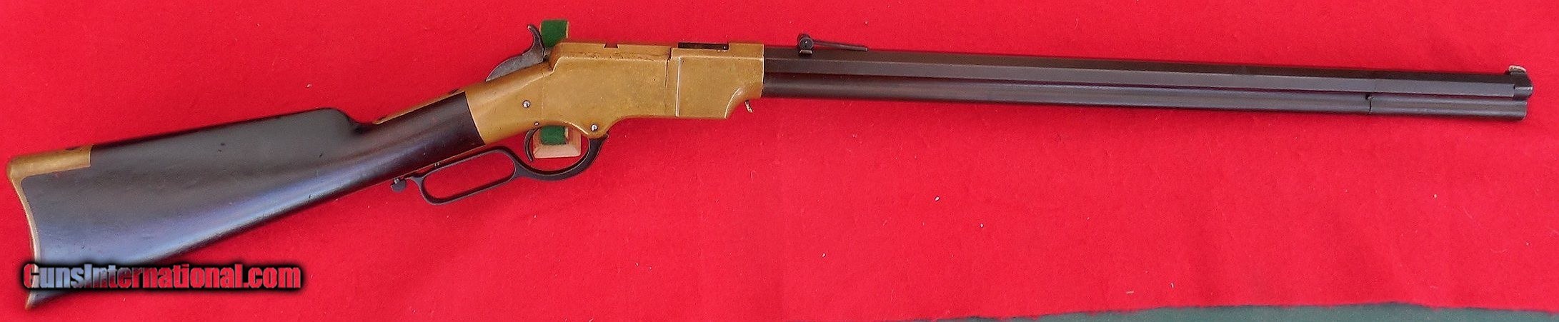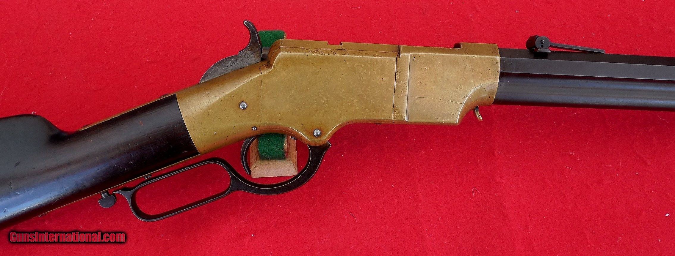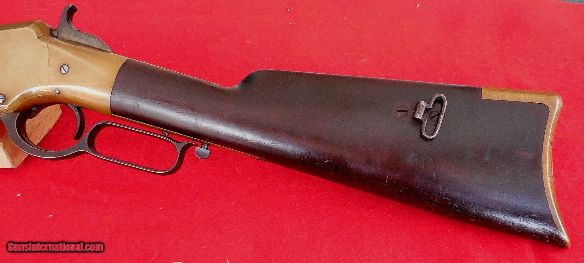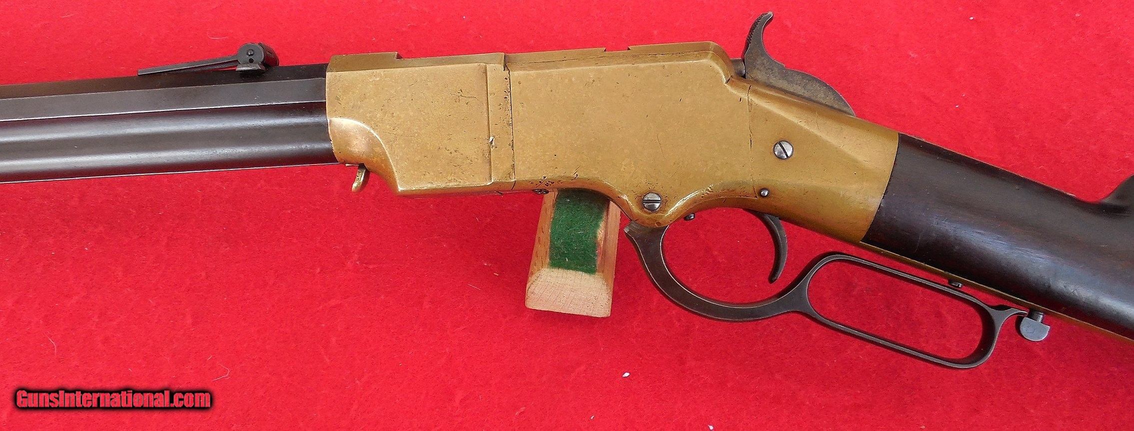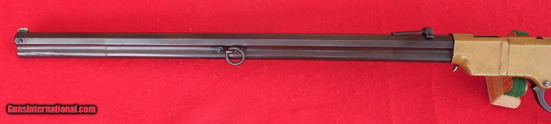Description: New Haven Arms Company (Winchester) Henry Rifle. serial # 2787, cal. 44 RF, with a 24" barrel and a lightly pitted bore its length with good rifling throughout. The rifle was manufactured in 1863 and probably seen use in the Civil War its 8 numbers off from one used by John Cowens serial # 2779 of Company D, 23rd Illinois Infantry. This is an attractive honest Henry with matching numbers found on the barrel, lower tang, buttstock inlet, interior toe of the buttplate. The standard two-line barrel patent date and address remains intact and remarkably clear. The brass receiver has toned to mild ocher mustard colored patina along with the rounded heel buttplate showing some scattered very light dings and handling marks. The attractive dark walnut buttstock showing no shrinkage remains in very good condition with light dings and scratches attributed to normal use. The buttstock has a sling swivel mounted to the left side and the barrel the sling keeper ring; the rifle also has the extra factory dovetail atop the frame for relocating the sight. The original German silver blade front sight and 900 yard ladder rear sight are intact; the rear sight slider is missing. The action function well mechanically. The rifle appears to be untouched, except for normal use. The rifle as described and photographed is in very good condition. Inv. : # 22-183 SOLD Antique: Yes Rifle Caliber: .44 Henry |