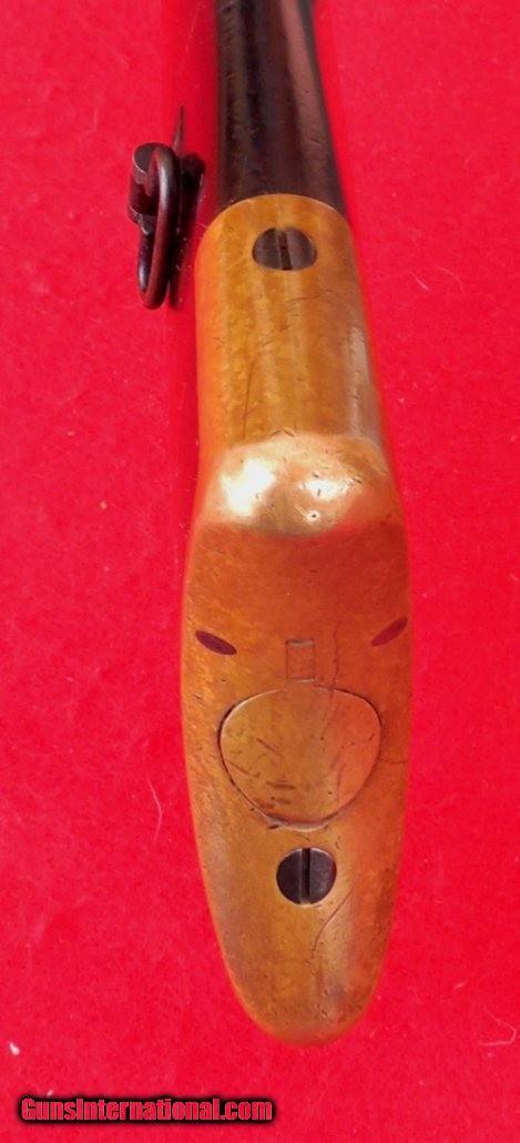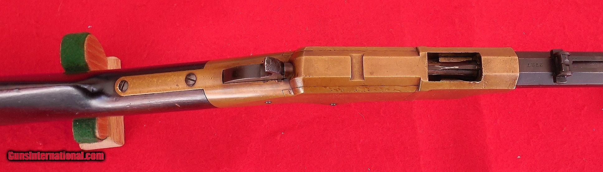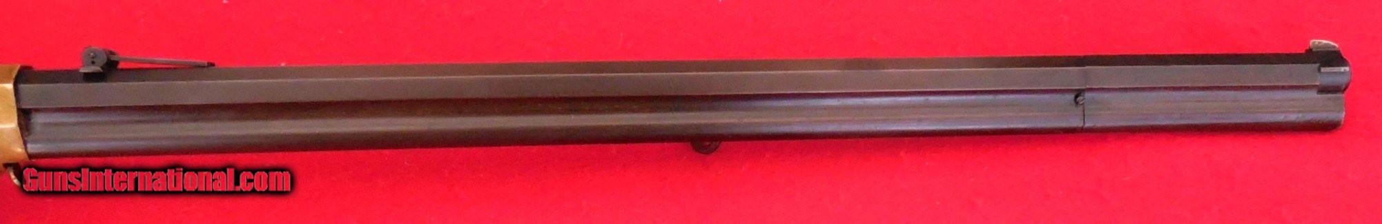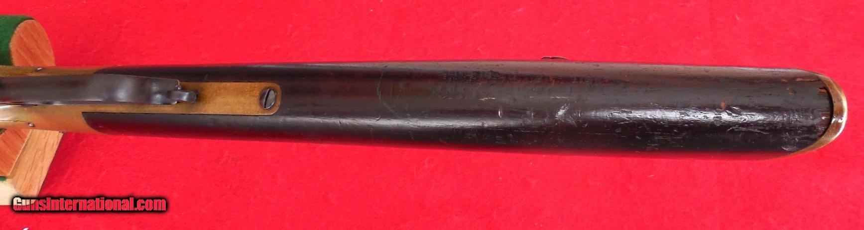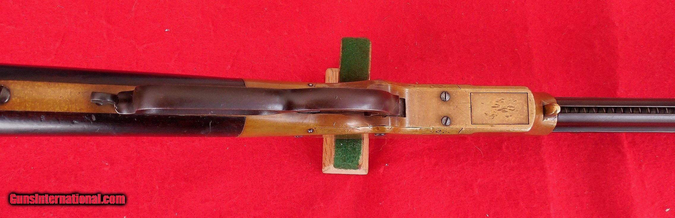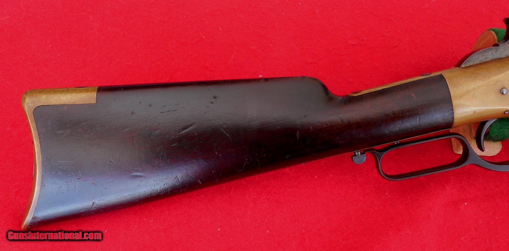 Description: New Haven Arms Company (Winchester) Henry Rifle. serial # 2787, cal. 44 RF, with a 24" barrel and a lightly pitted bore its length with good rifling throughout. The rifle was manufactured in 1863 and probably seen use in the Civil War its 8 numbers off from one used by John Cowens serial # 2779 of Company D, 23rd Illinois Infantry. This is an attractive honest Henry with matching numbers found on the barrel, lower tang, buttstock inlet, interior toe of the buttplate. The standard two-line barrel patent date and address remains intact and remarkably clear. The brass receiver has toned to mild ocher mustard colored patina along with the rounded heel buttplate showing some scattered very light dings and handling marks. The attractive dark walnut buttstock showing no shrinkage remains in very good condition with light dings and scratches attributed to normal use. The buttstock has a sling swivel mounted to the left side and the barrel the sling keeper ring; the rifle also has the extra factory dovetail atop the frame for relocating the sight. The original German silver blade front sight and 900 yard ladder rear sight are intact; the rear sight slider is missing. The action function well mechanically. The rifle appears to be untouched, except for normal use. The rifle as described and photographed is in very good condition. Inv. : # 22-183 SOLD Antique: Yes Rifle Caliber: .44 Henry |