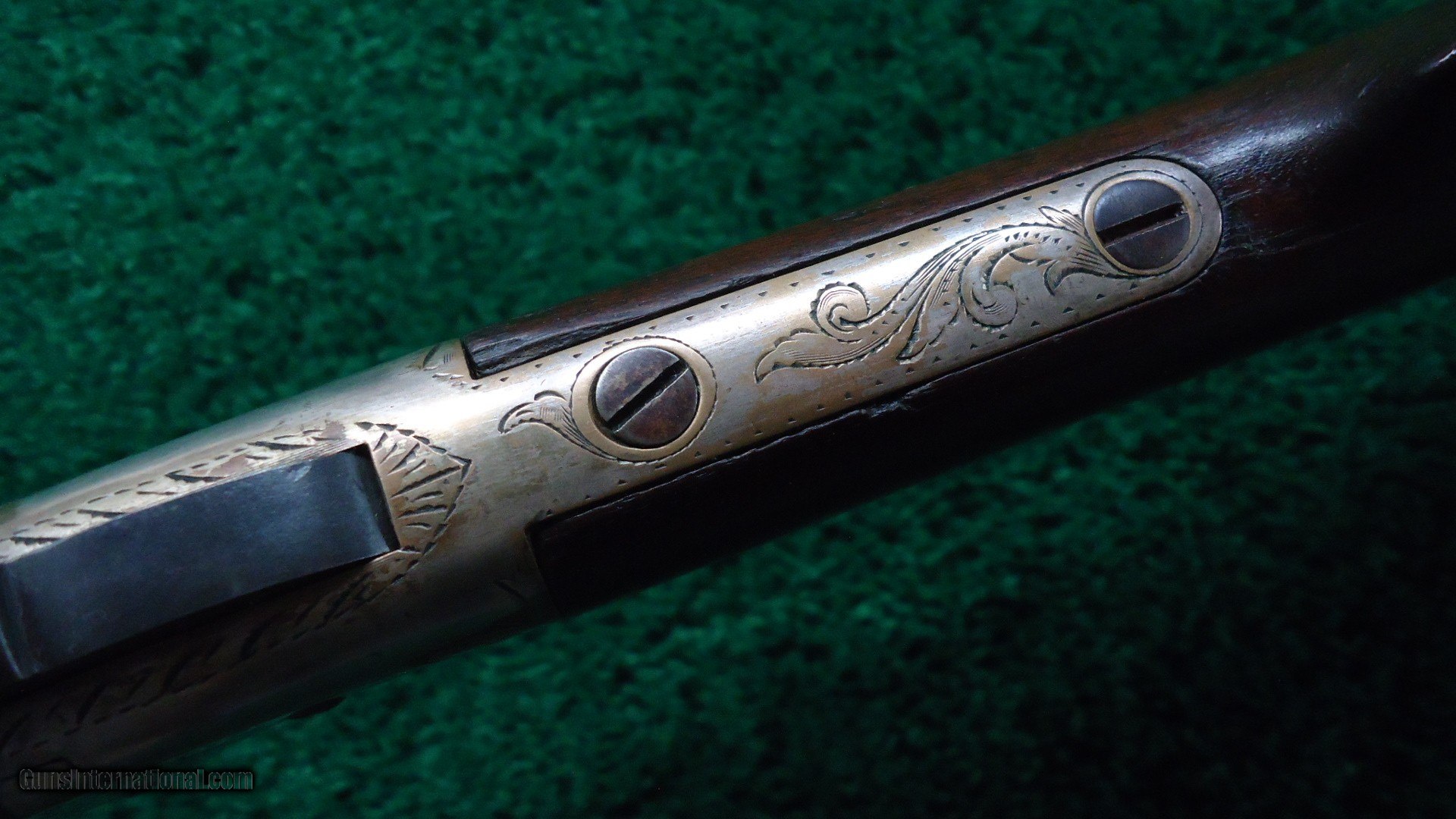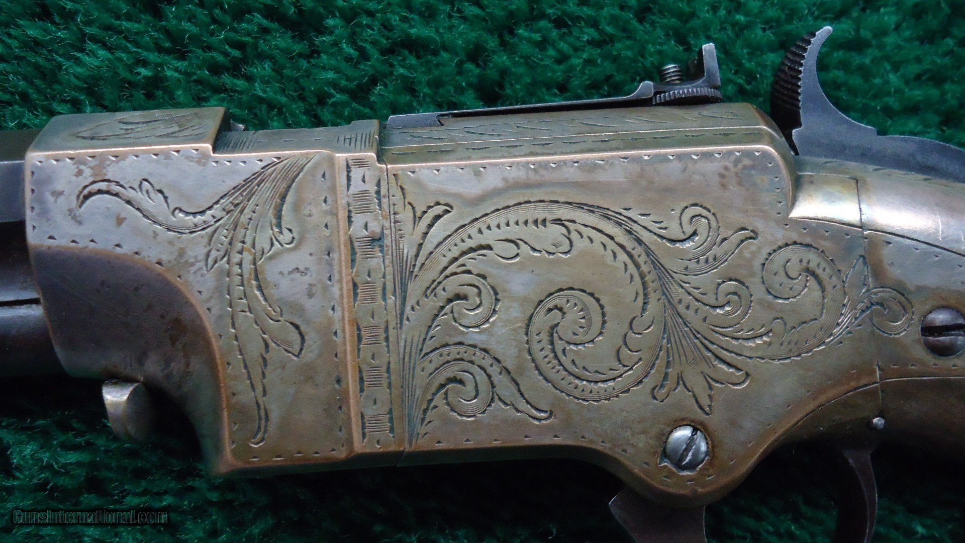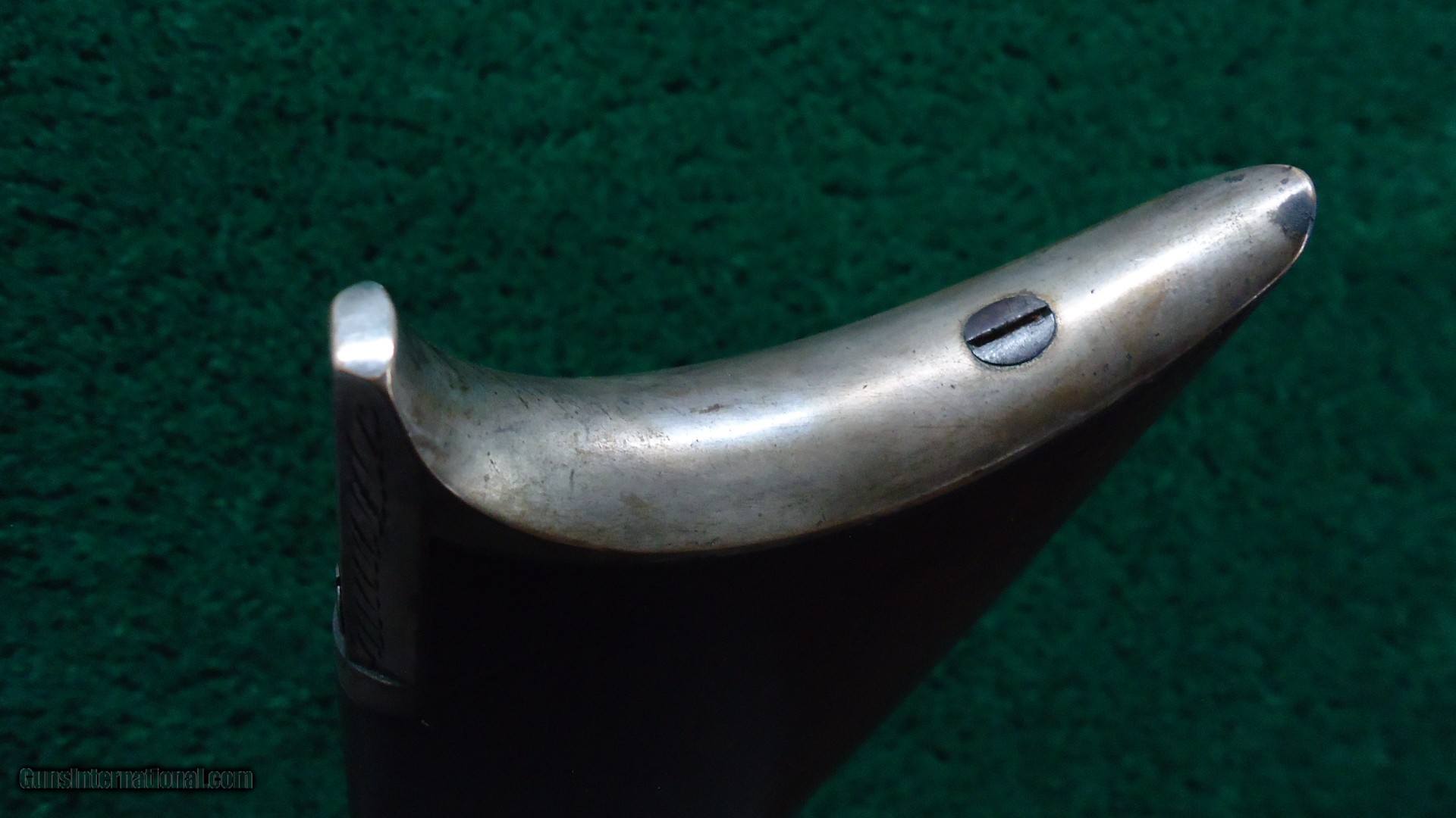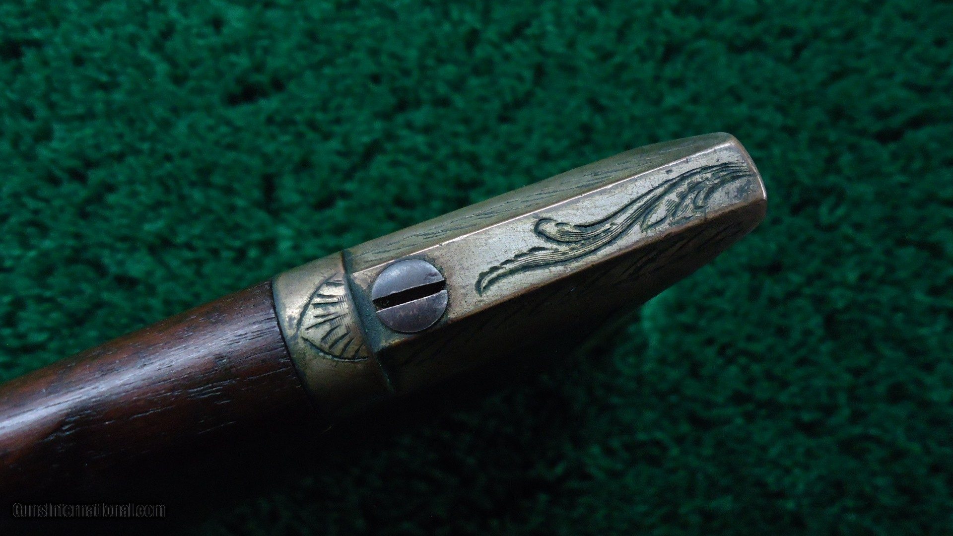 Description: Original factory engraved in the typical volcanic scroll engraving style. The receiver and buttplate are silver plated and retain about 40% of the original thinning silver. Original straight grained plain stock with perhaps a light coat of linseed oil added. The barrel retains good traces of blue that are turning a plum color. Sharp corners. Light markings. Original sights. The rear sight has a smooth dark patina with traces of the original blue finish. Gun functions very well. There were less than 90 of these 21 inch Volcanics ever manufactured making this a very rare gun indeed. This is a very good example of a New Haven Arms Company Volcanic carbine with the scarce 21-inch barrel, factory engraving, and special order silver-plated finish. A nice addition to any gun collection. Leroy Merz Antique Firearms specializes in antique and vintage Winchesters and other fine American firearms. Since 1965 Mr. Merz has taken part in the world of firearms and has been a contributor to many well known reference books. We have hundreds of additional guns in every price range at our home online. Search for Merz Antiques in google. SOLD Antique: Yes |