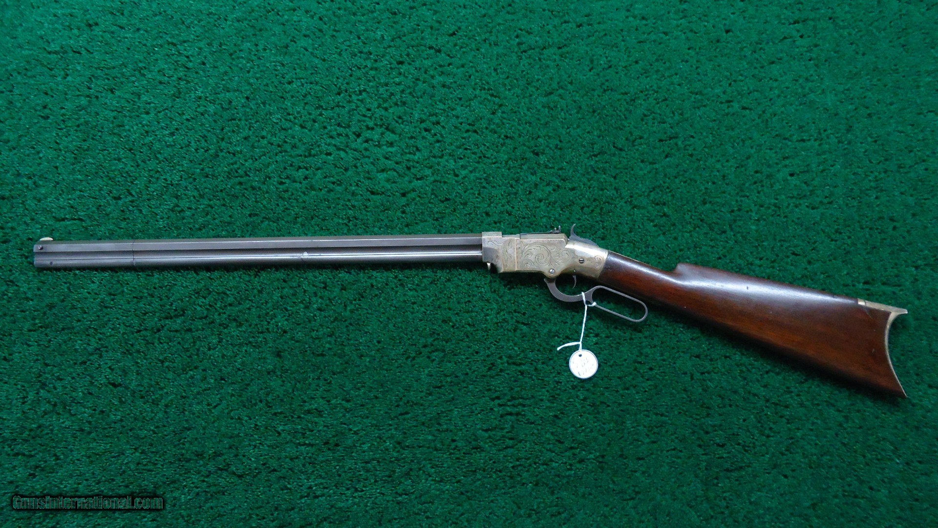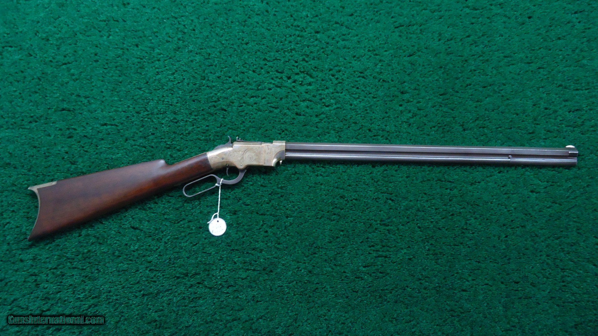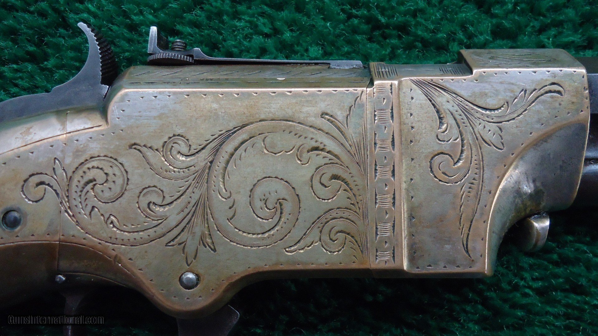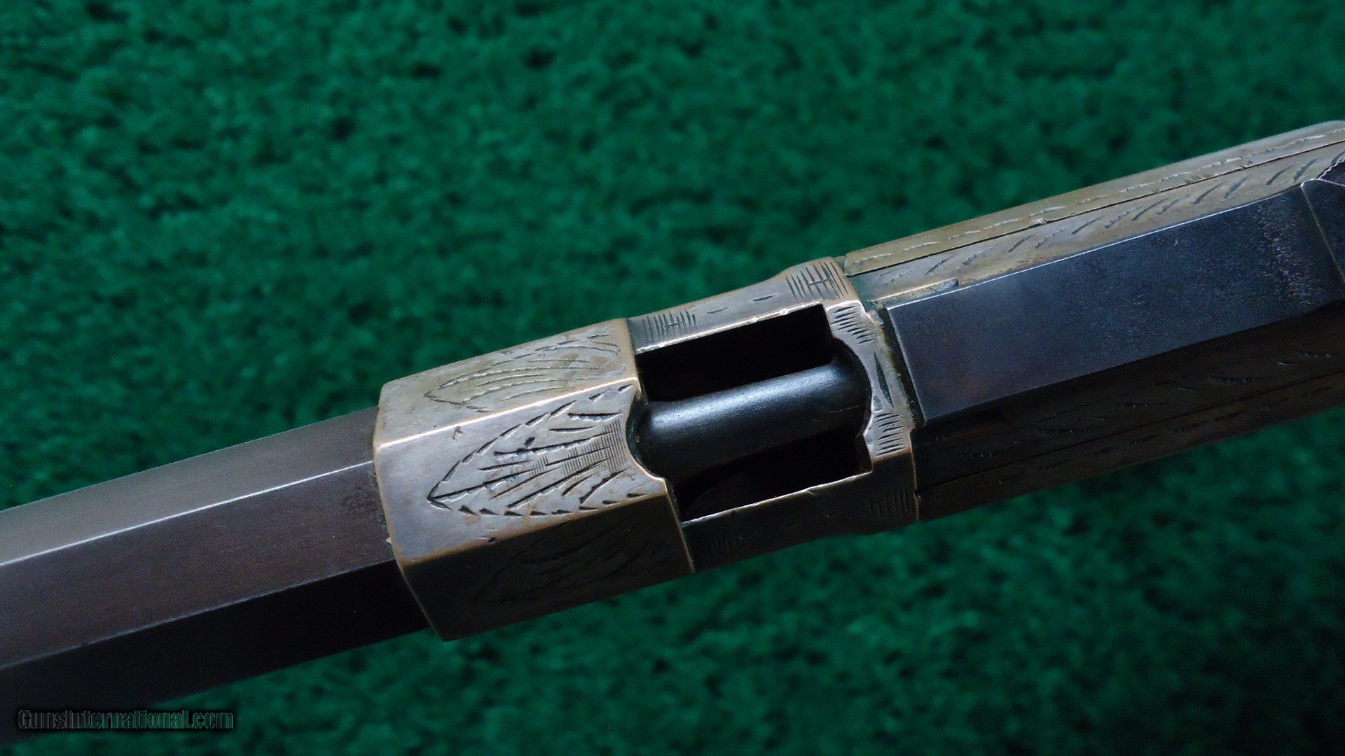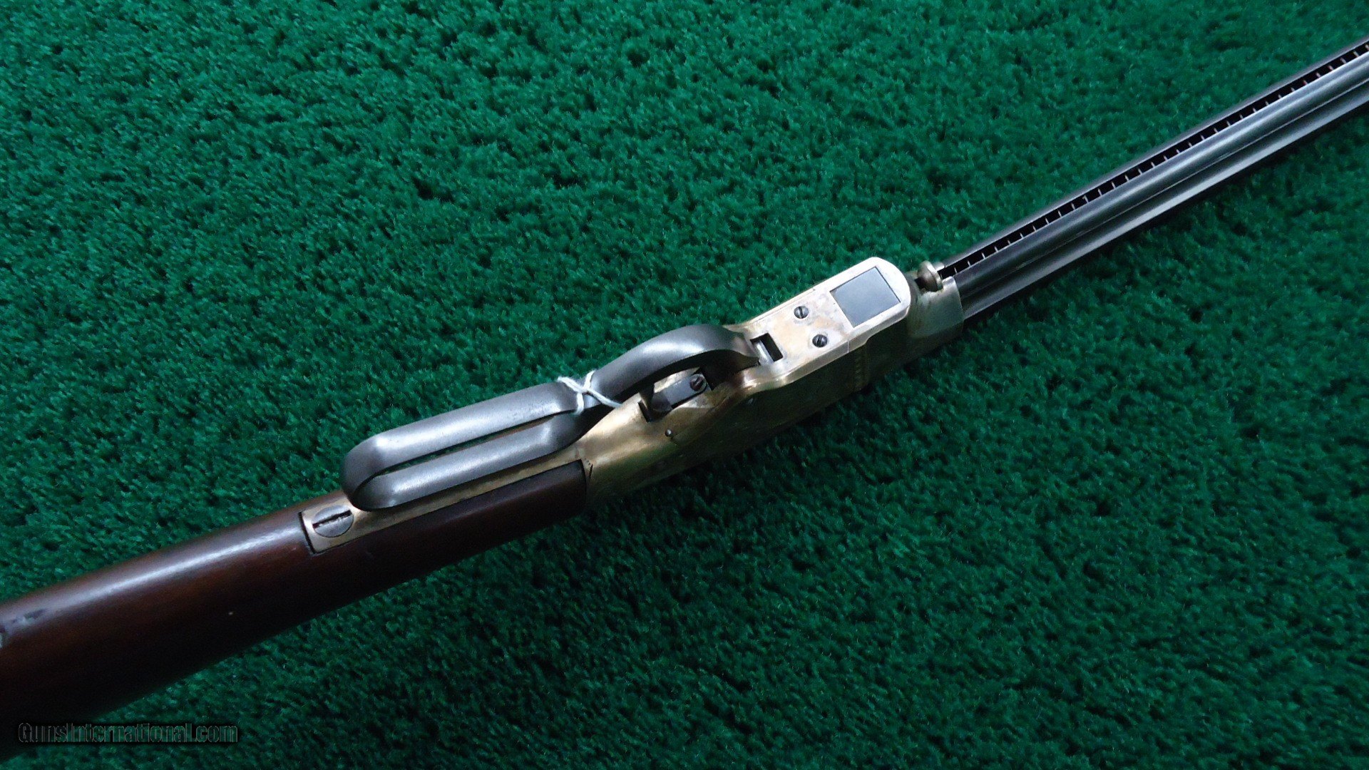 Description: Original factory engraved in the typical volcanic scroll engraving style. The receiver and buttplate are silver plated and retain about 40% of the original thinning silver. Original straight grained plain stock with perhaps a light coat of linseed oil added. The barrel retains good traces of blue that are turning a plum color. Sharp corners. Light markings. Original sights. The rear sight has a smooth dark patina with traces of the original blue finish. Gun functions very well. There were less than 90 of these 21 inch Volcanics ever manufactured making this a very rare gun indeed. This is a very good example of a New Haven Arms Company Volcanic carbine with the scarce 21-inch barrel, factory engraving, and special order silver-plated finish. A nice addition to any gun collection. Leroy Merz Antique Firearms specializes in antique and vintage Winchesters and other fine American firearms. Since 1965 Mr. Merz has taken part in the world of firearms and has been a contributor to many well known reference books. We have hundreds of additional guns in every price range at our home online. Search for Merz Antiques in google. SOLD Antique: Yes |
