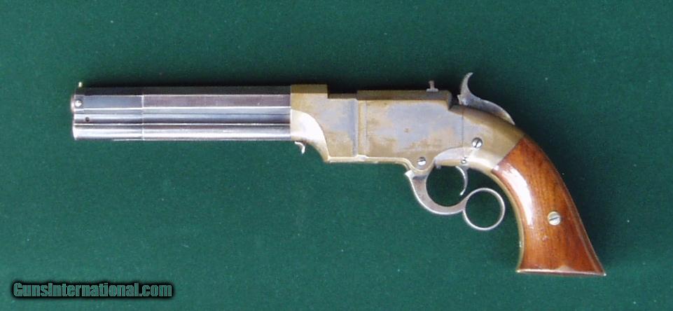 Description: Rare Volcanic large frame pistol w/ 6" barrel. Estimates are that fewer than 300 of the Volcanic large frames were made with a 6" barrel. The Volcanic company was short lived, having been established by Horace Smith & Daniel Wesson with their business partner in 1854. Subsequently, Oliver Winchester acquired the assets in 1857 and moved the company to New Haven, CT as the New Haven Arms Company. B. Tyler Henry was hired as superentendant and before too long, the Henry rifle was the result of the Volcanic progression. The brass receiver retains 30-40% of the original silver wash. The barrel & magazine tube retain 70-75% original blue. The grips show sharp edge wear w/ a few minor nicks while retaining most of their original factory varnish. Seeminly unique to this gun is a small, ~1/8" hole in the left front rib about a 1/4" from the muzzle. Perhaps this was to oil the barrel loading sleeve? Mechanics are fine; the bore w/ good shine w/ minimal pitting. Barrel address is crisp. A really nice piece from the Volcanic/Henry/Winchester era! SOLD Antique: Yes Manufacturer: Volcanic Repeating Arms Company Model: Large Frame w/ 6" barrel Serial Number: 852 Caliber Info: .41 Condition: Fine |
