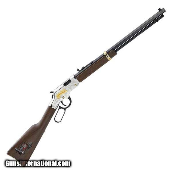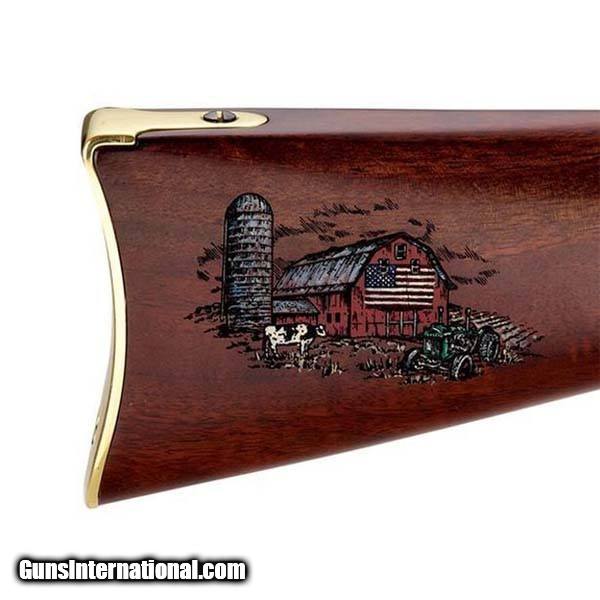 Description: The Henry Repeating Arms Golden Boy is the perfect rifle to collect, give as a gift, or take hunting. Chambered in .22 Long Rifle, this rifle is also capable of accepting .22 Short and Long ammunition. The 20" barrel provides excellent accuracy, and the lighting quick lever action provides quick followup shots. This tribute edition specifcally salutes the American farmer, and features detailed scenes of farming life engraved directly into the receiver. Additional images are also lovingly carved into the American Walnut stock. Henry American Farmer Tribute .22 LR 20" H004AF