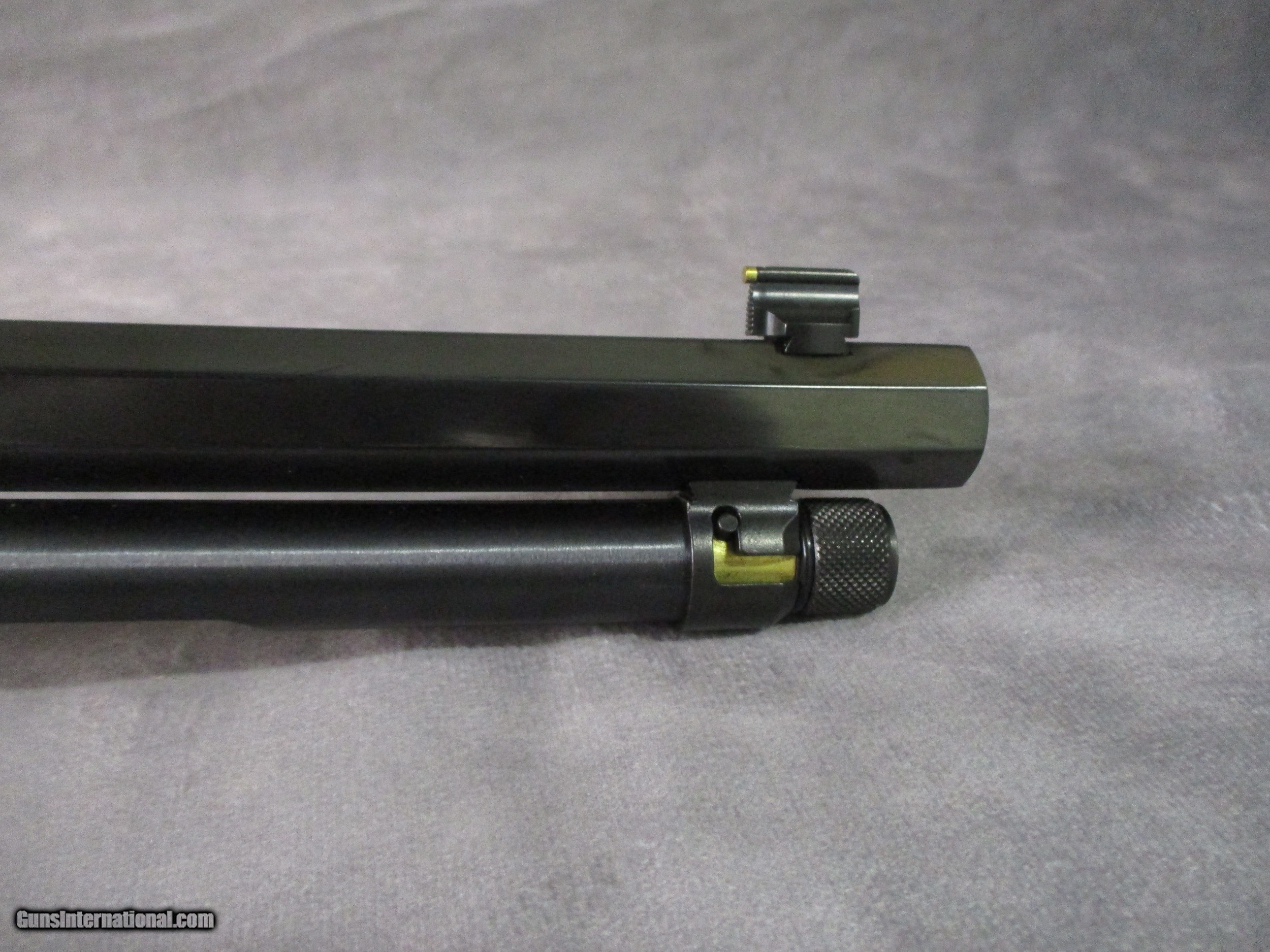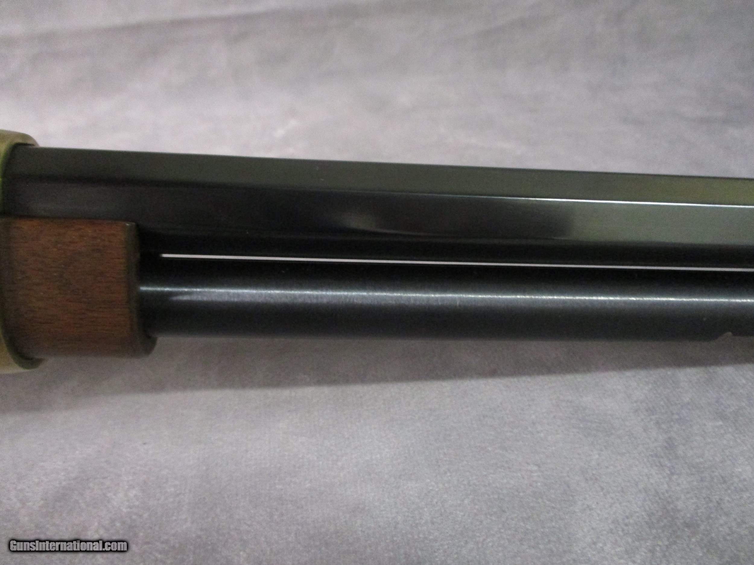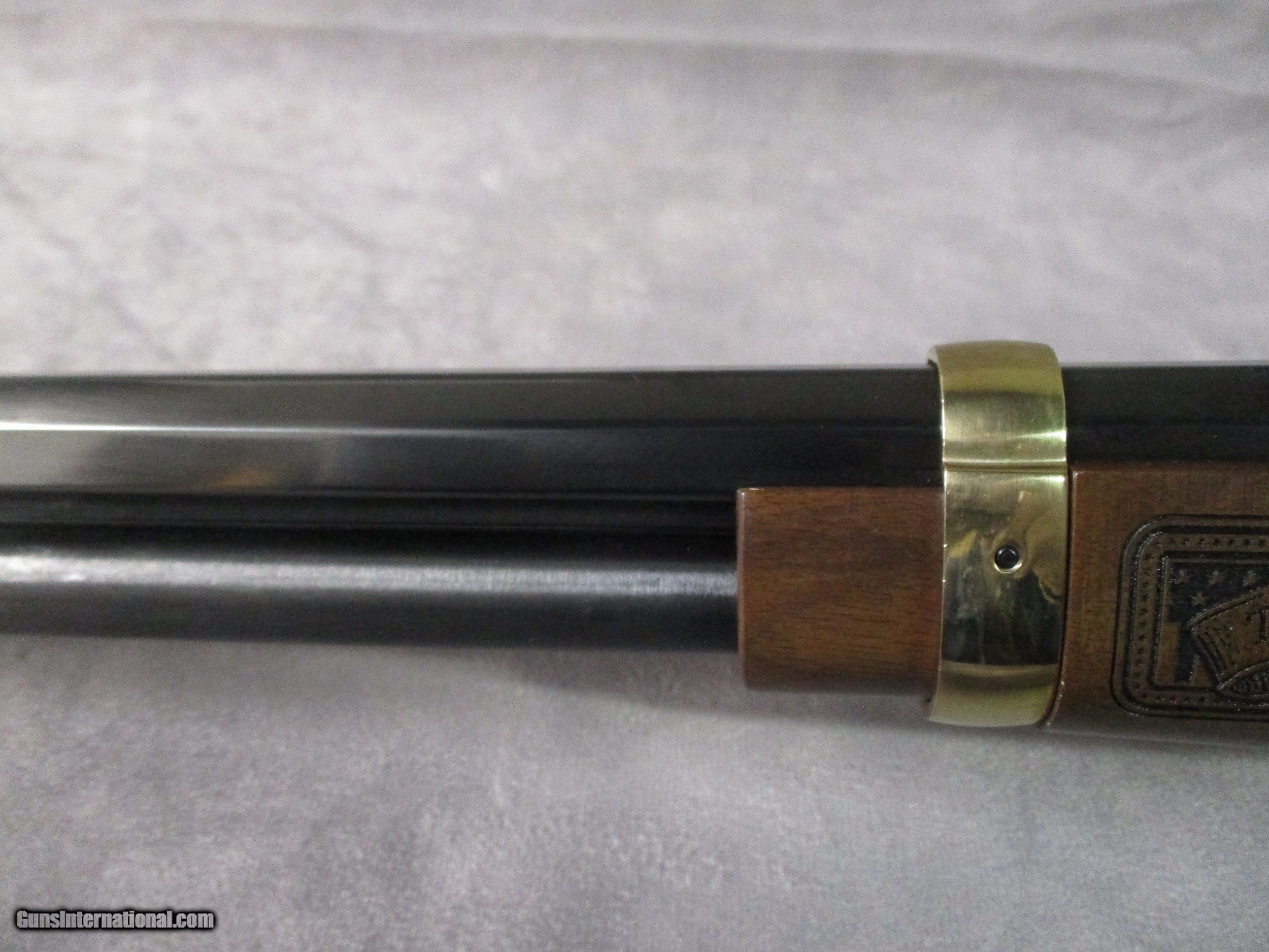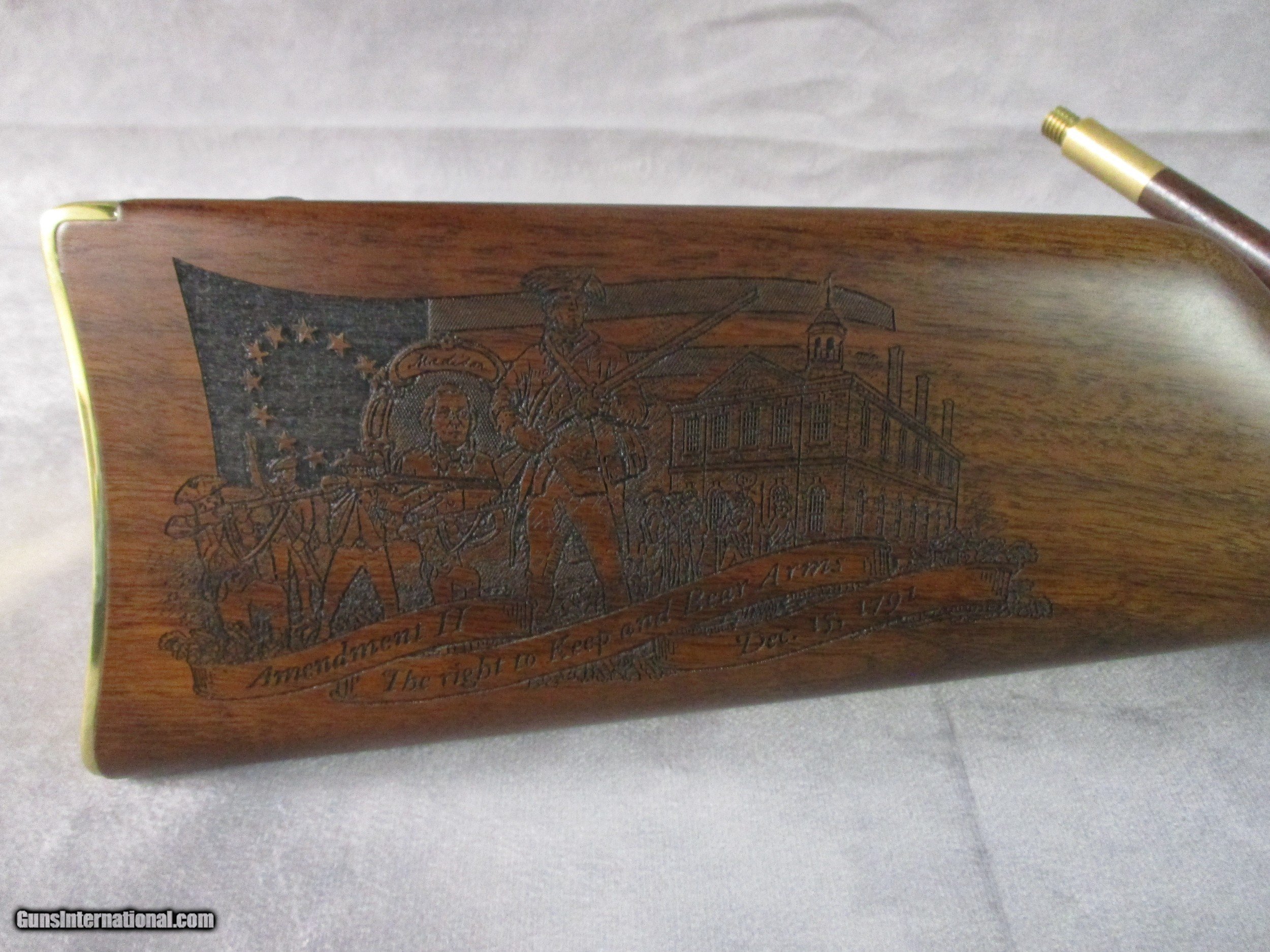 Description: “Made in America or not at all.” That’s Henry Repeating Arms Co.’s slogan. The Henry Big Boy is available in .45 Colt, .44 Magnum, .41 Magnum, .357 Magnum, and .327 Federal Magnum. All of the calibers are SASS approved so any Cowboy Action shooters can use any Big Boy in competition. This 100% American made rifle is chambered for the legendary .357 Magnum. The .357 Magnum was originally designed to allow S&W N-frame revolvers to compete with the .38 Super-chambered Colt 1911 pistols in the law enforcement business, specifically in the area of punching through steel car doors and frames used by gangsters and other outlaws in the 1930s. It was also the velocity king of cartridges at the time, surpassing the previous record holder, the 7.63mm Mauser. The .357 Magnum was later found to be useful for hunting deer at close range. It has become very popular for Cowboy Action Shooting as the brass is less expensive to buy than those for old western cartridges such as the .32-20, .38-40, and .44-40. The example shown here is a very special, limited edition rifle customized by Historical Armory, Inc. It commemorates the 2nd Amendment and features extensive engraving. The right side of the butt stock is engraved with a fully original piece of artwork depicting the history of the 2nd Amendment. Both sides of the receiver are engraved with intricate artwork. Both sides of the fore end also feature detailed engraving. This rifle is No. 100 in a series of 1000 H006M rifles. Three other models are offered in the 2nd Amendment Limited Edition series. These are the H001 Classic Lever Rifle in .22 LR, the H004 Golden Boy in .22 LR, and the H009B in .30-30 Winchester. Each of the models has its own number series. The Big Boy’s stock is made of American walnut and is the classical straight-grip type. The octagonal barrel is 20” long. Total length of the rifle is 38.5”. Magazine capacity is a generous 10 rounds. The receiver is drilled and tapped for Henry’s BB-RSM scope mount. The Big Boy is pre-owned but has never been fired. A gentleman’s wife bought one of each of the four models available from Historical Armory, each one the 100th rifle in their series as a gift for him. Sadly, he passed away and we are selling the four rifles on her behalf. SOLD Rifle Caliber: .357 Magnum, .38 Special Manufacturer: Henry Repeating Arms Model: H006M Big Boy 2nd Amendment Ltd. Ed. Serial Number: BB0110554M Bore: Rifled, 1:16 inch (1 in 406 mm) twist Condition: Like New in Box Barrel Type: Octagonal Action: Lever action Triggers: Single Stock: Engraved Walnut, straight-wrist, brass butt plate Fore End: Engraved Walnut Butt Pad: Brass LOP: 14.5 inches (368 mm) Finish: Blued (Barrel), Polished Brass (Receiver) Weight: 8.68 lbs. Sights: Adj. Semi-Buckhorn Rear, Brass Bead Front, Sight Radius 16.675 inches (423.5 mm) Engraving: See description Case: Henry Box |