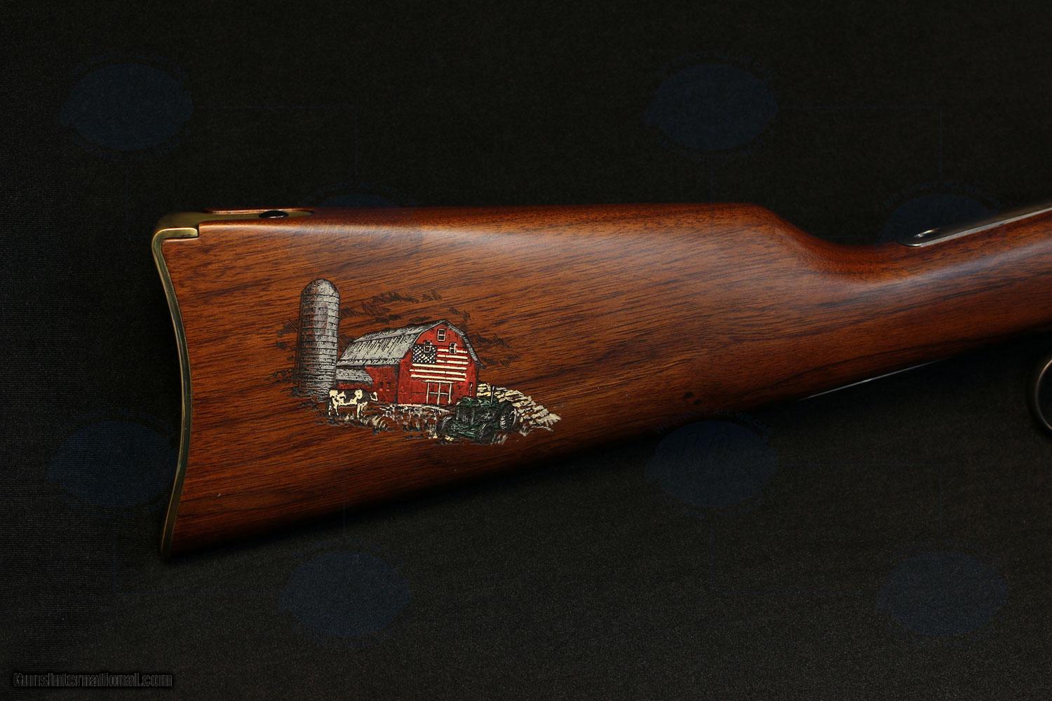 Description: Henry Golden Boy American Farmer Rimfire Rifle 22 LR, 20 in, Lever Action, Walnut Stock, Blue Steel Barrel/Brass Rcvr In celebration and recognition of America's Farmers who devote their lives to feeding the world, the Henry Repeating Arms Company presents the American Farmer Tribute Rifle. The left side of receiver cover features an iconic image of a farmer working behind his horse-drawn plow with his barn in the background. The cameo has 24kt. gold selective plate and the front and rear panels have the unique agricultural scroll pattern. This lever action rifle is safe for left or right handed use. It holds 21 rounds of 22 Short, has an overall length of 38.5" and a barrel length of 20". The walnut stock features a hand painted carving of a barn that showcases the American flag. SPECIFICATIONS: Make: ?Henry Model: Golden Boy Model #: H004AF Action: Lever Gauge: 22 Long Riffle Barrel Length: 20" Capacity: 21Rd FREE SHIPPING! No Credit Card Fees! SOLD |