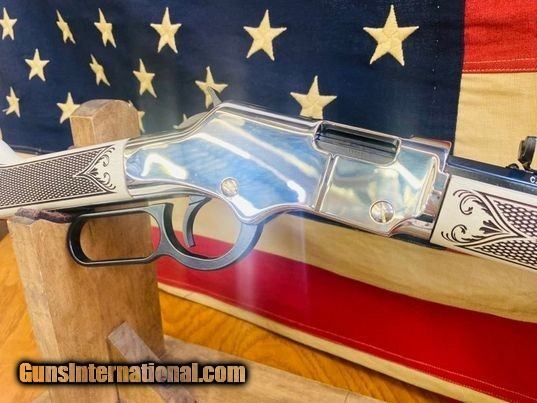 Description: !!!!!!!!!!!PRICE DROP!!!!!!!!!!!!!!!!!!!!!!!! WAS $920 The Henry Golden Boy Silver American Eagle is a Limited Edition Firearm The Henry Golden Boy Silver American Eagle is a limited edition commemorative rifle to honor the American Bald Eagle as the symbol of American Independence. The Henry American Eagle rifle portrays the unique nature of our national bird of prey with a wood finish not found on any of our other offerings, closely mimicking the look of ivory. The rifle is built on the Golden Boy platform featuring a gleaming nickel-plated receiver cover, buttplate, and barrel band. The deeply blued 20" octagonal barrel provides a striking contrast to the ivory and silver, and it's topped with a fully-adjustable semi-buckhorn rear sight with a brass bead front sight. This rifle not only represents a work of art, but it is a functional firearm should you choose to use it. Henry Golden Boy Silver American Eagle Lever Action Rifle (Ivory/Silver/Blued) Specifications and Features: