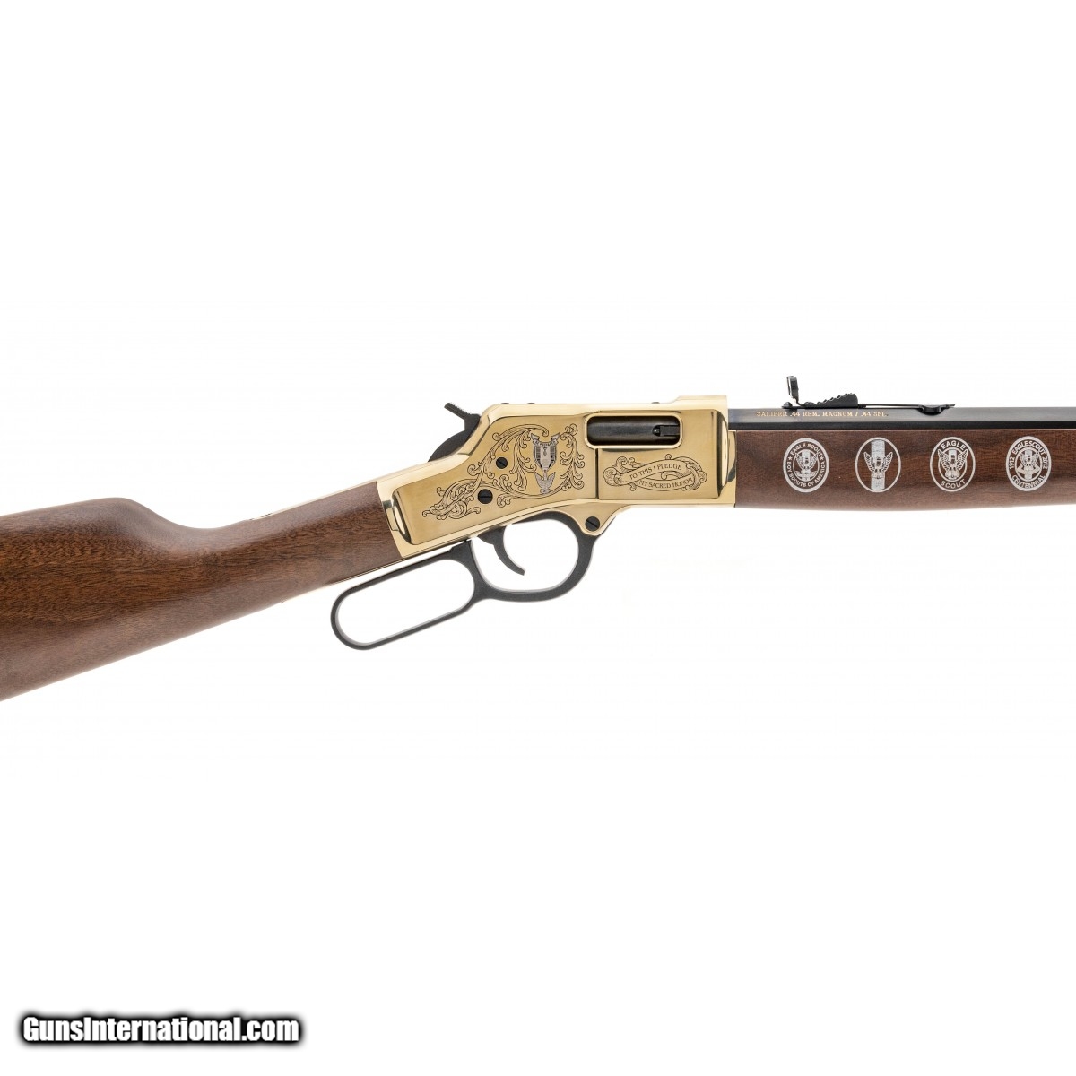 Description: " High-quality Eagle Scout Centennial Tribute lever action. 20-inch octagon blued steel barrel, and a hardened polished brass receiver. American walnut stock. 10-round capacity. NEW. UPC: 619835060174 SOLD |