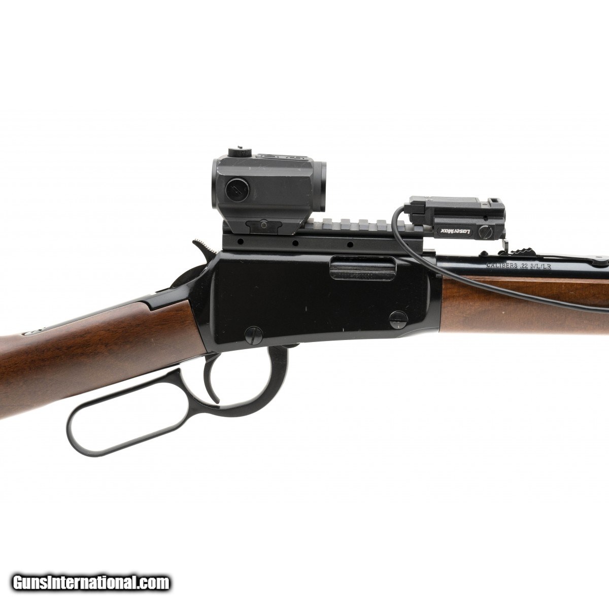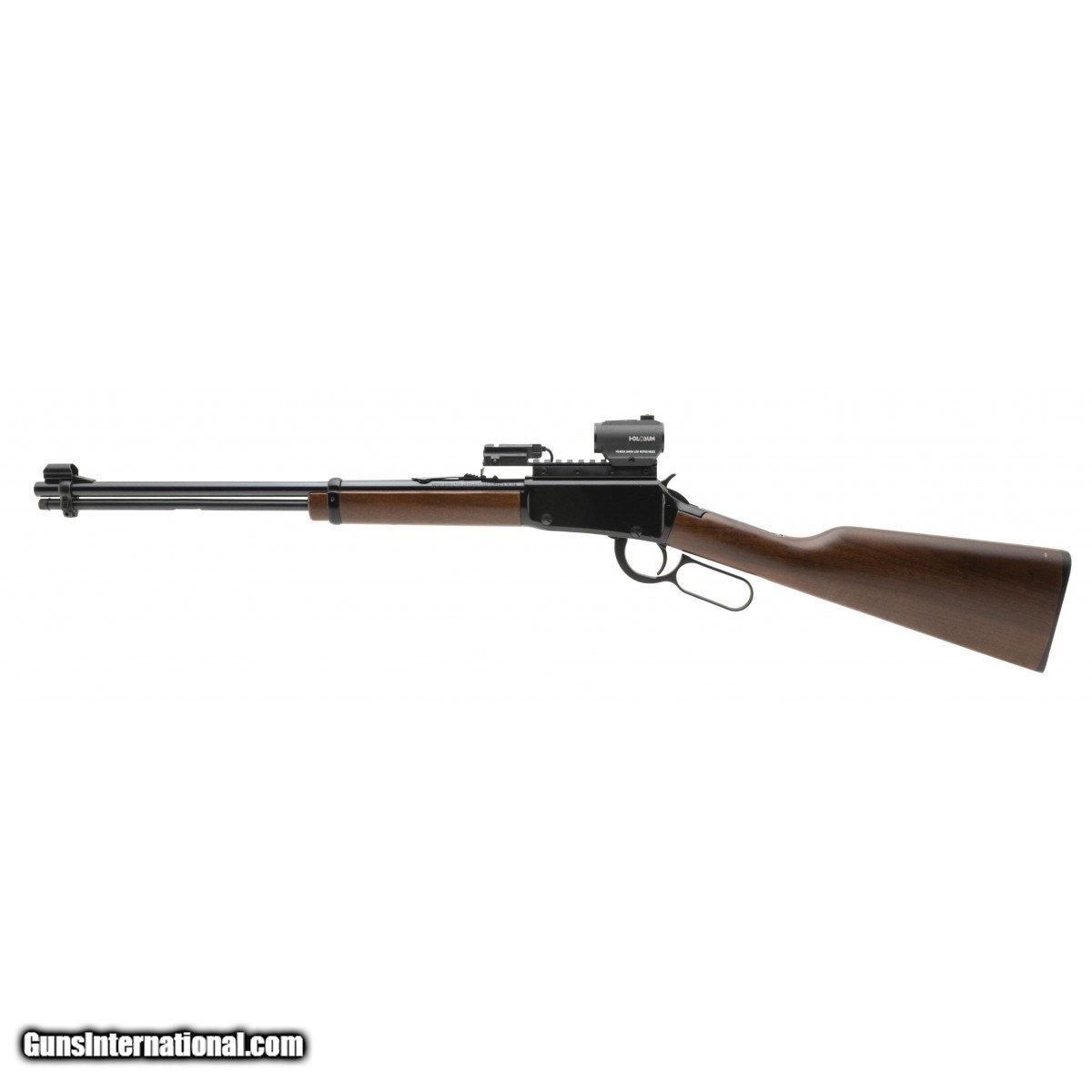 Description: " SN:913318H. Lever action plinking rifle with a hooded front sight, dark wooden furniture, a picatinny rail, Holosun HS402A 2MOA sight, and LaserMax rifle laser with pressure switch. In excellent condition. SOLD |