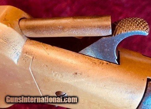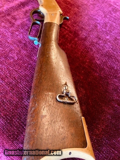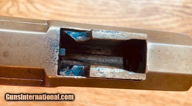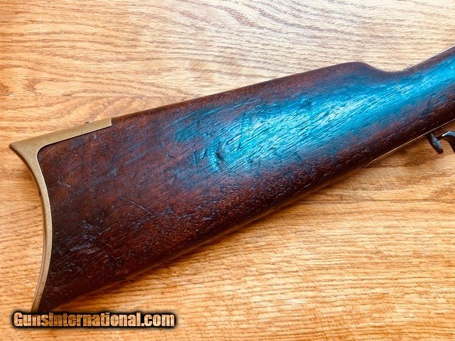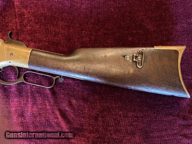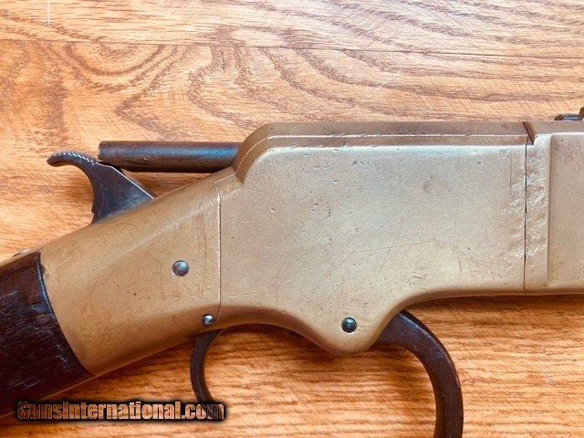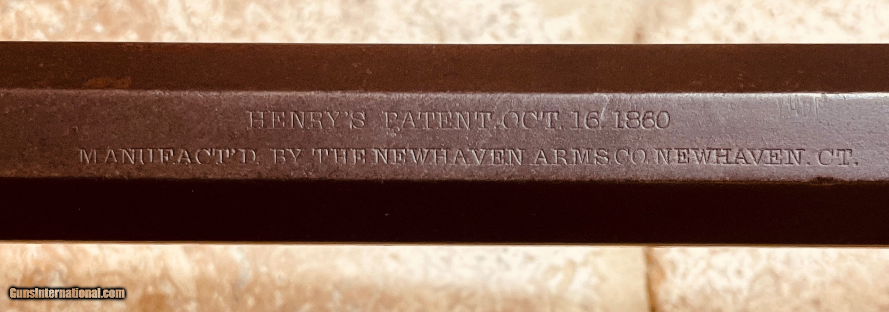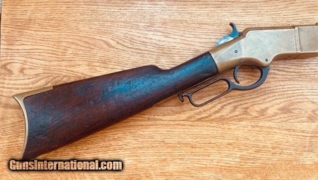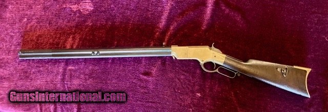 Description: Early Henry rifle patent 1860, from Newhaven Connecticut serial number 9885, manufactured 1865, before the official end of the Civil War. Action functions smoothly clean bore and rifling. Correct swivels with noticeable "Henry Bump" Beautiful rifle with brass that appears to be unmolested and has become a deep mustard color and barrel with a nice brown patina that only time can create. Partial W inspection stamp visible on lower receiver tang. Rifle has a very unique buckhorn rear sight. Cartridge follower, loading gate and spring smoothly functioning. Right side of receiver and left side of loading gate have some small dings. Metal to wood fit is nice, stock has a nice color but definitely shows signs of use as would be expected. All markings on metal or crisp and clean. Overall a very nice Henry rifle. $23950 + actual shipping cost with insurance shipped to FFL of your choice. If you'd like any more information on this rifle or photos please feel free to contact me at 949-873-3788, Michael, Mac Armory SOLD Curio/Relic: Yes Antique: Yes Rifle Caliber: .44 Rimfire Manufacturer: Henry Model: 1860 Serial Number: 9885 Condition: Good Metal Condition: Good Wood Condition: Good Bore Condition: Good Barrel Type: Octagon Action: Lever Stock: Wood Butt Pad: Brass Sights: Buckhorn Manufacture Date: 1865 |