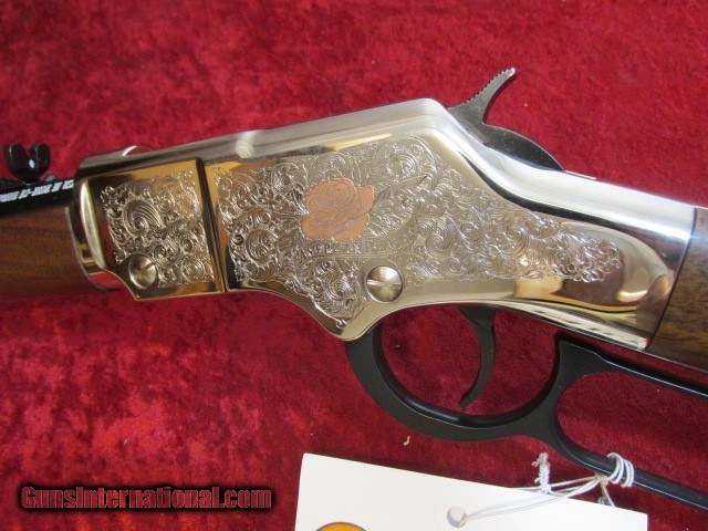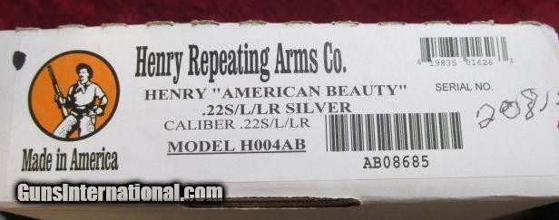 Description: Henry American Beauty Lever Action Rifle .22 s/l/lr Model #H004AB Who says diamonds are a girl's best friend! Brand New in Box Henry American Beauty, lever action rifle, .22 short/long/long rifle, 20" barrel, holds 16 rounds .22 lr, Beautiful American Walnut Buttstock, Nickel receiver, silver barrel band, silver buttplate, & blued lever and barrel, Brass beaded front sight and fully adjustable semi-buckhorn rear sights