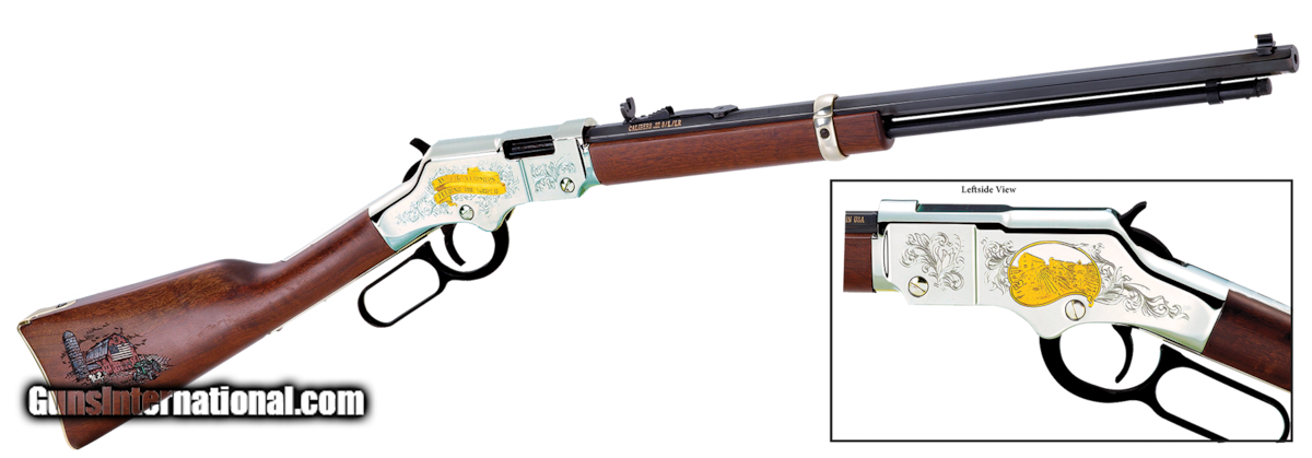 Description: Guns Listing ID: 656853 Henry Tribute Editions are lever action rifles designed to commemorate organizations such as the Shriners Fraternal Order of Eagles and the military and other groups including American farmers truckers and coal miners. A Tribute Editions American walnut stock is typically laser etched or hand-painted to depict the institution it commemorates and its engraved receiver may be plated with 24K gold. Henry Tribute Editions are built on the Golden Boy or Big Boy platform and accordingly feature an octagonal blued steel barrel adjustable buckhorn sights and tubular magazine. DETAILS Action Lever - Caliber .22 SLLR - Capacity 16 LR 21 S - Stock American Walnut - Sights Adj Semi Buckhorn Beaded - Finish Nickel Blued - Barrel Length 20 - Overall Length 38.5 - Weight 6.75 lb We salute the American Farmer with this tribute edition featuring detailed scenes of farming life etched into the receiver and splashed with gold, with additional images lovingly carved into the American Walnut stock. It’s a .22 caliber work of art to carry, use and display with pride, carrying our message of heartfelt gratitude to a hundred generations, past and present, who feed our world. SOLD Manufacturer: HENRY Model: AMERICAN FARMER TRIBUTE Caliber Info: .22 S/L/LR Condition: new Barrels: 20 BARREL |