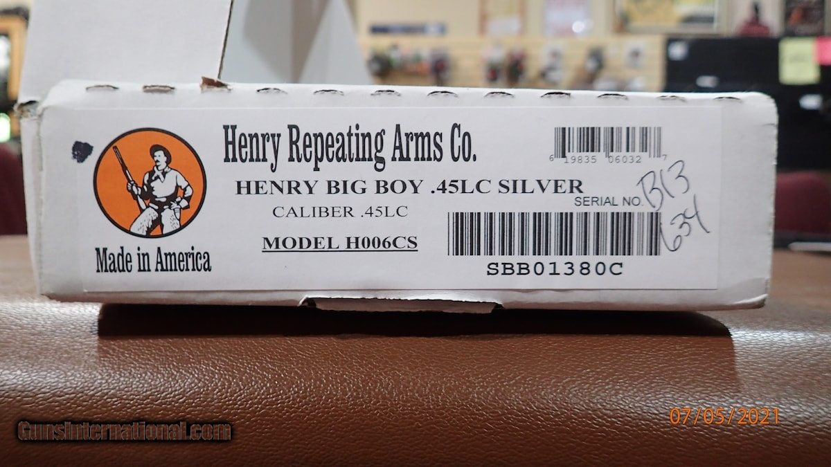 Description: Guns Listing ID: 270398 On consignment from a client SOLD Manufacturer: HENRY Model: BIG BOY SILVER Caliber Info: .45 LC Condition: Used - Non-Certified Barrels: 20" BARREL |