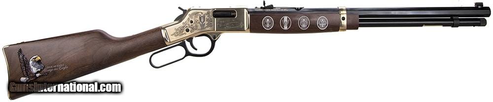 Description: Guns Listing ID: 297721 Each Big Boy Eagle Scout Centennial rifle showcases this historic milestone with etching on the solid top brass receiver as well as the straight grip American walnut stock and forend. The receivers right side is etched with a selectively nickel plated Eagle Scout Award Medal bracketed by Americanstyle scroll pattern and a banner reading TO THIS I PLEDGE MY SACRED HONOR\" the closing line of the pledge recited to every Eagle Scout at his Eagle Court of Honor. A black fill is baked into the side of the brass receiver to highlight the design. The left side of the receiver is etched with a selectively nickel plated official BSA Eagle Scout 100th Anniversary commemorative logo. Also etched and blackfilled into the receiver are the American scroll pattern and a banner with the words \"BOY SCOUTS OF AMERICA.\" The forearms right features the four designs of Eagle Scout badges in laser scrimshaw style and hand painted in a nickel coloring. The right side of the stock is a laser etched and hand painted rendering of a soaring eagle a Bald Eagle with an enduring gaze and the words \"ONCE AN EAGLE ALWAYS AN EAGLE\" an iconic expression reminding Eagle Scouts that the spirit of the Eagle Scout Award is one demonstrated with honor and conviction throughout life. This special Henry Big Boy Eagle Scout Centennial Rifle is a symbol of American Pride a reminder of youthful success and a commitment in adulthood to the ideals of the Scout Oath and Scout Law. It has a 20\" blued octagon barrel brass buttplate and barrel band as well as a Marbles fully adjustable semibuckhorn rear sight with a reversible white diamond insert and brass beaded front sight.\ SOLD Manufacturer: HENRY Model: BIG BOY Caliber Info: .44 S&W SPECIAL Condition: new Barrels: 2 BARREL Finish: BROWN |
