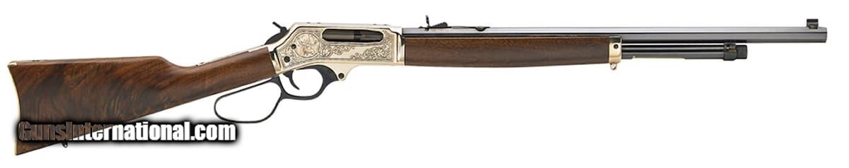 Description: Guns Listing ID: 278519 The Brass Wildlife rifle features a octagon barrel smooth action highpolished metalwork American walnut furniture and fullyadjustable buckhornbead sights. Other features include a highly engraved frame that features an American vine scroll and braided borders surrounding the portrait of a stately bucks head on the right side panel. This rifle is chambered in .4570 Government. SOLD Manufacturer: HENRY Model: BRASS WILDLIFE Caliber Info: .45-70 GOVT Condition: new Barrels: 22 BARREL Finish: BROWN |