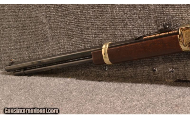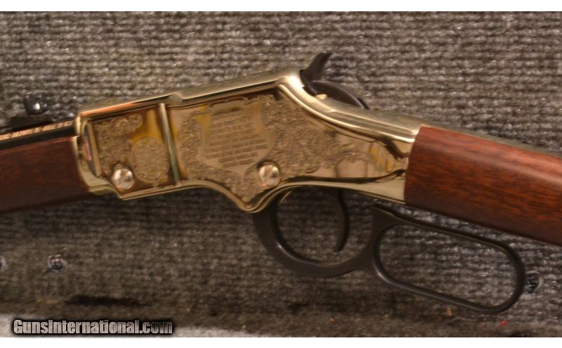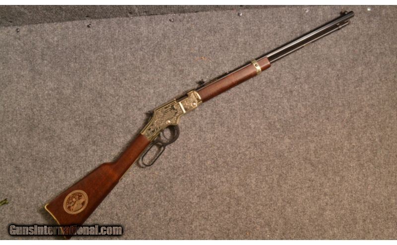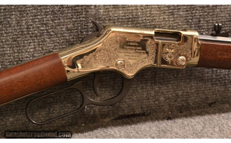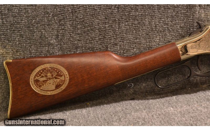 Description: Cambered in 22lr this Henry Golden Boy is the Boy Scouts of America Centennial Edition. With blued octagonal barrel it marks the centennial anniversary of the Boy Scouts with the Scout Oath, Scout Law, Scout logo and engraved stock. SOLD Caliber Info: .22 lr. Chambers: Lever action repeater. Metal Condition: Excellent no marks on bluing. Wood Condition: Excellent no marks. Bore Condition: Shiny. Barrels: 20 inch octagonal. Triggers: Single blued steel. Stock: Wood. Stock Dimensions: LOP: 14 inch. Fore End: Wood gold barrel band. Butt Pad: Crescent gold steel. Weight: 7 Lbs. Sights: Front: gold bead rear: adjustable buckhorn. Extras: Box. Item Location: Thornton, CO |