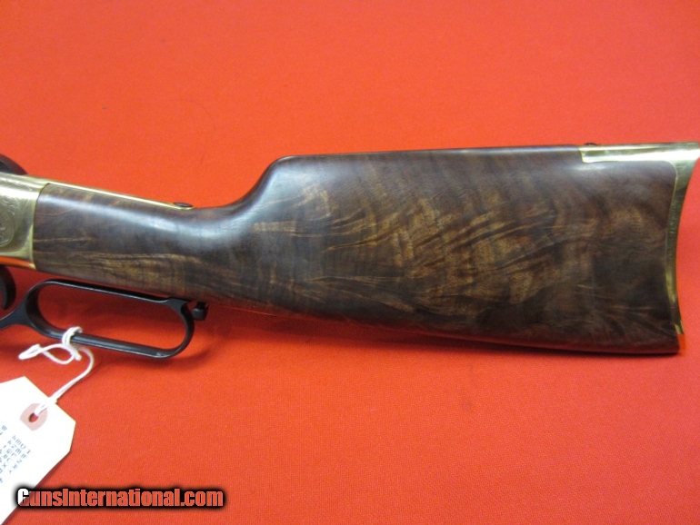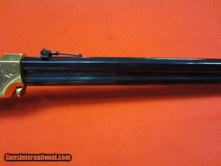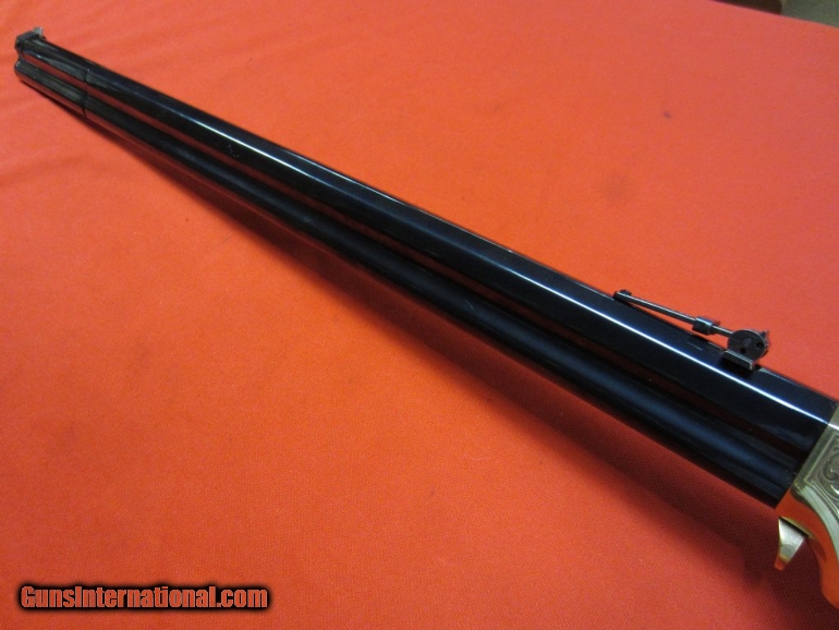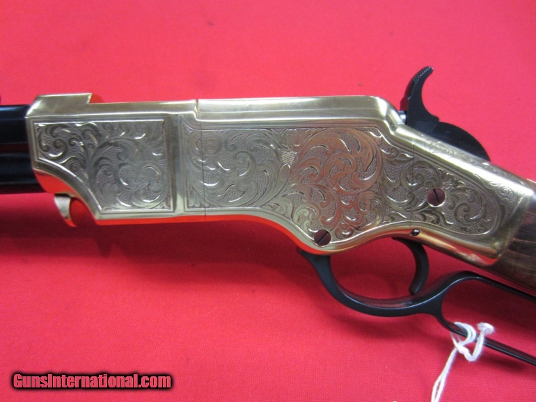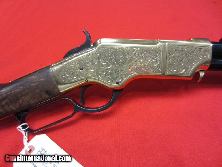 Description: Henry Deluxe Limited Edition 44-40 (UNFIRED)-- Line by line copy of the original Henry Rifle designed by Benjamin Tyler Henry in 1860. Limited to 1000 units. Features deluxe fancy American walnut buttstock with hardened brass buttplate and deluxe engraving on hardened brass receiver. Blued steel barrel. Folding ladder rear sight; blade front sight. Chambered in .44-40. This is a second-hand gun that remains unfired. NO BOX SOLD |