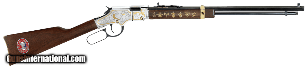 Description: Guns Listing ID: 50733 Since its inception in 1911 the rank of Eagle Scout has represented the pinnacle of Scouting. Awarded to a select few young men who have demonstrated the highest levels of leadership and commitment to duty the distinctive red-white-and-blue Eagle Scout badge distinguishes those dedicated scouts as truly the best of the best. The honored title of Eagle Scout is held for life and those that obtain it are expected to become leaders in whatever pursuit they choose. The gleaming nickel-plated receiver is adorned with spectacular engraving hand cut by Henry engraver Rob Bunting. The right side is highlighted by the image of a majestic bald eagle accented by distinctive American scrollwork and a banner proclaiming the proud sentiment of all Eagle Scouts: Once an Eagle, Always an Eagle. The left side bears the image of the famous Eagle Scout™ medal and banners reading Eagle Scout and Boy Scouts of America. The engraved images on both sides and the winged leaf border are selectively plated with brilliant 24-karat gold.A tri-colored medallion replicating the Eagle Scout™ badge is inserted into the richly grained American walnut stock. The six badges of advancement which mark a scout’s advancement to the Eagle Scout rank and the text Trail to Eagle are inscribed on the right side of the forearm and hand painted with gleaming gold fill. SOLD Manufacturer: HENRY Model: EAGLE SCOUT TRIBUTE Caliber Info: .22 S/L/LR Condition: new Barrels: 2 BARREL |