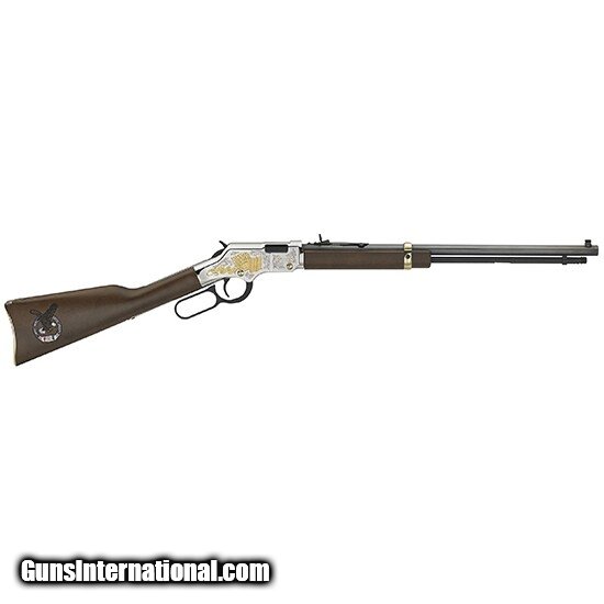Description: Guns Listing ID: 376005 Henry Tribute Editions are lever action rifles designed to commemorate organizations such as the Shriners Fraternal Order of Eagles, the military and other groups including American farmers, truckers, and coal miners. A Tribute Editions American walnut stock is typically laser etched or hand-painted to depict the institution it commemorates, and its engraved receiver may be plated with 24K gold. Henry Tribute Editions are built on the Golden Boy or Big Boy platform and accordingly feature an octagonal blued steel barrel adjustable buckhorn sights and tubular magazine. Details Action Type Lever Action Repeater - Caliber .22 S/L/LR - Capacity 16 rounds .22 LR, 21 rounds .22 Short - Length 38.5" - Barrel Length 20" - Weight 6.75 lbs. - Stock American Walnut - Sights Fully adjustable semi-buckhorn rear with reversible white diamond insert and brass beaded front sight - Finish Nickel receiver brasslite barrel band brass buttplate blued lever and barrel Over 115 years ago the Fraternal Order of Eagles was founded to speak out against injustice seek truth and promote peace and equality. It has since grown to over 800,000 members across the U.S. and Canada who unite through the 1500 plus aeries to raise millions of dollars for charities and local communities. The international non-profit organization which has included six former U.S. presidents is a driving force behind rectifying social issues which has led them to found the Social Security Program Mothers Day and keeping the Ten Commandments in public places to act as a moral compass. Henry Repeating Arms is pleased to offer the Fraternal Order of Eagles Tribute Edition rifle and support their charitable endeavors by giving a royalty to the organization for each gun sold. The glistening nickeled receiver displays a 24K gold-plated U.S. flag waving in the breeze on the main panel of the receivers right side. Flowing back from the flags lower-left corner is a banner-scroll also with 24K gold plating that contains F.O.E.s slogan People Helping People with one word in each banner section. Set in among the American vine leafy scrollwork are the initials FOE with the F and E finished again in 24K gold plate. An eagle with its wings spread wide and talons extended dominates the opposite side of the receiver in the panels center section. Looking as though its coming in for a landing the Eagles talons are about to grab a flowing banner-scroll that extends back toward the stock. Inscribed in the banner are the words Liberty Truth Justice Equality each in a separate fold of the scroll. The eagle and entire banner-scroll are 24K gold pated and the unique leafy-scroll designs border the top and underside of the eagle and banner engraving. A three-level banner scroll contains the words Fraternal Order Of Eagles in a vertical format on the smaller panel to the front of the eagle. The F.O.E.s symbol of an attacking eagle within a circle is laser engraved and then hand-painted on the Golden Boys American Walnut stock. On the circles sides but within its borders are the words Liberty Truth Justice Equality. On the circles bottom are the initials F.O.E. This fully functional work of art sports an iconic 20 blued steel octagonal barrel semi-buckhorn rear sights with a brass bead front sight and matching brass buttplate and barrel band. Its chambered in .22 SLLR with a capacity of 16 rounds of .22 LR and as much as 21 rounds of .22 Short. This tribute rifle is built on the awar SOLD Manufacturer: HENRY Model: FRATERNAL ORDER OF EAGLES TRIBUTE Caliber Info: 22 S/L/LR Condition: new Barrels: 20" barrel Finish: BLUED |