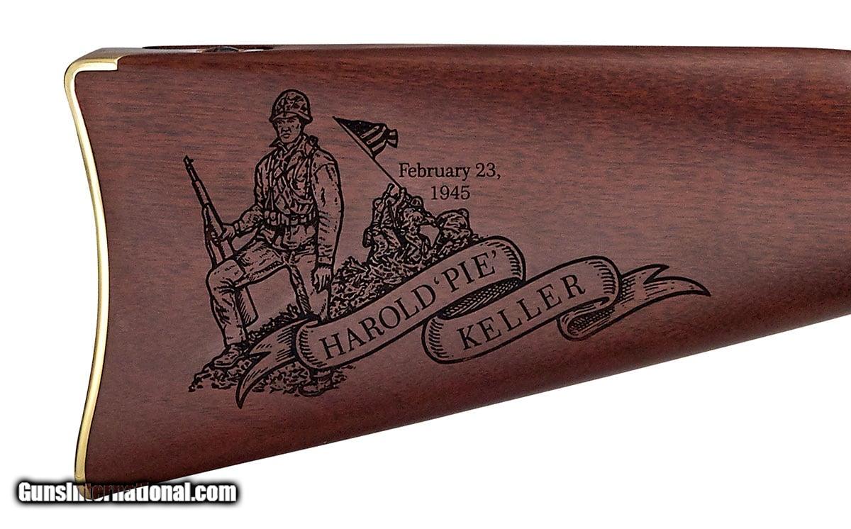 Description: Guns Listing ID: 504125 The Pie Keller Memorial rifle features a custom engraved genuine American walnut buttstock depicting a triumphant Keller at the summit of Mount Suribachi, rifle in hand, with his fellow Marines in the background lifting the American flag as seen in Rosenthal’s famous image. The date, “February 23, 1945,” is etched above the design and a flowing scroll banner below contains Keller’s name. Built on Henry’s Golden Boy platform, the .22-caliber rifle also features a Brasslite receiver cover, barrel band, and buttplate with a 20” blued steel octagon barrel. - CALIBER .22 LR - MAGAZINE TUBE 16rd capacity - SIGHTS Fully Adj. Semi-Buckhorn w/ Diamond Insert, Brass bead front SOLD Manufacturer: HENRY Model: GOLDEN BOY 22 LR PIE KELLER Caliber Info: .22 LR Condition: new Barrels: 20" BARREL Finish: BLUED |