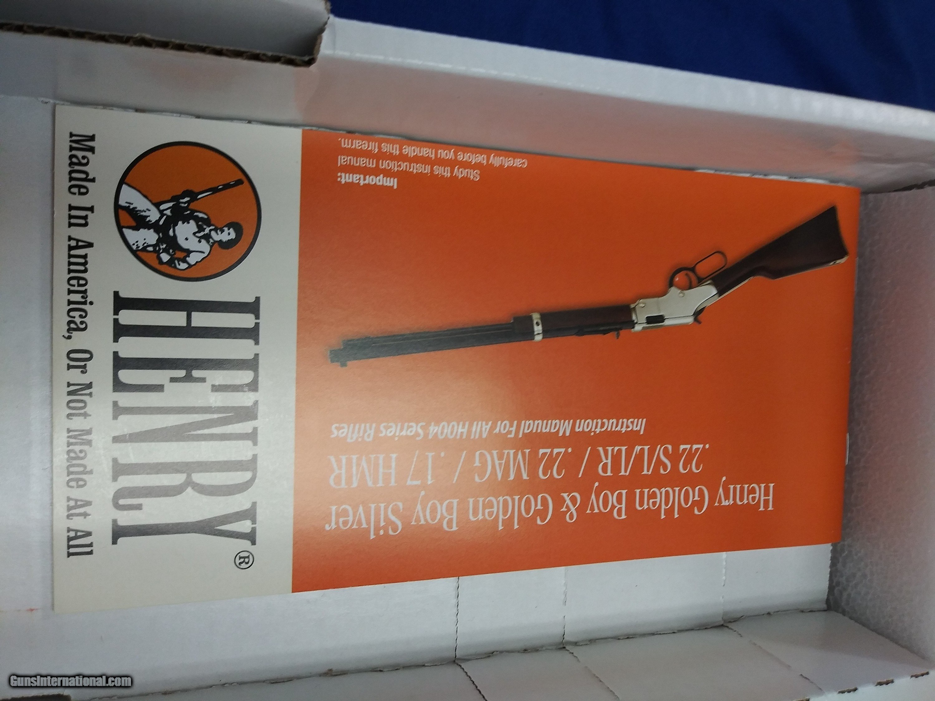Description: NEW IN BOX. Henry Model H004 "Golden Boy" lever action rifle, 22 S,L,LR. NEW IN BOX, READY TO SHIP. $535 includes shipping to FFL Only SOLD Rifle Caliber: .22 Long Rifle Manufacturer: HENRY Model: H004 Barrel Length: 20 IN Condition: NEW |