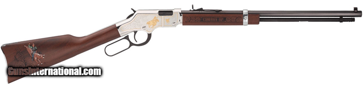 Description: Guns Listing ID: 354494 The American Rodeo Tribute Edition rifle is built on the award-winning Golden Boy platform featuring a strikingly engraved nickel plated receiver cover with 24K gold plated highlights. The right side features an image of a cowboy roping a calf while his lasso continues from one panel to the other. In the background of the right-rear panel, a crowd of cowboys is gathered at the fence to cheer on their buddy. On the left side, the words "Rodeo Tribute" are prominent, with some leafy-vine scroll engraved in the upper-left and lower-right corners. Both cowboy figures are 24K gold plated, as is the panels border. SOLD Manufacturer: HENRY Model: Golden Boy Condition: new Barrels: 20" barrel |