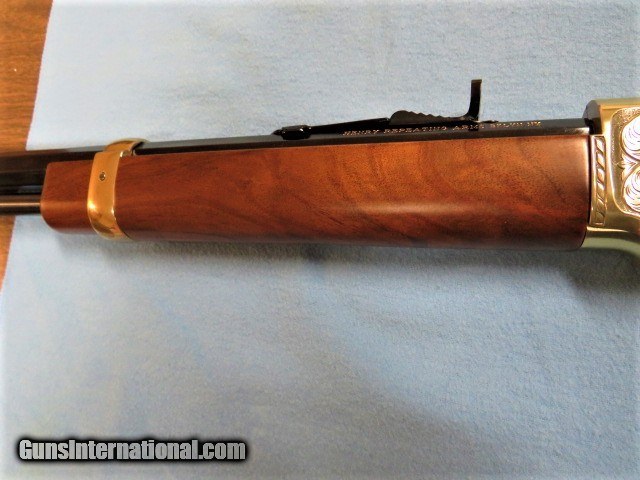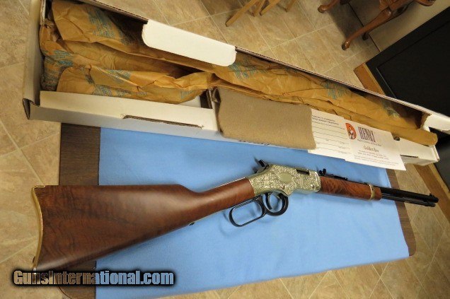 Description: SALE PENDING - Henry Golden Boy Deluxe 22 LR, item code H004DD. Gun has polished blue, 20-inch octagon barrel with hand-engraved brass receiver; brass carbine butt plate. Buttstock and forearm are made of fancy walnut that show excellent grain and color. There are two fine scratches, on top of the blue surface on a barrel flat on the right side of this rifle. They are not through the finish and do not show in pictures. No other marks on this gun. Gun has not been fired beyond factory test. The original box with correct serial number, cloth receiver sock, manual and warranty card are provided. Box is clean and complete but shows some storage stress and tape on the right end flap. Shipping/insurance is included in the purchase price; item will be shipped by an FFL. FFL of receiver is required. Please do not attempt to purchase this item if the laws of your state prevent transfer to you. SOLD Rifle Caliber: .22 Long Rifle Manufacturer: Henry Model: Golden Boy Barrel Length: 20 Condition: Excellent Metal Condition: Excellent Wood Condition: Excellent Bore Condition: Excellent Barrel Type: Octagon Action: Level |