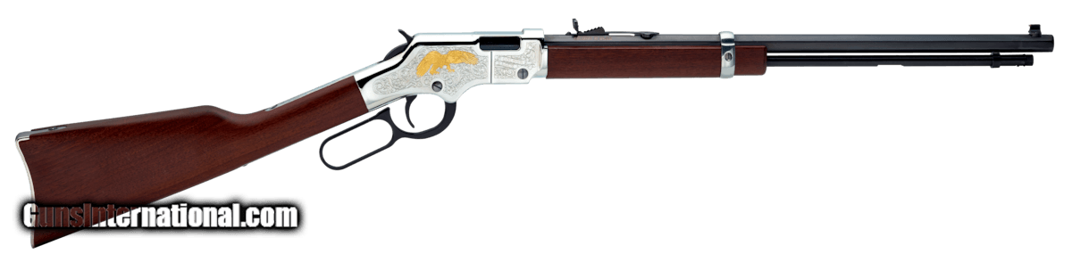 Description: Guns Listing ID: 409901 The Golden Eagle comes with a blued octagon barrel buck and bead adjustable sights select American Walnut furniture 16round magazine capacity. Other features include a brightly polished nickeled frame that is set off by a slightly darker immediate background for its eagle. The Golden Eagle uses highrelief 24K gold Lefthanded shooters can safely use our lever action rifles to make its image pop in a more fullyengraved background along with the words Golden Eagle in banners in an engraved panel on both sides. SOLD Manufacturer: HENRY Model: GOLDEN EAGLE Caliber Info: .22 SHORT Condition: new Barrels: 20 BARREL Finish: BROWN |