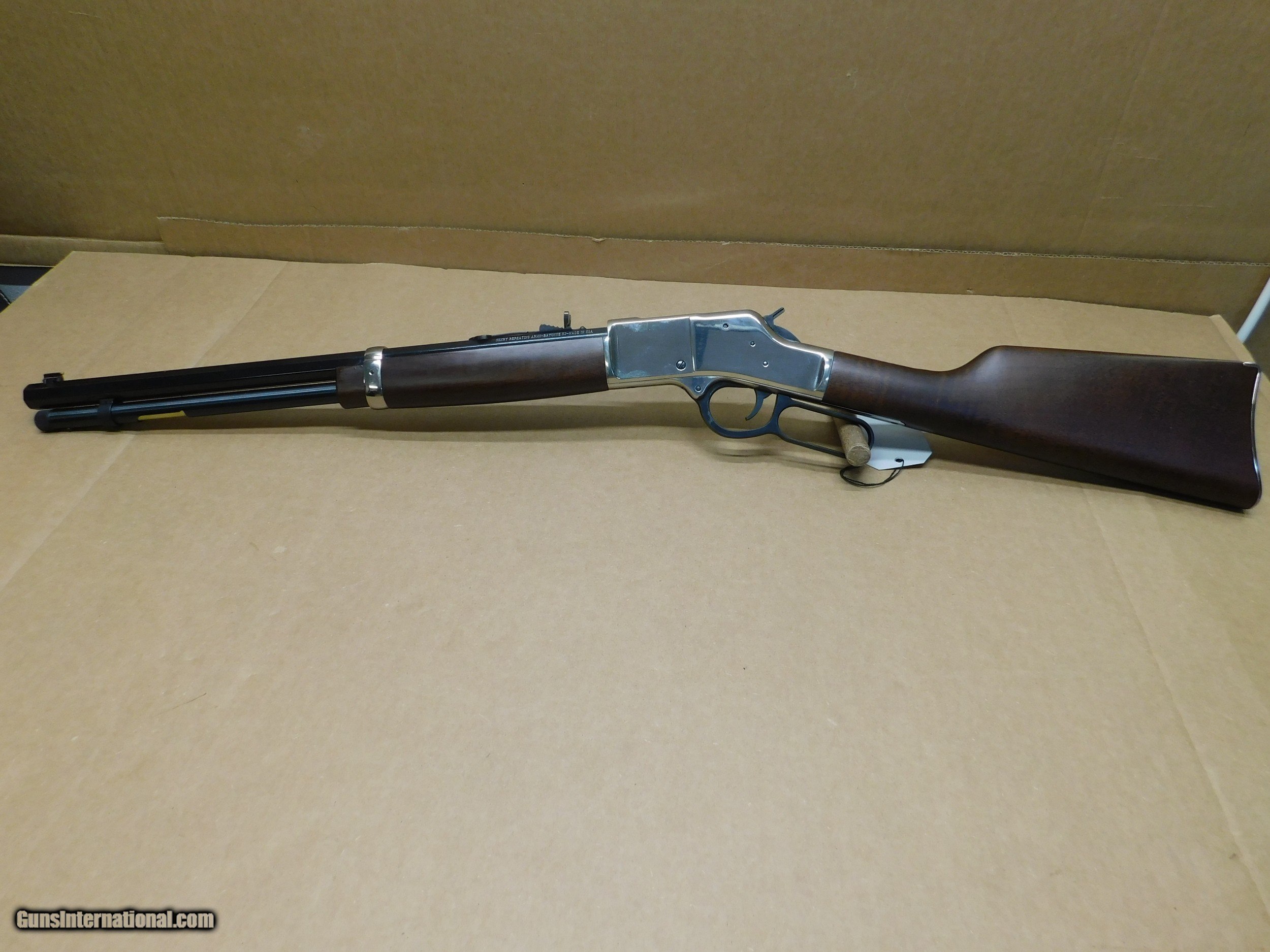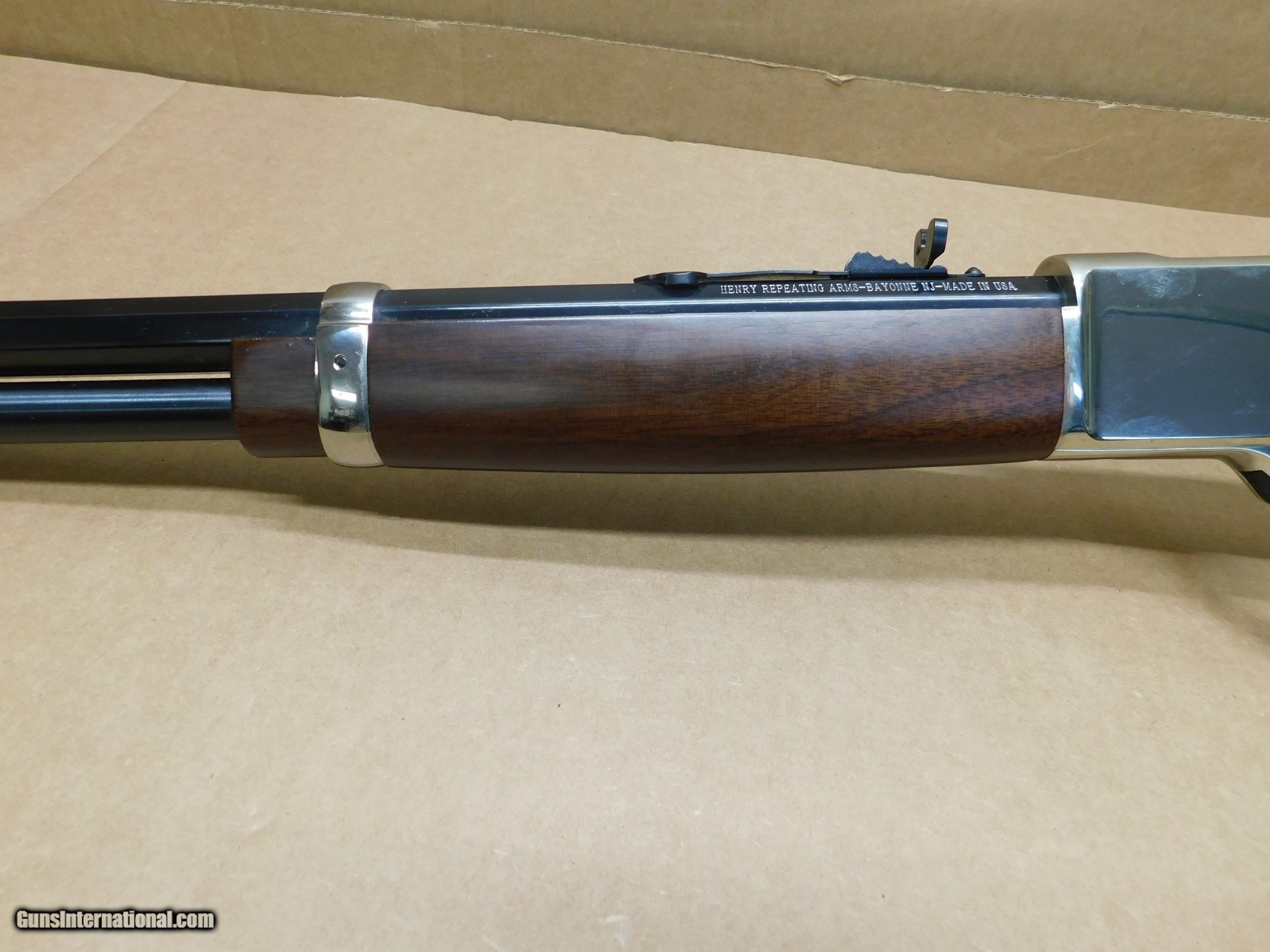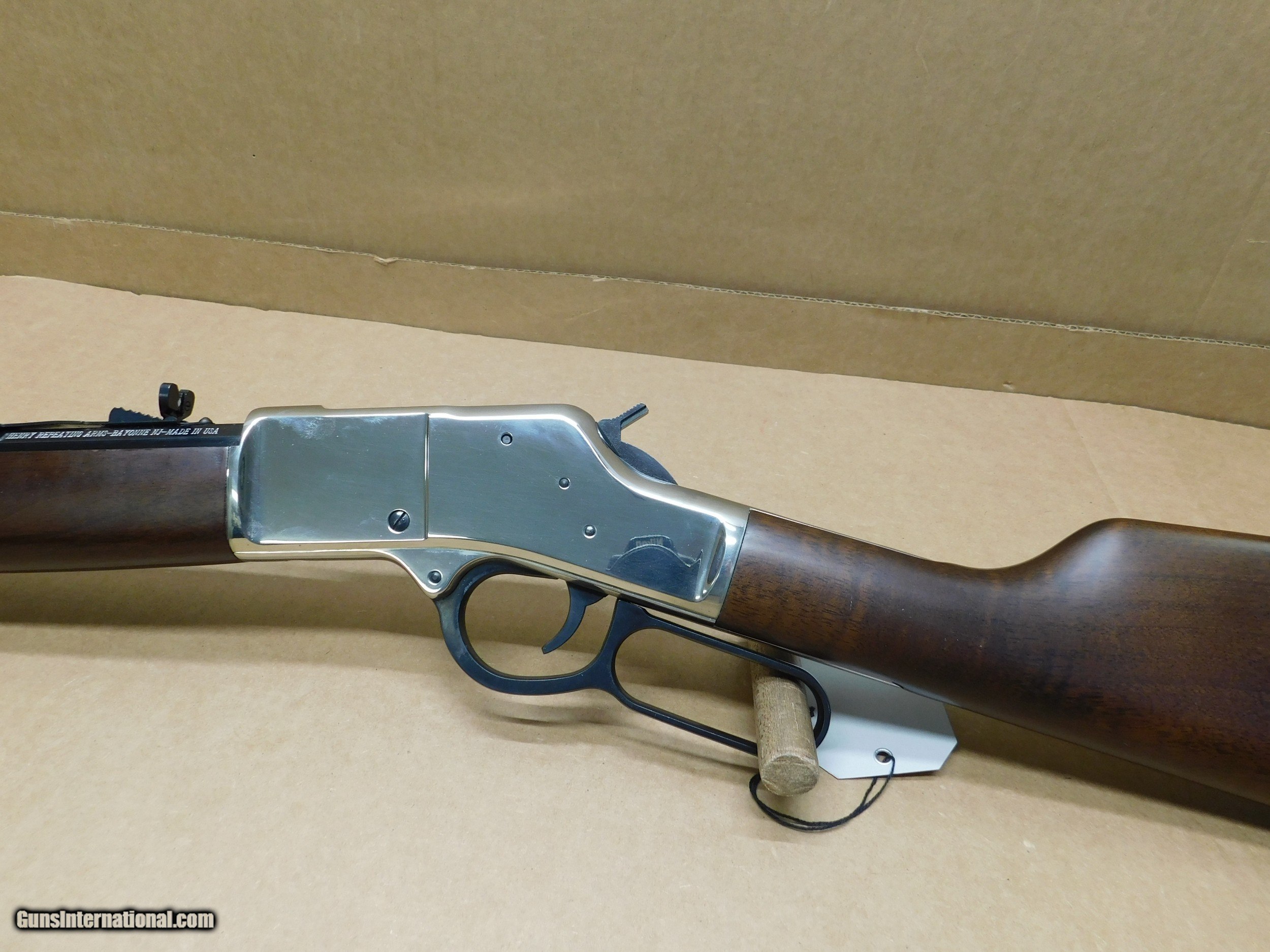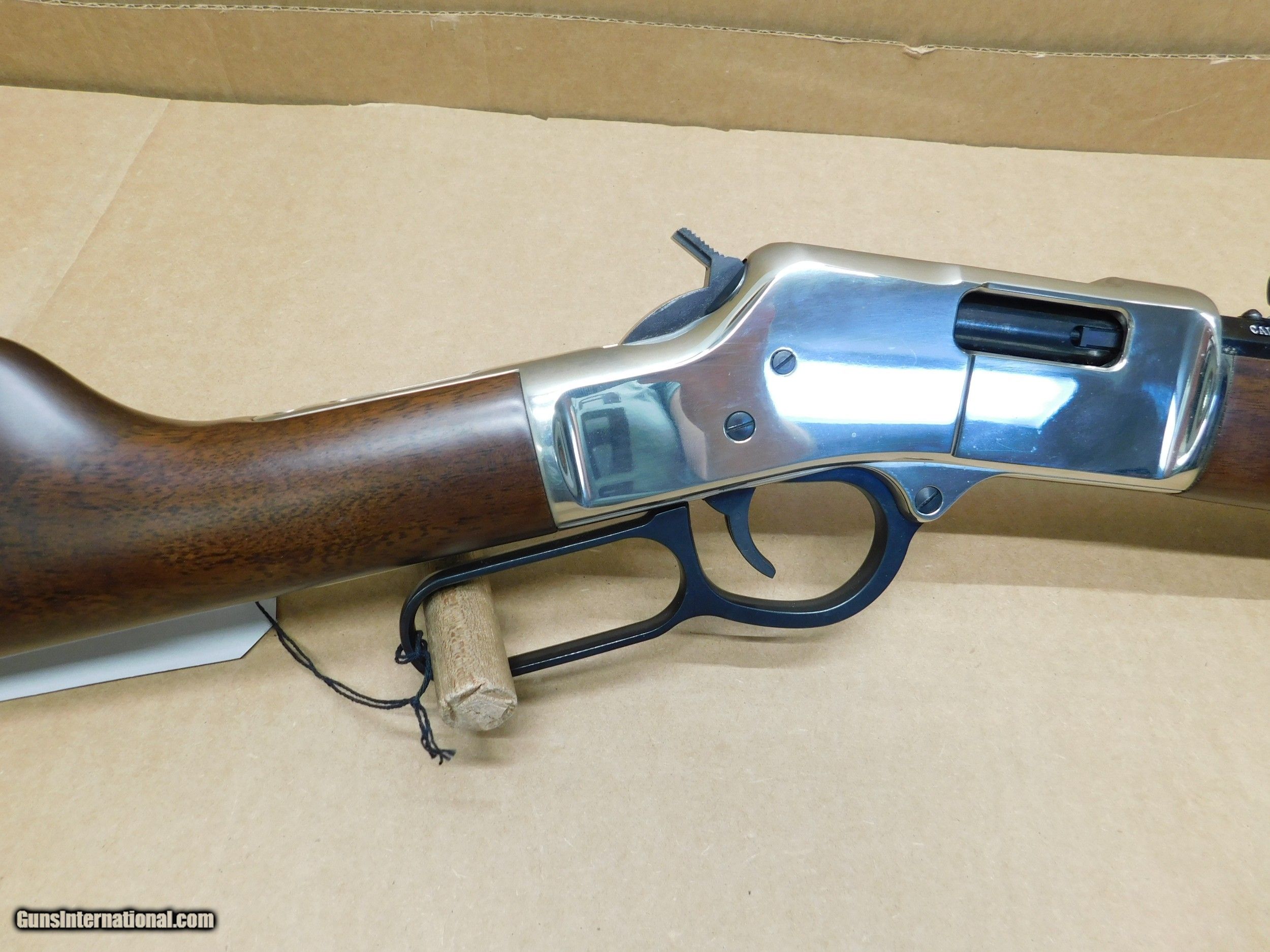 Description: This is a new in the box Henry H0065 lever action 44 mag rifle It is a 5+1 shot with a 20" blue /silver barrel "Silver Big Boy" SN-SB00954 SOLD Rifle Caliber: .44 Magnum Manufacturer: Henry Model: H0065 Serial Number: SB00954 Barrel Length: 20 Condition: Unfired/factory new Metal Condition: Excellent Wood Condition: Excellent Bore Condition: Excellent Barrels: Blue Barrel Type: Round Action: Lever Stock: Wood Finish: Blue Extras: "Silver Big Boy |