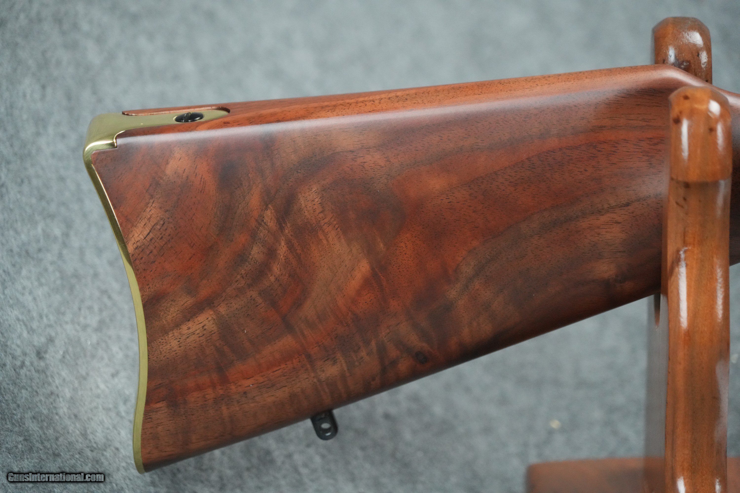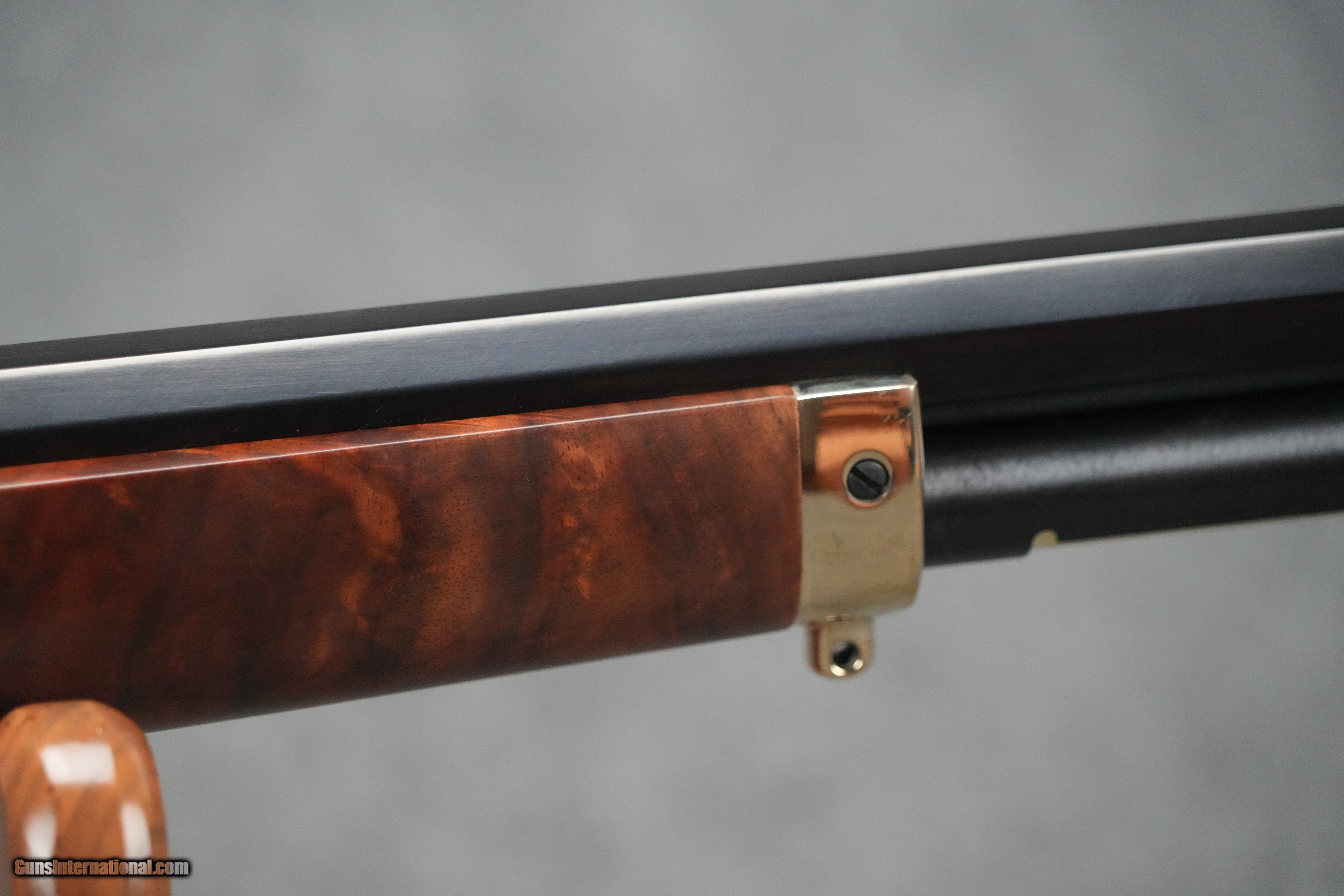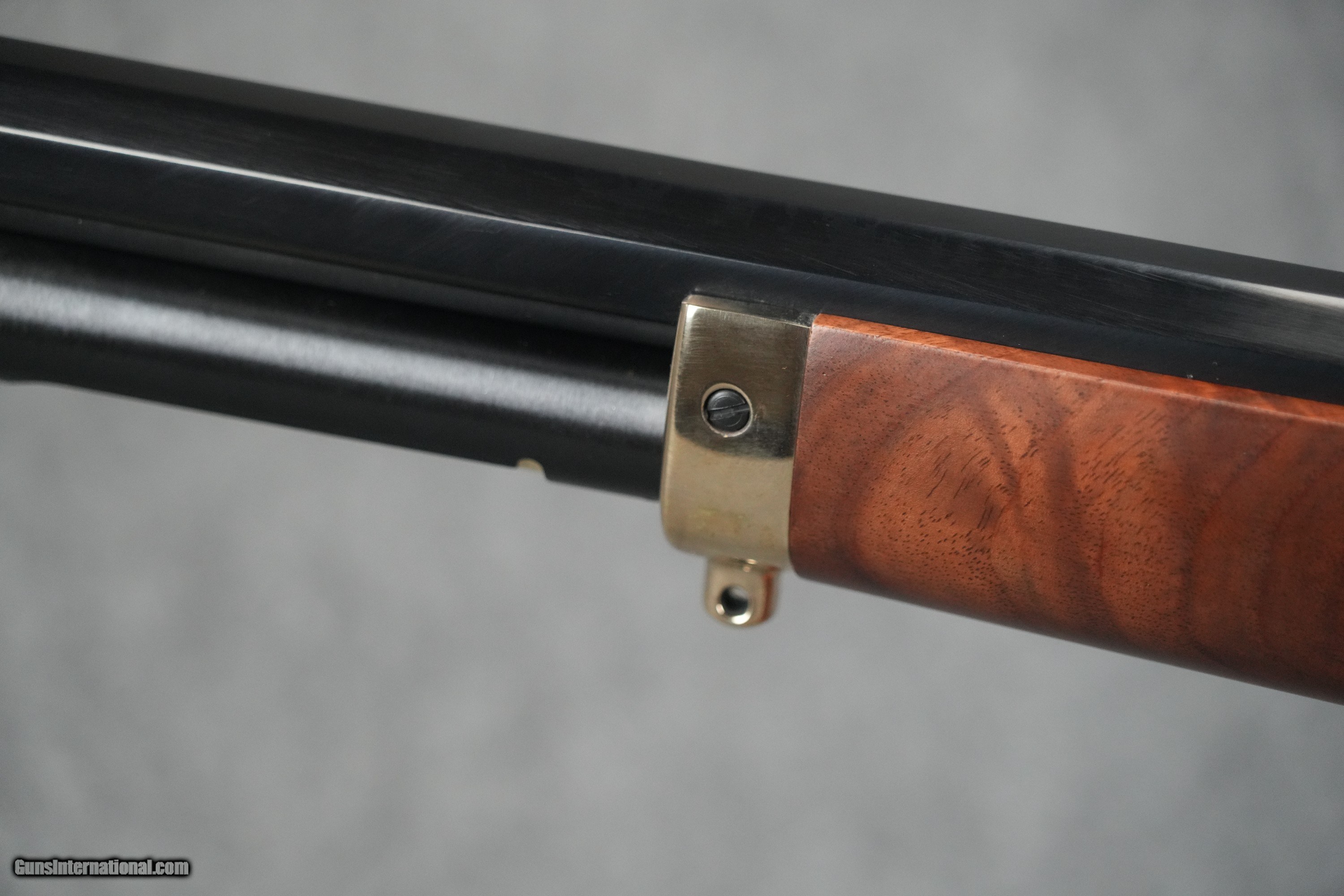 Description: Since the earliest days of American colonization, through the inevitable expansion of the Frontier driven westward by explorers, adventurers, and settlers, and on to modern times, the rifle has played a vital role in a part of life as old as mankind himself. Hunting to survive made it possible for Daniel Boone to become a legendary figure in blazing his Wilderness Road through the Cumberland Gap across the Appalachians into Kentucky in 1775, Lewis & Clark to travel 8,000 miles primarily on foot through unknown territories in 1804, for John Wesley Powell’s 1869 expedition mapping the Colorado River as the first non-natives to travel through the Grand Canyon, for the small homestead farmers of the great Oklahoma Land Rush of 1889 to establish and build on their claims, and for countless men to feed their families through the dark days of the Great Depression of the 1930s. Regardless of wealth or social status, hunting is an American tradition shared by all levels of society, and Henry Repeating Arms tips a hat to that tradition in these brass-framed, side-loading Wildlife editions. Big-bore hunters tracking bigger game can step up to four of the hard-hitting .45-70 bulldozers in the H010BGWL’s 22” octagon barrel. Where more steam might be needed, the .45-70 undeniably provides it, and the engraving, black-filled to bring out detail as it is on both brass Wildlife models, reflects that with American vine scroll and braided border again, surrounding on the right side a detailed depiction of a moose head in a circular setting, and on the left, a bear in an oval outline. And this model adds a larger lever loop for gloved use to the package. Travel with style on your next hunt, and take us with you. Barrel Length22" Barrel Type Octagon Blued Steel Rate of Twist 1:20 Overall Length 41.1" Receiver Finish Polished Hardened Brass Rear Sight Fully Adj. Semi-Buckhorn w/ Diamond Insert Front Sight Brass Bead Scopeability Drilled and Tapped Stock Material American Walnut Buttplate/Pad Brass Length of Pull 14" Safety Transfer Bar Best Uses Target/Hunting/Collector Embellishments/Extras Bear and Moose Receiver Engraving, Large Loop Lever, Side Loading Gate, Sling Swivel Studs SOLD Rifle Caliber: .45-70 Government Manufacturer: Henry Repeating Arms Model: Brass Wildlife Edition Barrel Length: 22" Barrel Condition: BRAND NEW |