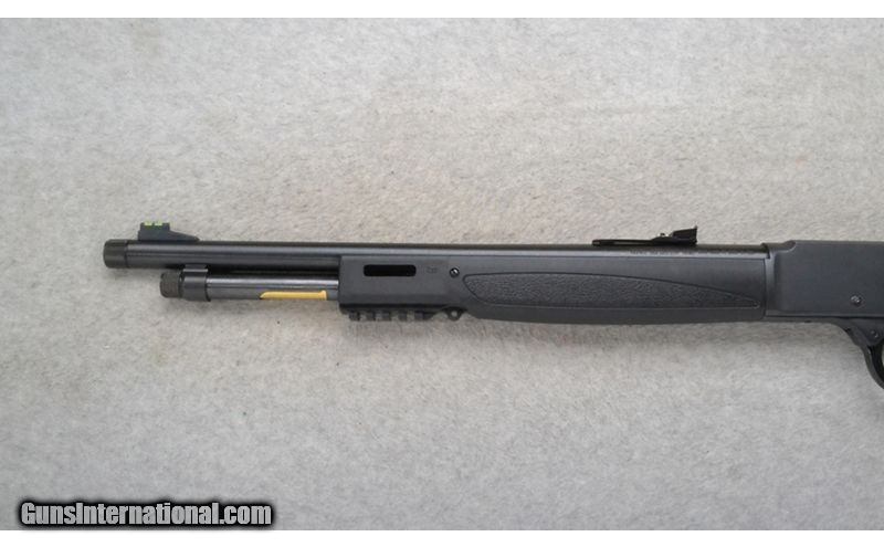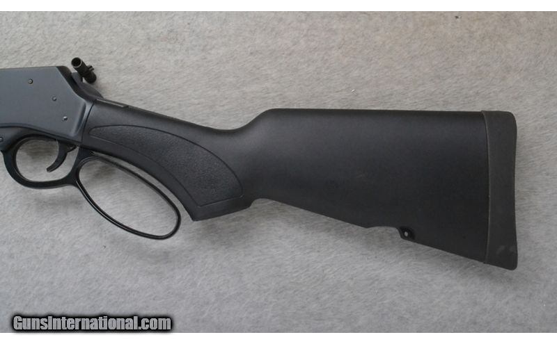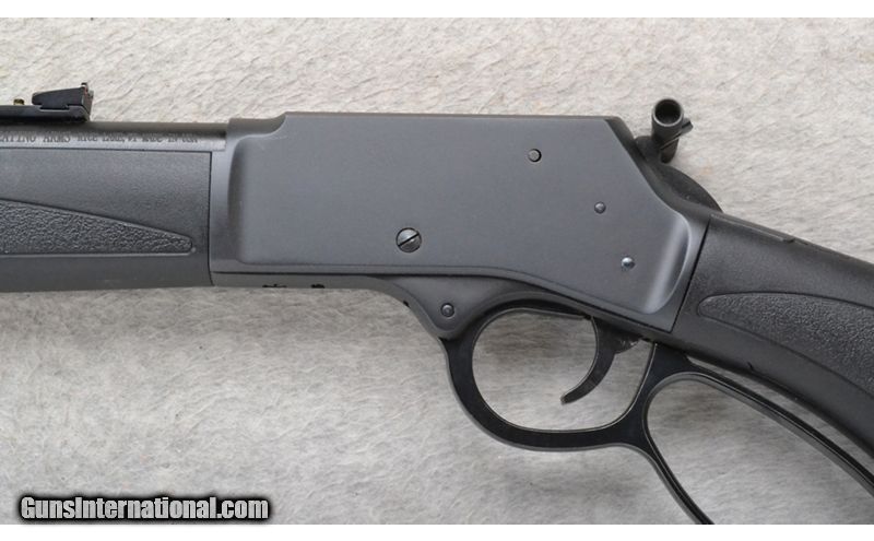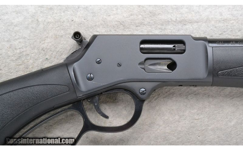 Description: This Henry Model H012CX is a right hand lever action repeating rifle in .45 Long Colt Cal. It has a 17.5 inch barrel. A blade front sight with green high visibility and an adjustable notch middle sight with red high visibility. The butt stock is a textured grip black polymer pistol grip. The forearm is a textured grip black polymer with a molded bottom accessory rail. .45 Long Colt SOLD Chambers: Tube magazine. Metal Condition: Excellent. Minor scratch on the receiver right side. Bore Condition: Excellent. Barrels: 17.5 inch. Stock Dimensions: LOP 14 1/4 inches. Fore End: Textured grip black polymer with side vent holes and a molded bottom accessory rail. Butt Pad: Henry black rubber recoil pad. Weight: 7 lb. 0 oz. Sights: Raised blade front with green high visibility. Adjustable notch middle with red high visibility. Item Location: Richfield, WI |