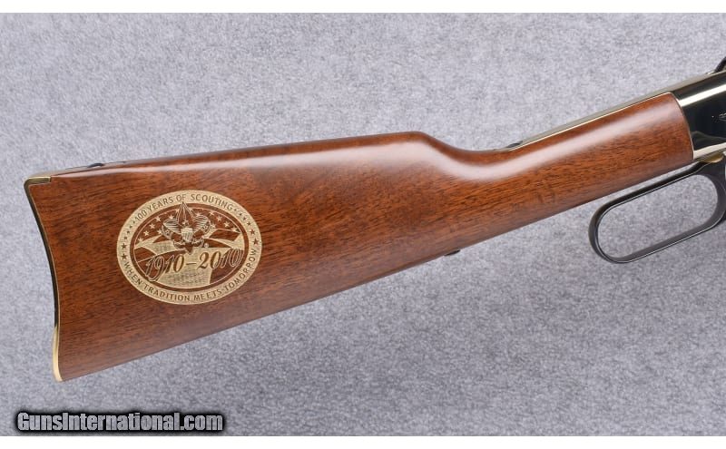 Description: Henry Repeating Arms Boy Scouts of America® Centennial Edition rimfire rifle offers a specially engraved receiver and stock. Pre-owned, slight chip on the upper tang otherwise excellent in factory box. .22 Long Rifle SOLD Metal Condition: "Blued barrel, Brasslite frame Wood Condition: Walnut Bore Condition: "Bright, Sharp Barrels: 20 Inch Octagon Fore End: American walnut Butt Pad: Brass Weight: 6 lbs 13 oz Sights: "Semi-buckhorn adjustable rear sight, beaded front Item Location: Buda, TX |