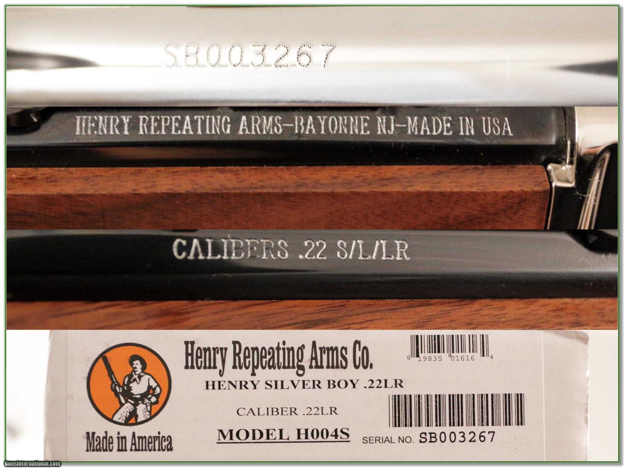 Description: This is a new and unfired Henry Silver Boy in 22LR. It comes as shown with original box and papers. It will make a fine addition to your collection. I am selling this one on consignment and as such lay-a-way can’t be used. It does of course have the standard 3 day inspection. Shipping and insurance is $35 or $15 more if you want it shipped in a new Plano hard case. Please email me with any questions or larger pictures. (I now consign quality firearms only 10%! Let me know if you have any you would like to sell!) [16-0885] Payment: Payment is by Money Order, Cashiers Check or Personal Check. I can now also accept MasterCard and Visa with a 3% convenience fee. PayPal can be used for some items but never firearms. Please let us know if you would like to pay via PayPal. Shipping: The shipping charge will be listed in each description. It is $35 for most guns. Some heavy guns or those insured for over $2000 will be higher. Shipments to Alaska and Hawaii are higher because air shipment is required. Most firearms are shipped within 5 days of receipt of payment. We prefer shipping at the beginning of the week to avoid firearms in transit over weekends. We package all shipments carefully and insure them for the full purchase price, rounded up to the next $100. In the unlikely event that damage occurs, it is important that you save all packaging material for the claims process. Optics are shipped Priority Mail and most other non-firearm shipments are shipped First Class. Returns: Our return policy is simple. If for any reason you are not pleased with your purchase, you may return your item for a refund. The only exception is ammunition, it cannot be returned. It is important to us that you are happy. Guns cannot be fired or dissembled before returning them and must be returned in the same condition as received. Notification of a return must occur with-in 3 days of receipt at your dealer. Shipping, convenience and dealer fees are not refundable and are the responsibility of the buyer. Lay-a-way: If needed, we offer a 60 day lay-a-way option on most firearms. It is 1/3 now, 1/3 in 30 days and 1/3 in 60 days. Lay-a-way firearm sales are final. Consigning your firearms with Shooting Investments: We will help you get top dollar for your firearms. While most local guns shops charge 20% or more, our fee is only 10% with a minimum of $50. At your local gun shop it might take months to sell. Selling on-line provides instant access to thousands of interested buyers. You won’t find any other on-line dealer willing to sell your firearms for only 10% or listing every gun on 4 separate s. Selling through an House typically costs the seller 15% and the buyer an addition 15% (so 30%) and you have to wait several months to sell and longer to receive funds. If properly priced, we will sell your firearms in a week or two. Send us an email or give us a call and we’ll explain how easy it is for you to get top dollar. Trading: We collect guns and usually just trade for guns we want to add to our collections. We often sell guns for others wanting to purchase one of ours. We find this the most fair to both of us. Our Commission is only 10% and we hold the gun you want until yours sells. Please contact us if you want to sell one of yours to buy one of ours. Help for California Buyers: We are happy to ship to California. It is the buyer’s responsibility to make sure any item you buy is legal in your state. We are also happy to help with your purchase of a firearm from someone other than us. If you see a gun you would like to buy but the seller can’t or won’t ship to California we can help. You buy the gun and have it shipped to us. We’ll then ship it to your California dealer. The cost for this service is only $30 + shipping. Let me know if we can help! SOLD |