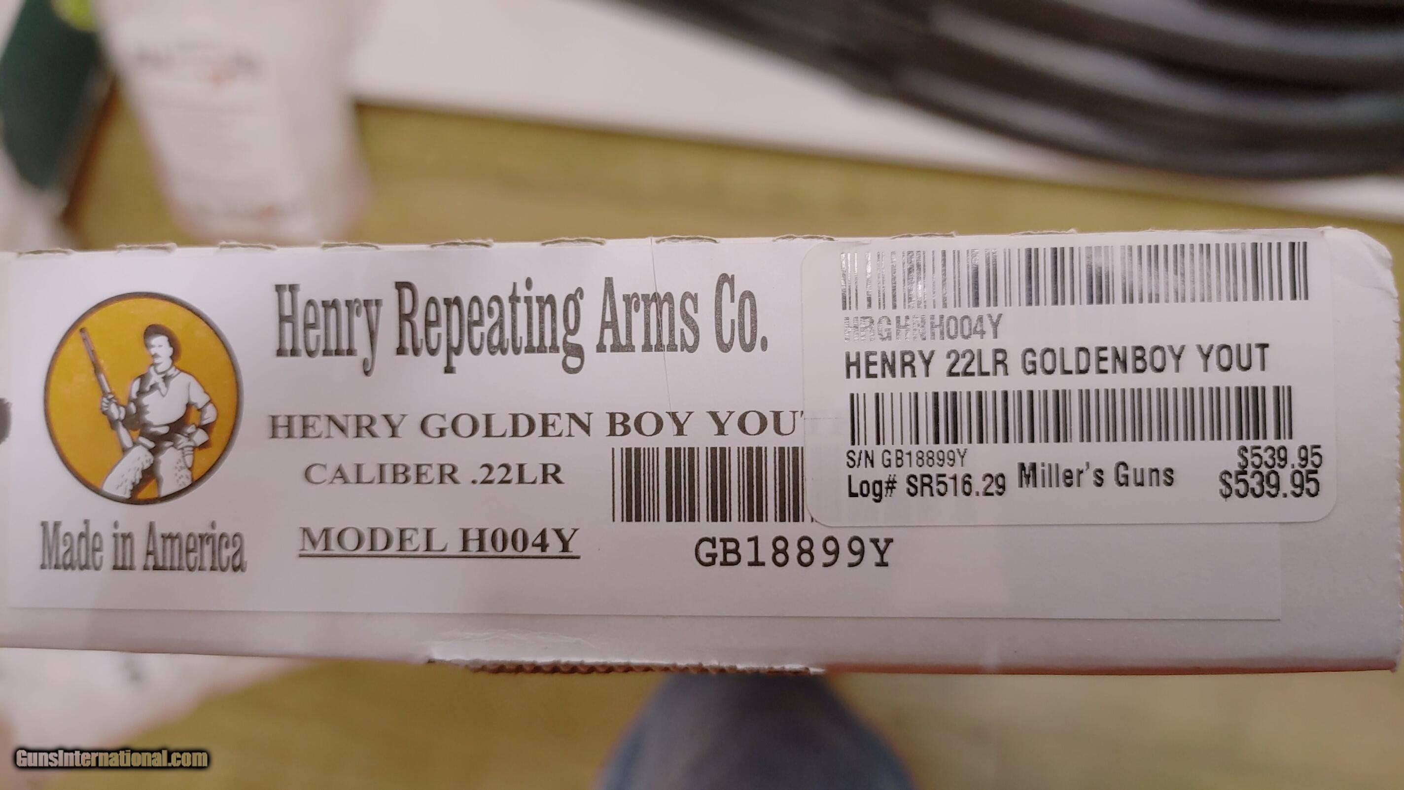 Description: New Henry Goldenboy Youth 22lr H004Y new in Box Golden Boy Youth .22 S/L/LR» Model Number H004Y Action Type Lever Action Caliber .22 S/L/LR Capacity 12 LR/16 S M.S.R. Price $605.00 Additional Specifications Barrel Length 17" Barrel Type Octagon Blued Steel Rate of Twist 1:16 Overall Length 33.75" Weight 6.00 lbs. Receiver Finish Brasslite Rear Sight Fully Adj. Semi-Buckhorn w/ Diamond Insert Front Sight Brass Bead Scopeability Drilled and Tapped Scope Mount Type GB-CSM Stock Material American Walnut Buttplate/Pad Brass Length of Pull 13" Safety 1/4 Cock Best Uses Target/Hunting/Collector Embellishments/Extras N/A Buyer pays shipping Millers Gun Center Located in New Castle, Delaware "Home of TAX-Free shopping" No Credit Card Fees SOLD Serial Number: GB18899Y |