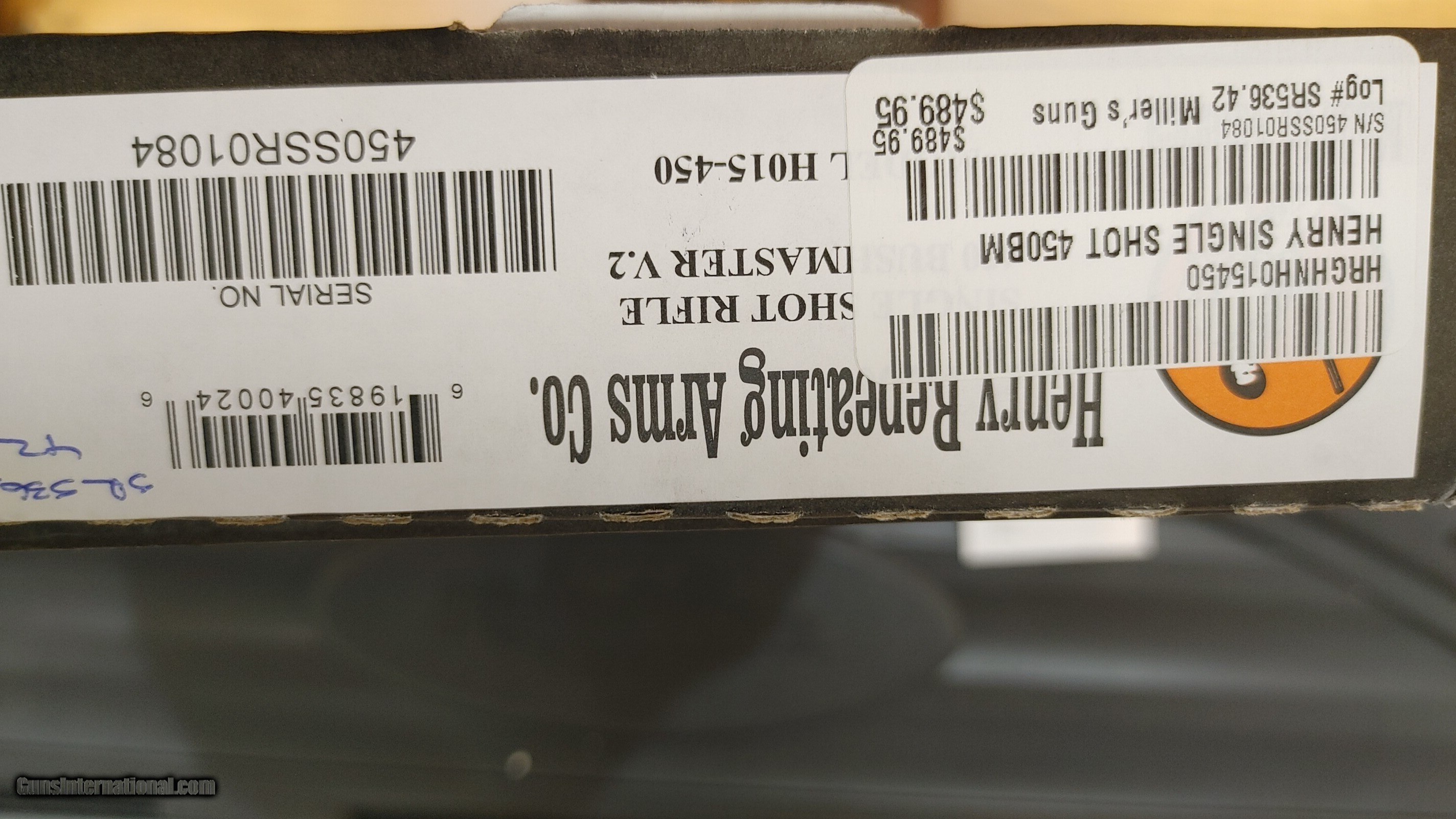 Description: New HENRY SINGLESHOT 450BM BL/WD 22" barrel SKU H015-450 new in box (MODEL:HENRY SINGLESHOT RIFLE); (ACTION:SINGLE SHOT); (BARREL LENGTH:22); (OVERALLLENGTH:37.5); (SIGHTS:FOLD LEAF REAR/BRASS BEAD FRNT); (STOCKFRAMEGRIPS:WOOD STOCK AMERICAN WALNUT); (DRILL-TAPPED:TRUE); (CAPACITY:1); (WEIGHT:6.73 LBS); (RIFLE:RIFLE) Buyer pays shipping Millers Gun Center Located in New Castle, Delaware "Home of TAX-Free shopping" No Credit Card Fees SOLD Serial Number: 450SSR01084 |