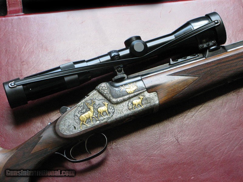 Description: Wow! This pinless sidelock was custom made in 1981 for a US customer, a tour-de-force by Heym in (scoped) 30-06 DR ejectors, 28"x20gax3" O/U ejectors IM/M, and 20ga/270 (scoped) extractors IM, also with 3 leaf express sights. Scopes are 1.5-6x Nickel w covers and post/xhair reticles in engraved claw mounts. Everything is engraved, to a very high standard, with numerous gold game inlays, and it is all as new. Dimensions (as shotgun) LOP 14, drops 1 3/8" and 2", weight 7lb 5 oz. Cased in its fitted leather-bound trunk case with papers (receipt, factory certificates of regulation, and numerous actual regulation targets for standard Rem ammo). This is a money-is-no-object all-round hunting ensemble that would cost as much as a house to replicate. Price: $34,500.00 Contact Seller |